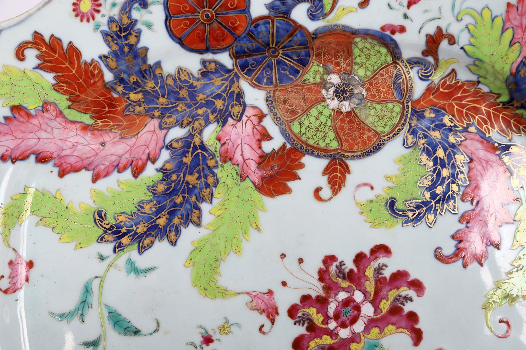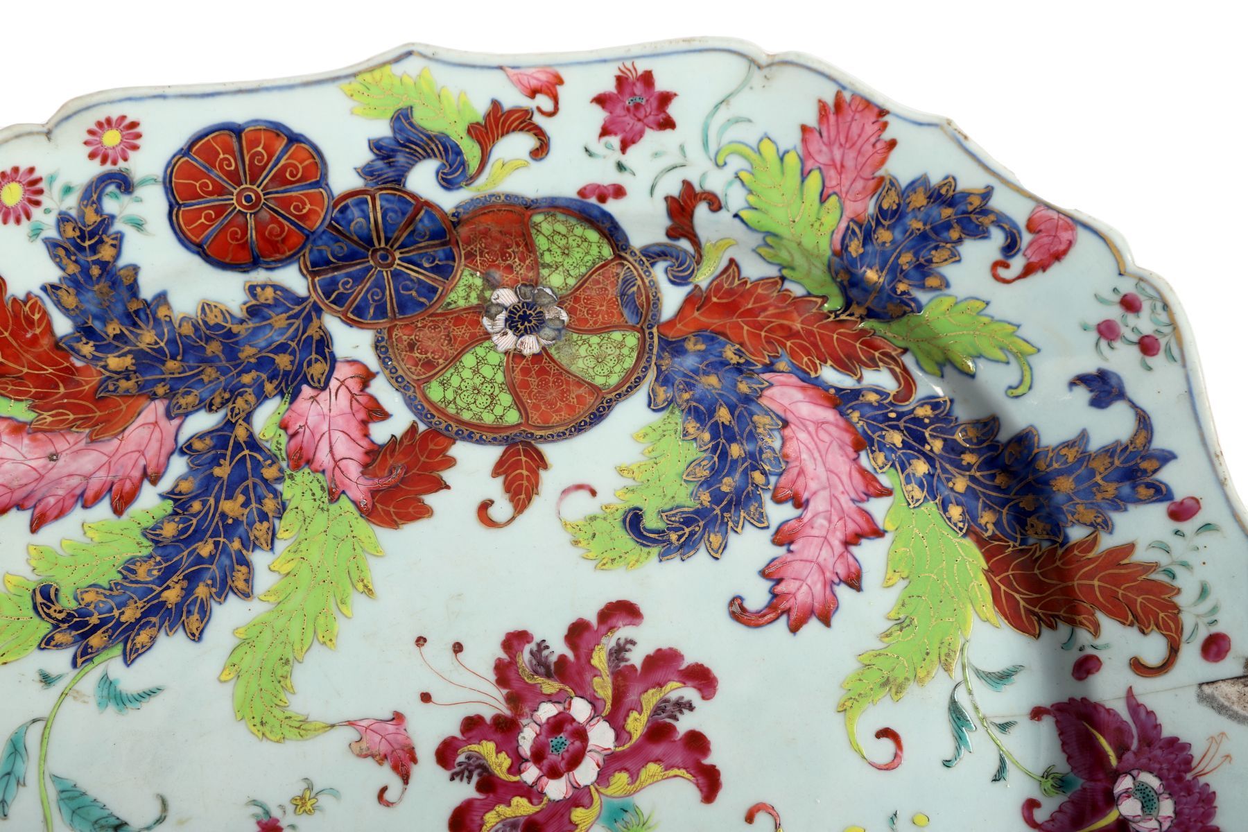 Of shaped rectangular form, richly decorated in polychrome enamels and gilt with flowering plants, leaves, and scrolling foliage on a pale celadon ground.