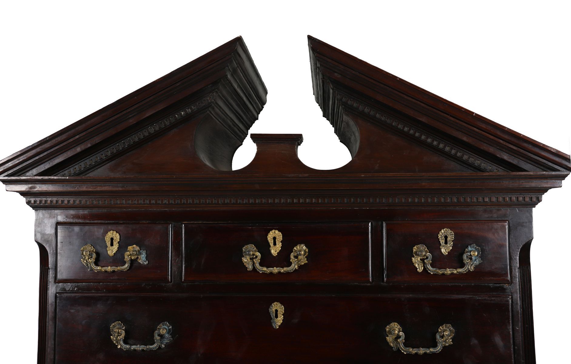 An impressive 18th-century Chippendale period mahogany chest-on-chest, the upper section with a broken-arch pediment and blind fretwork frieze above two short and six long drawers with brass handles, fluted pilasters, and shaped apron.