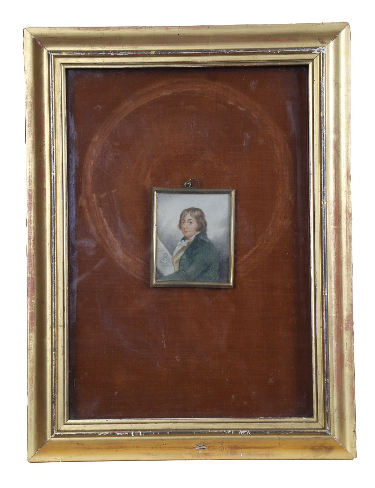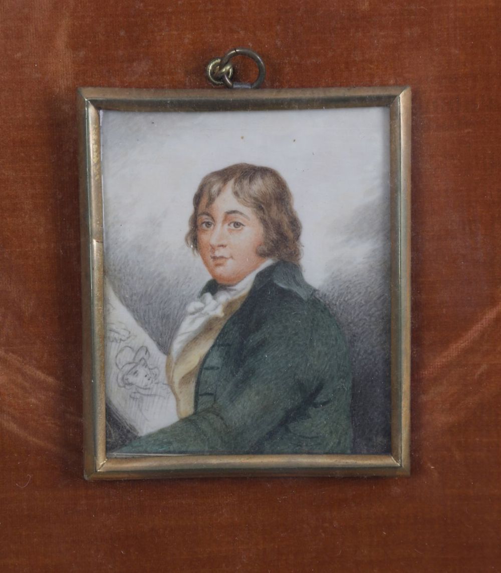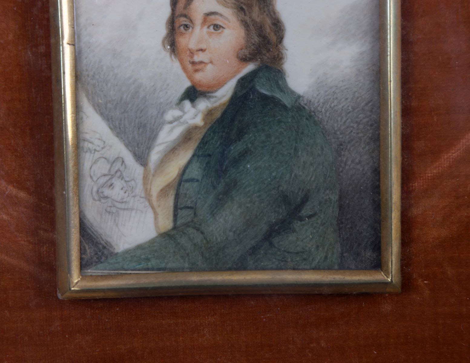 A finely painted oval miniature portrait depicting a young gentleman shown three-quarter length, turned slightly to dexter, holding a rolled sheet of paper with faint sketched figures visible. He wears a dark green coat over a pale waistcoat and white cravat, his light brown hair falling softly about the ears in the fashion of the early 19th century. The background is softly shaded in grey tones, providing contrast to the warm flesh tones and careful detailing of the sitter's attire.