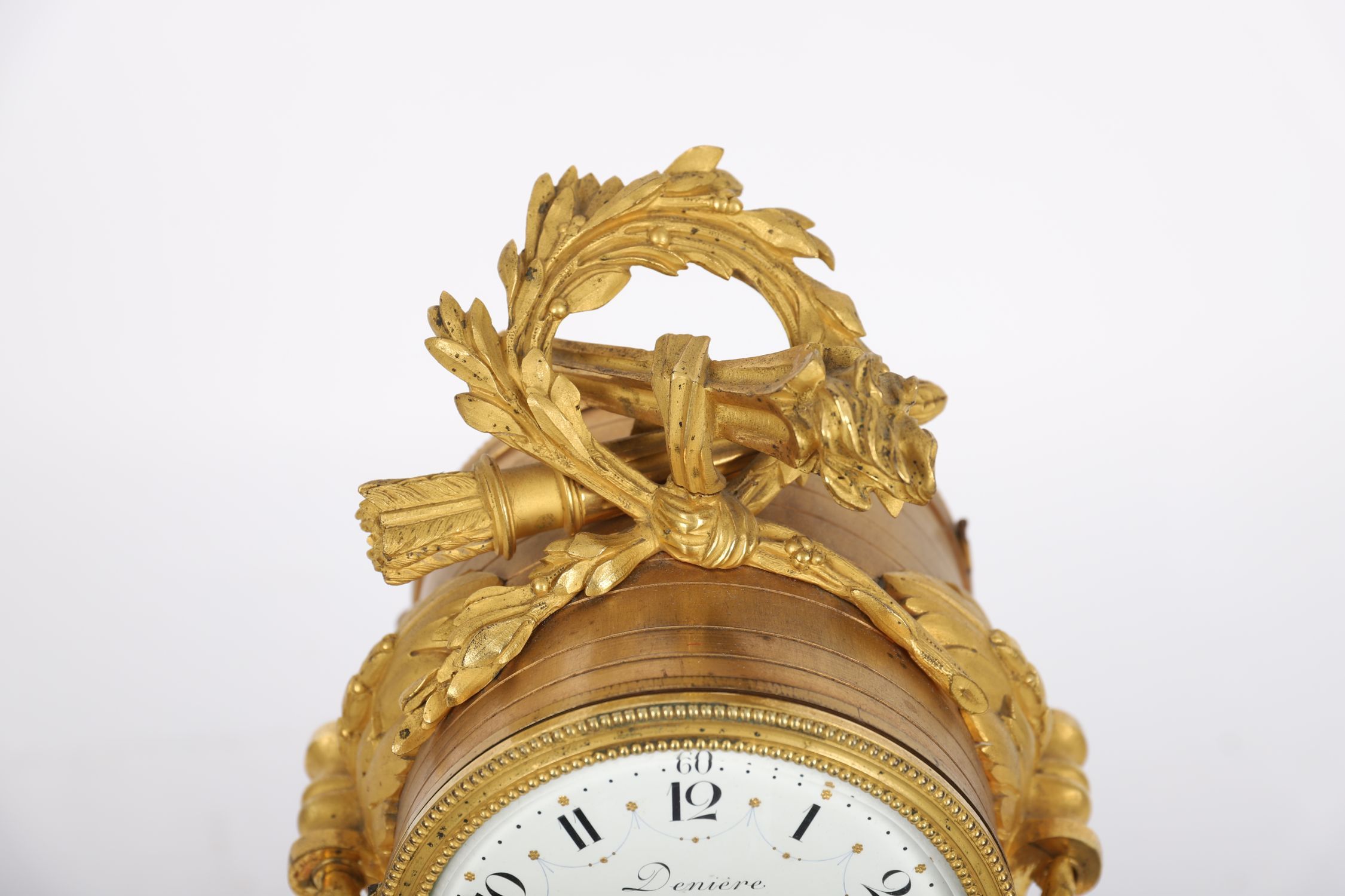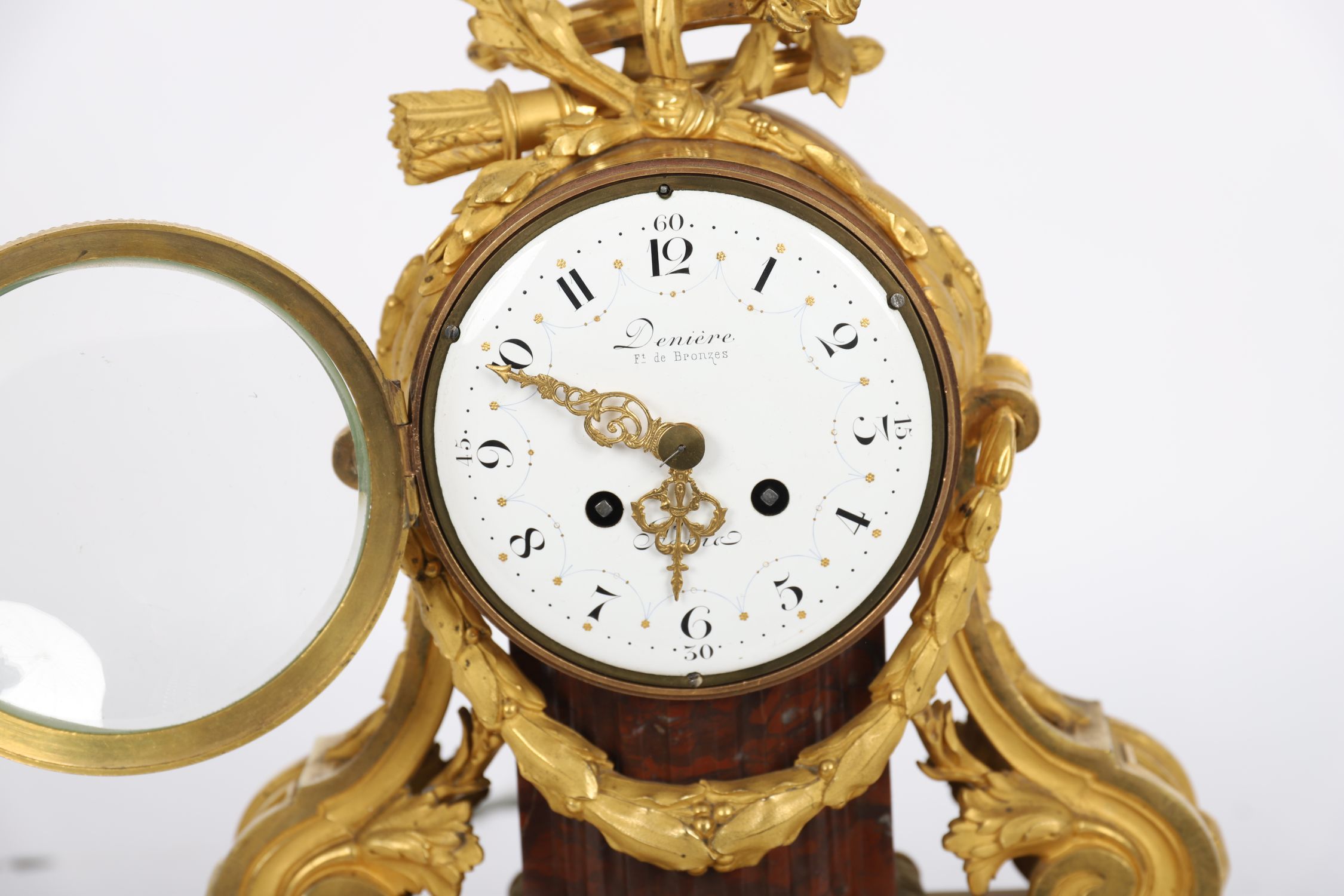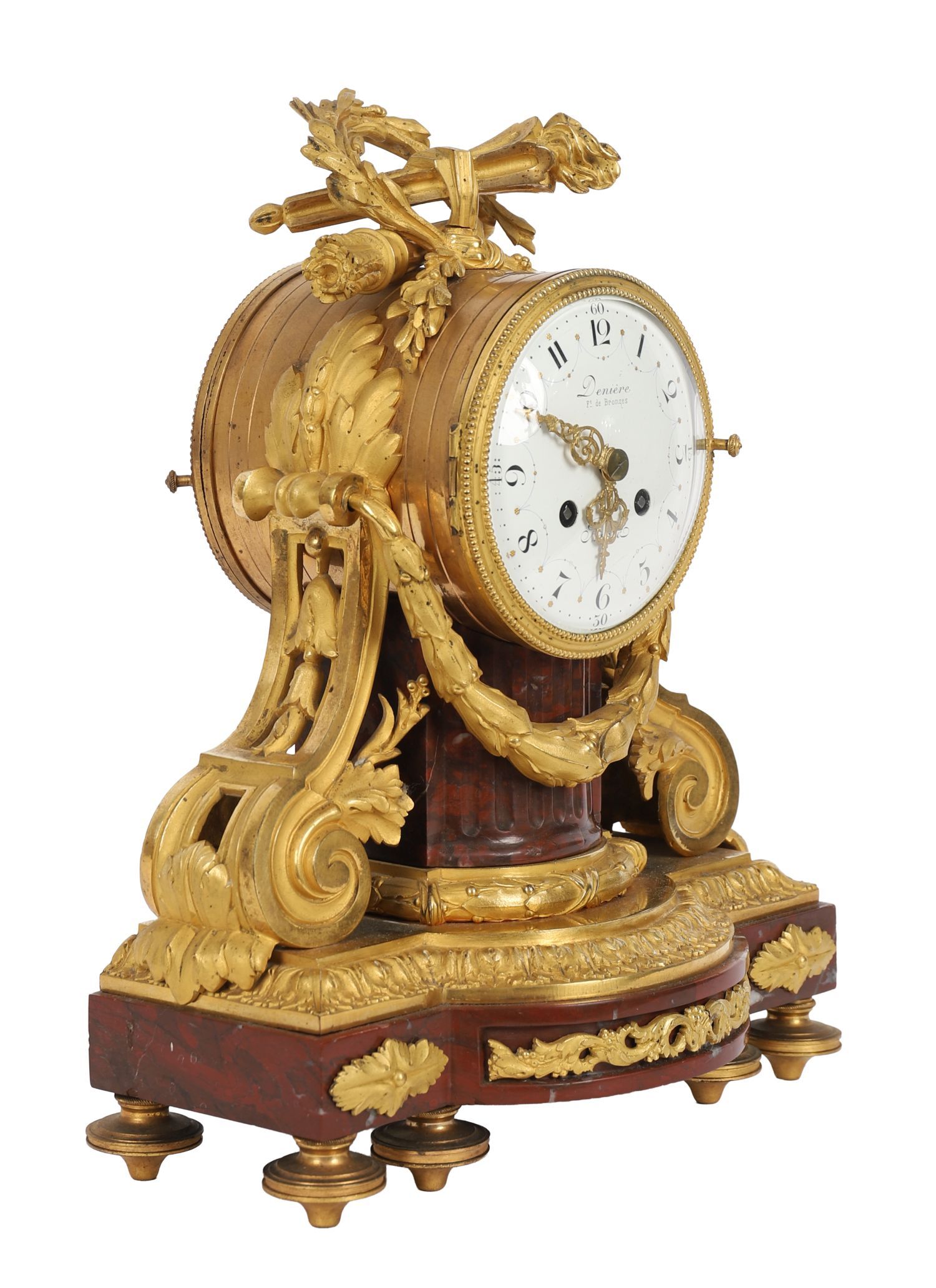 19th century French mantel clock signed Denière Ft. de Bronzes, with circular enamel dial and Roman numerals, gilt ormolu case with scrolled supports, floral garlands, and marble base with applied gilt mounts. Retains pendulum and key.