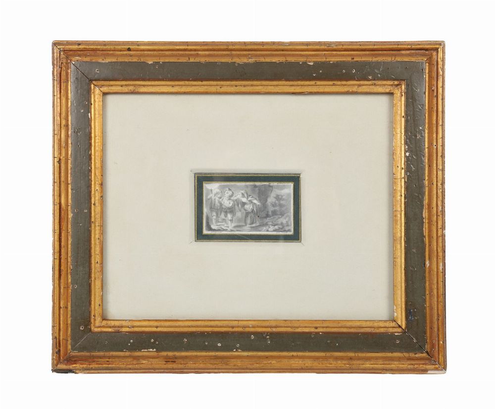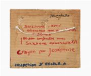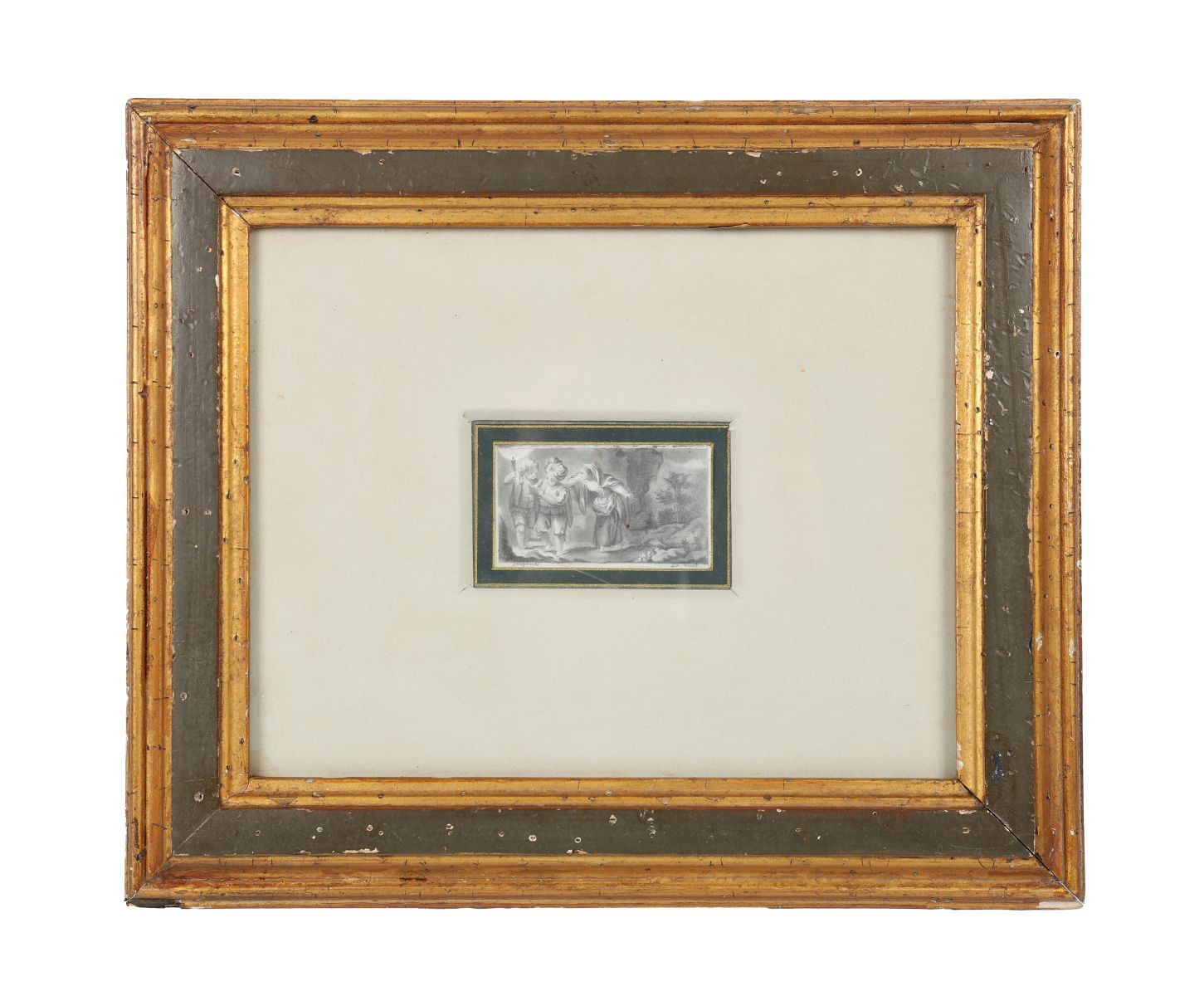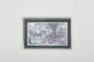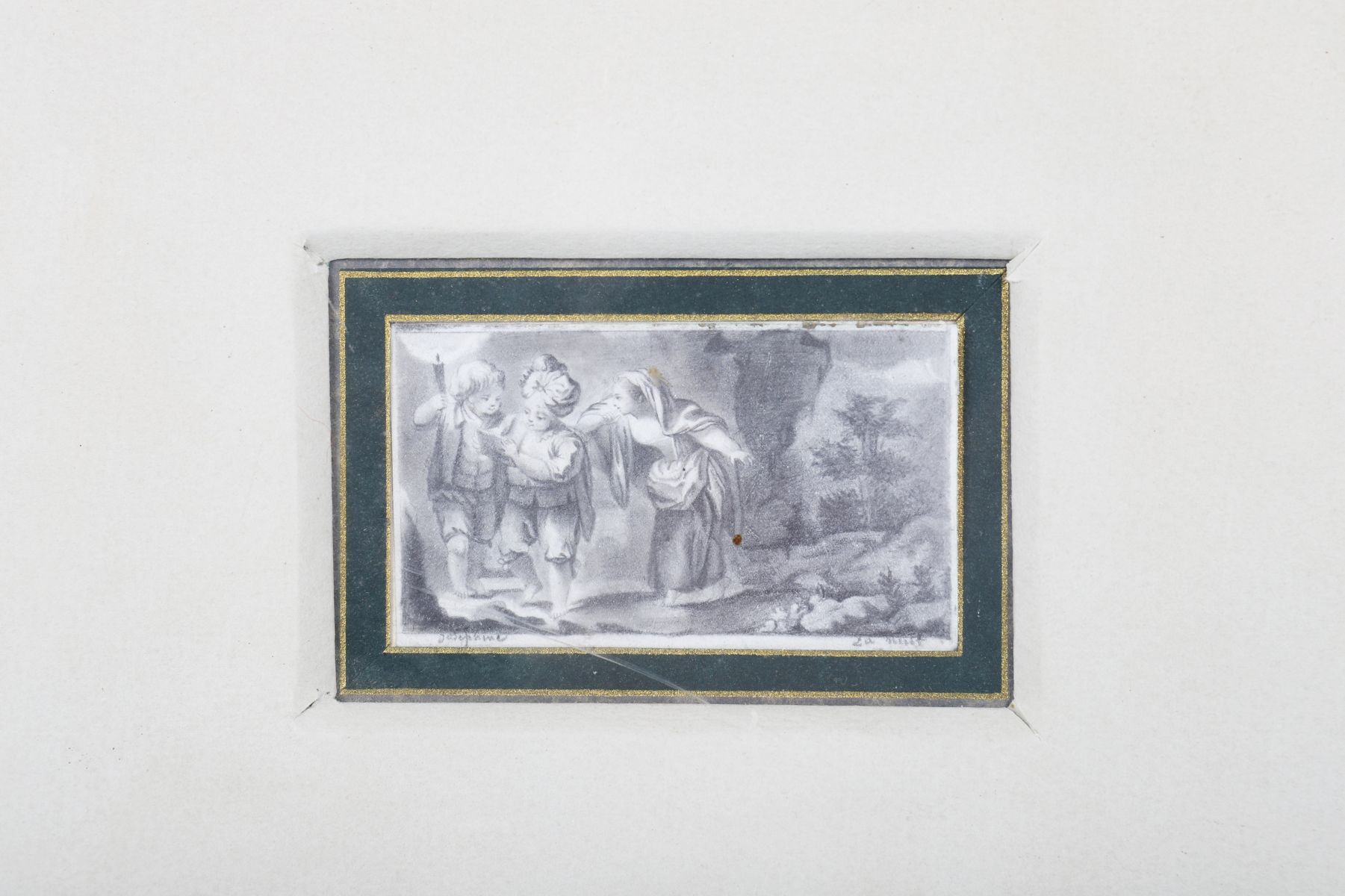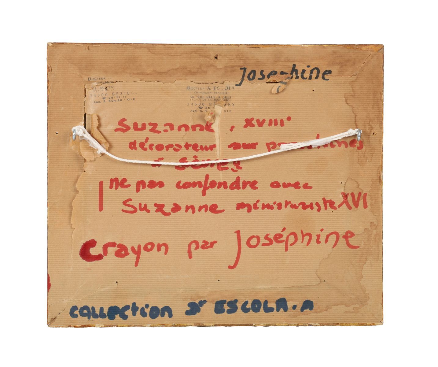 An 18th-century grisaille drawing attributed to Suzanne, a decorator at the Sèvres porcelain manufactory, depicting three figures in a rural landscape rendered in delicate monochrome tones with fine detailing. Inscribed on the reverse: “Suzanne, XVIIIe décorateur sur porcelaines à Sèvres (ne pas confondre avec Suzanne miniaturiste, XVIe)” and further noted “Crayon par Joséphine – Collection Dr. Escola.”