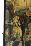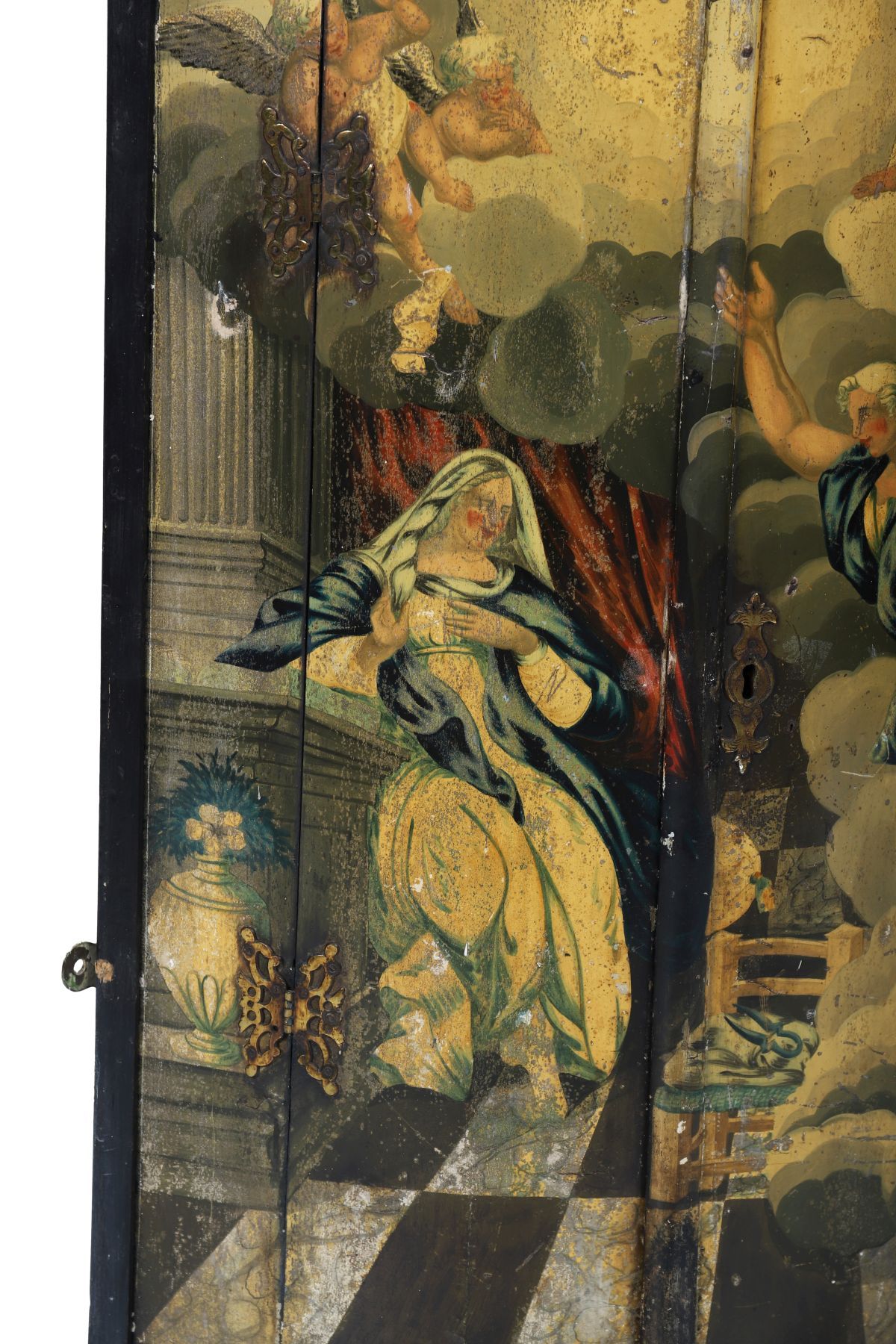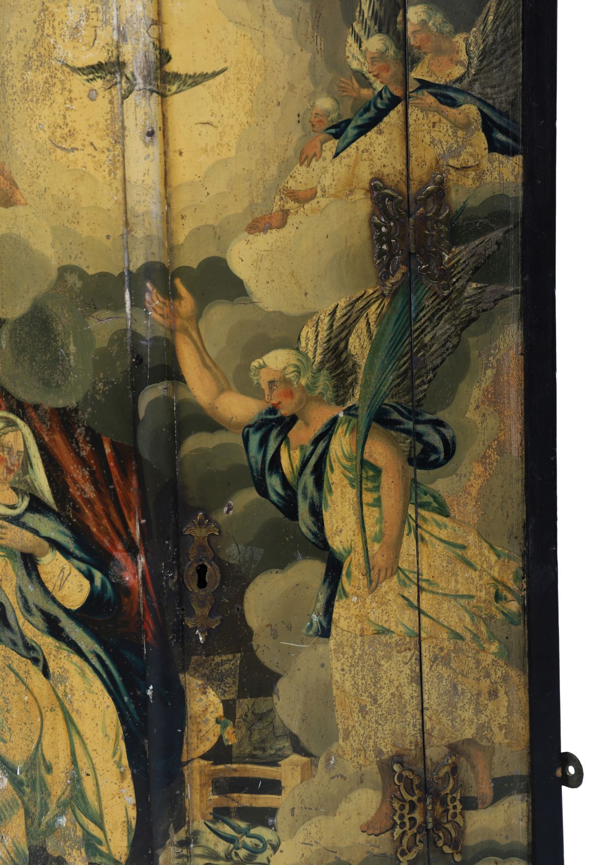 A Dutch polychrome-painted hanging corner cupboard, 18th century, probably Ameland. The bow-fronted doors vividly painted with the biblical scene of the Annunciation, depicting the Virgin Mary visited by the Archangel Gabriel (Luke 1:26–38), set against a chequered floor and cloud-filled celestial background in rich tones of yellow, green, and gold. The interior fitted with shelves.