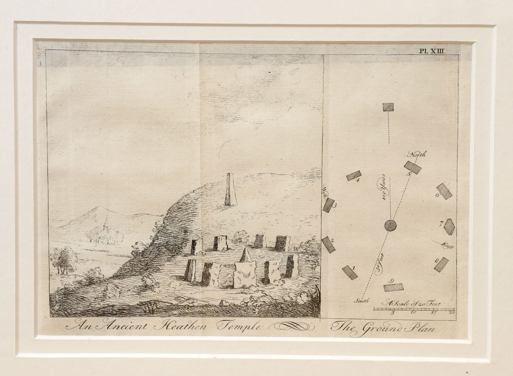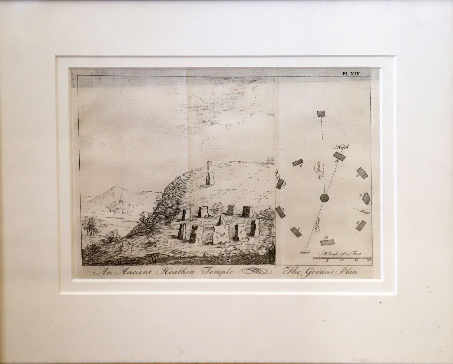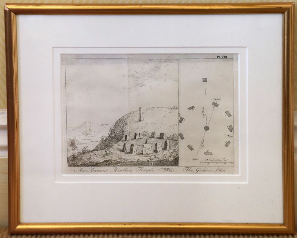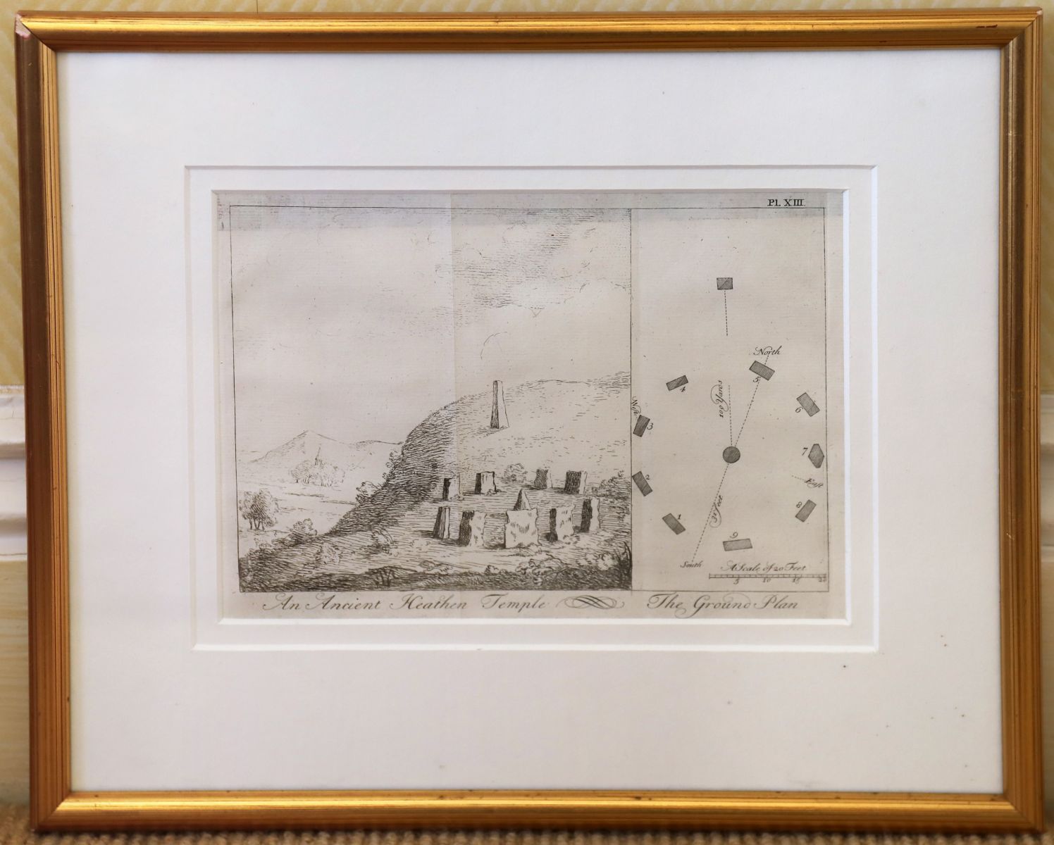 Engraving depicting a stone circle or ancient temple with accompanying ground plan, titled An Ancient Heathen Temple. Enclosed in a gilt frame.