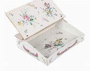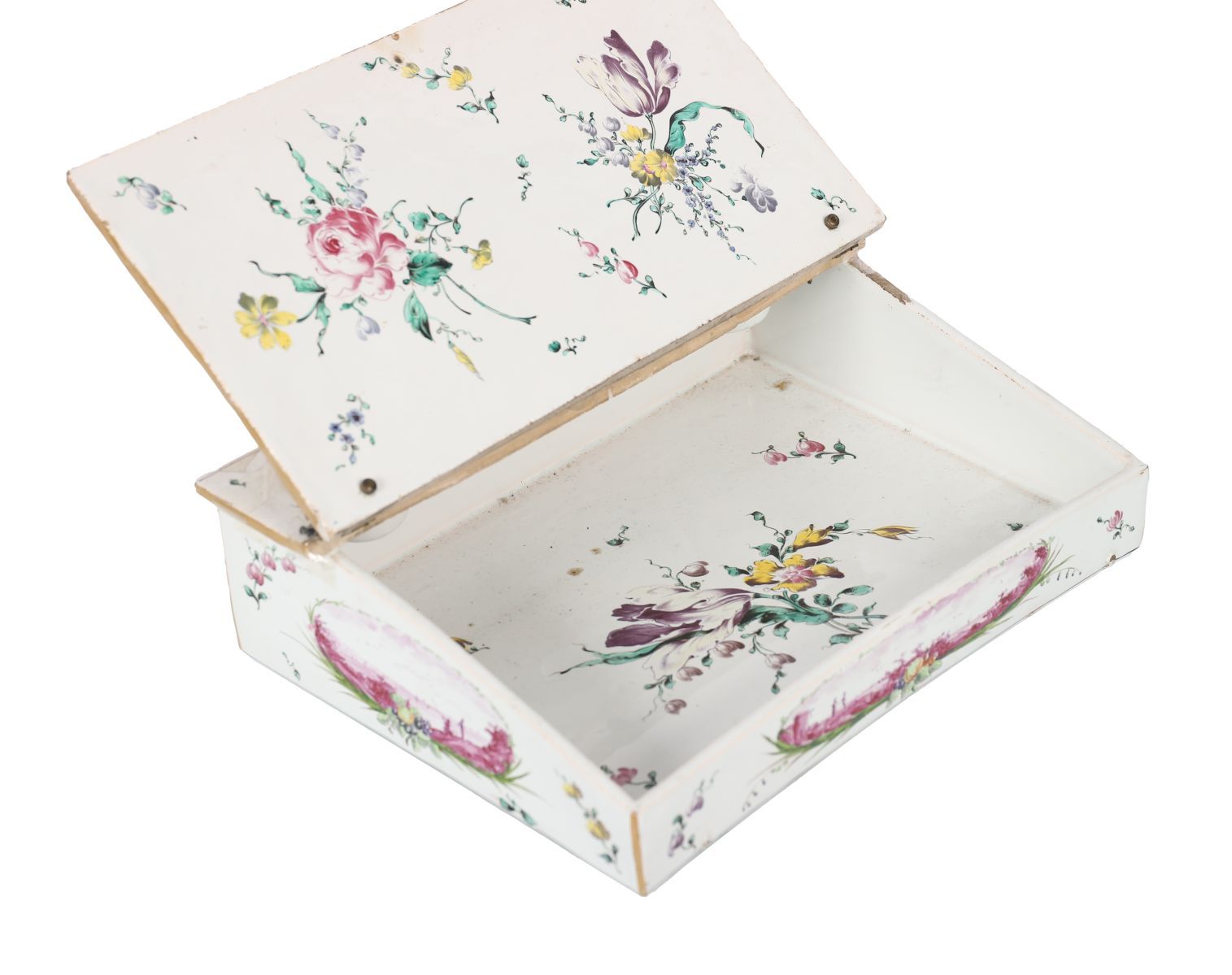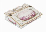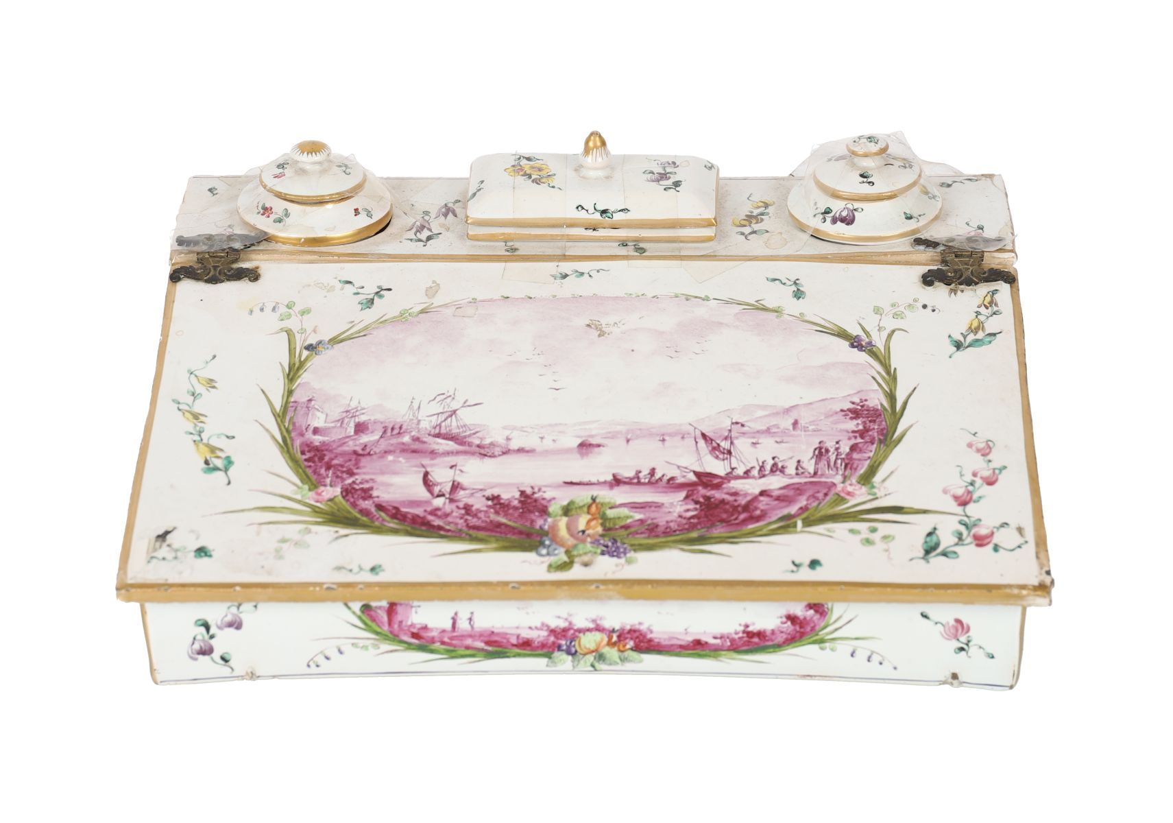 A fine 18th-century French faience inkwell of sloped rectangular form, delicately painted with floral sprays and a central mauve landscape medallion within a foliate garland. Fitted with two circular inkwells and a central lidded compartment, each with conforming decoration. The underside marked VP.