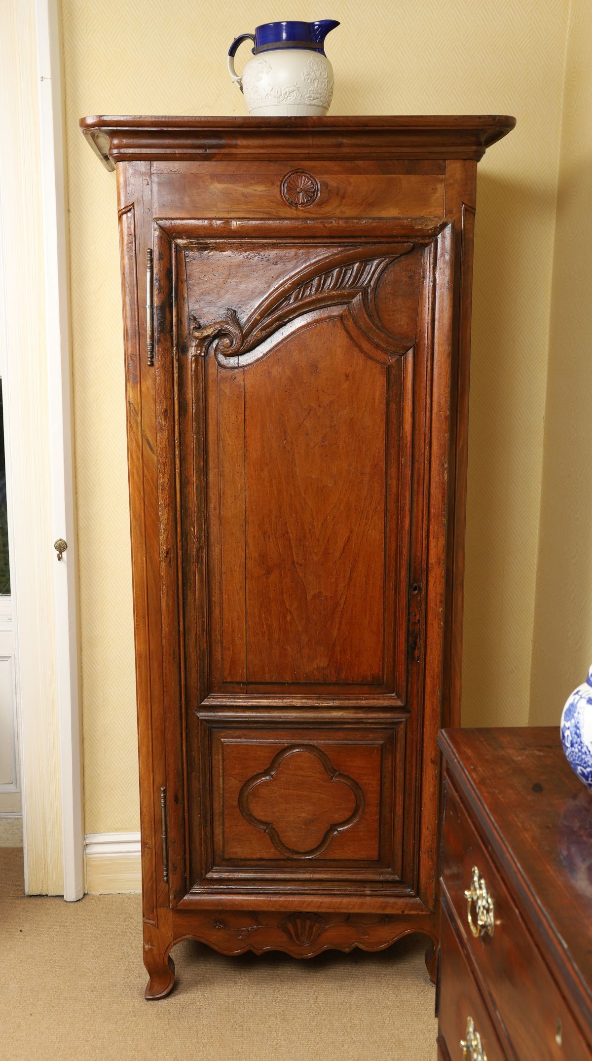 The shaped cornice above a panelled door, raised on scroll legs.
