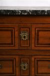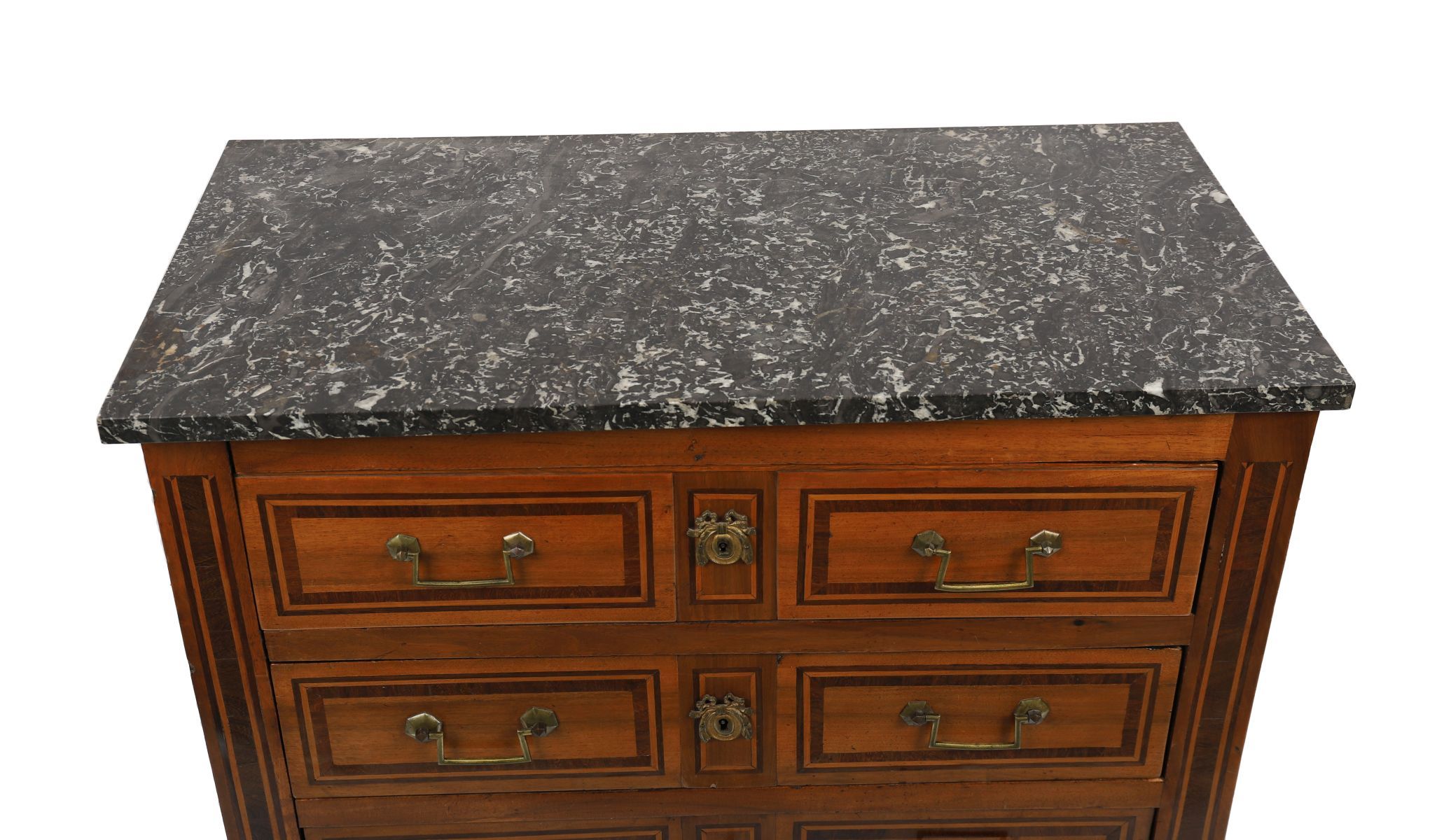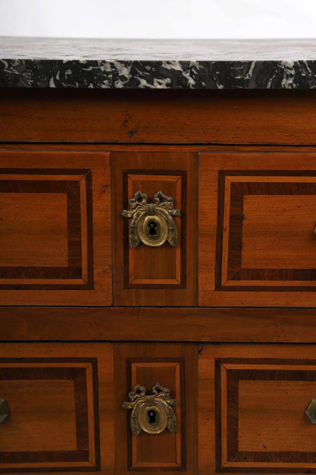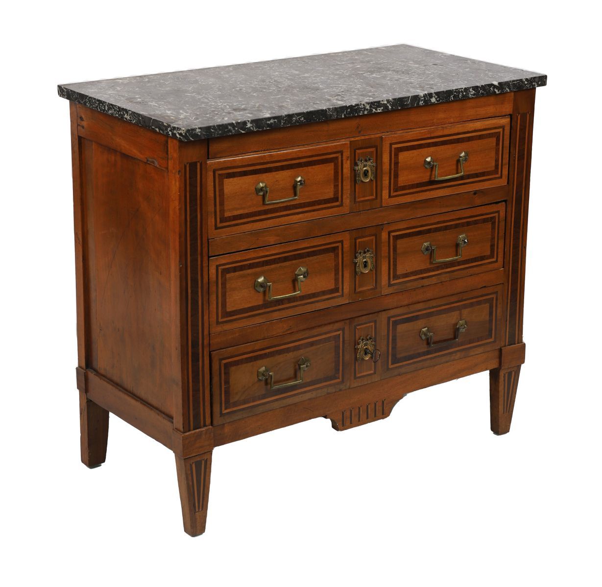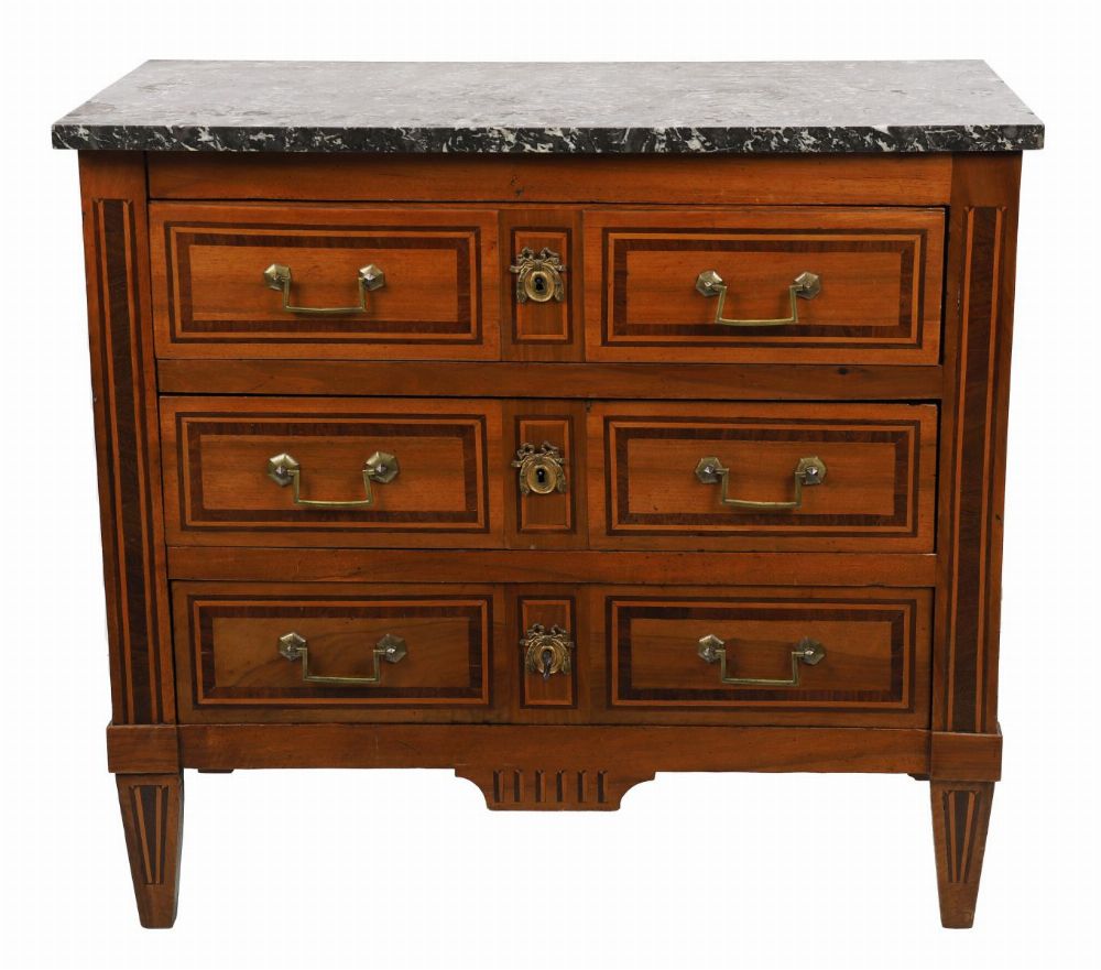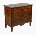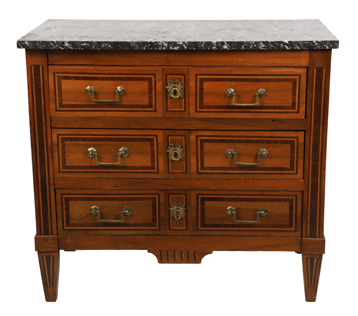 An 18th-century French walnut commode of rectangular form, fitted with a grey and white marble top, above three long drawers with geometric panelled fronts, brass handles, and key escutcheons, raised on square tapering legs.
