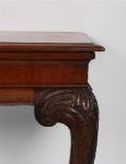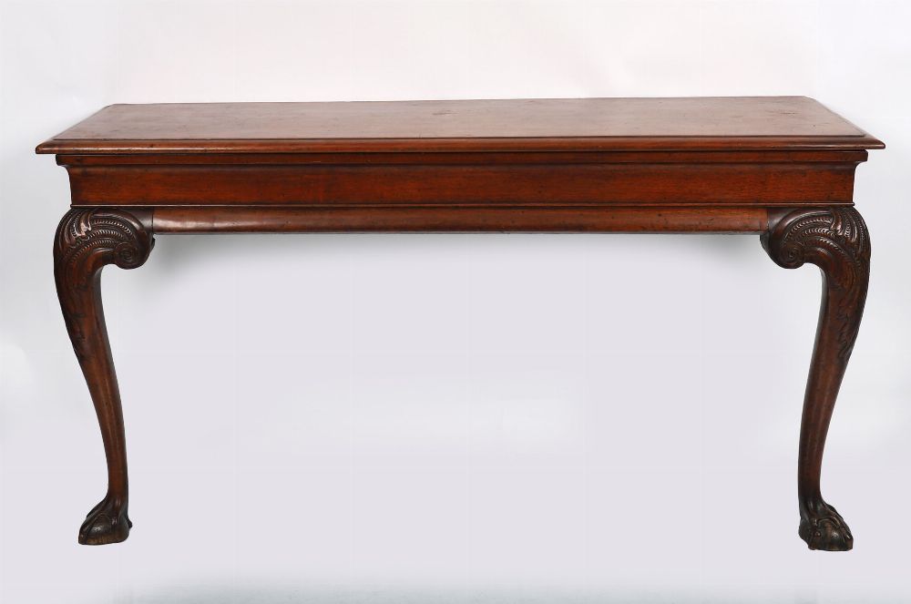A fine George III mahogany side table, the rectangular top with moulded edge above a plain frieze, raised on boldly carved cabriole legs with acanthus scrolls to the knees, terminating in claw-and-ball feet. A restrained yet elegant example of mid-18th century craftsmanship, displaying fine colour and patination.