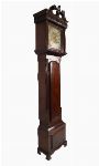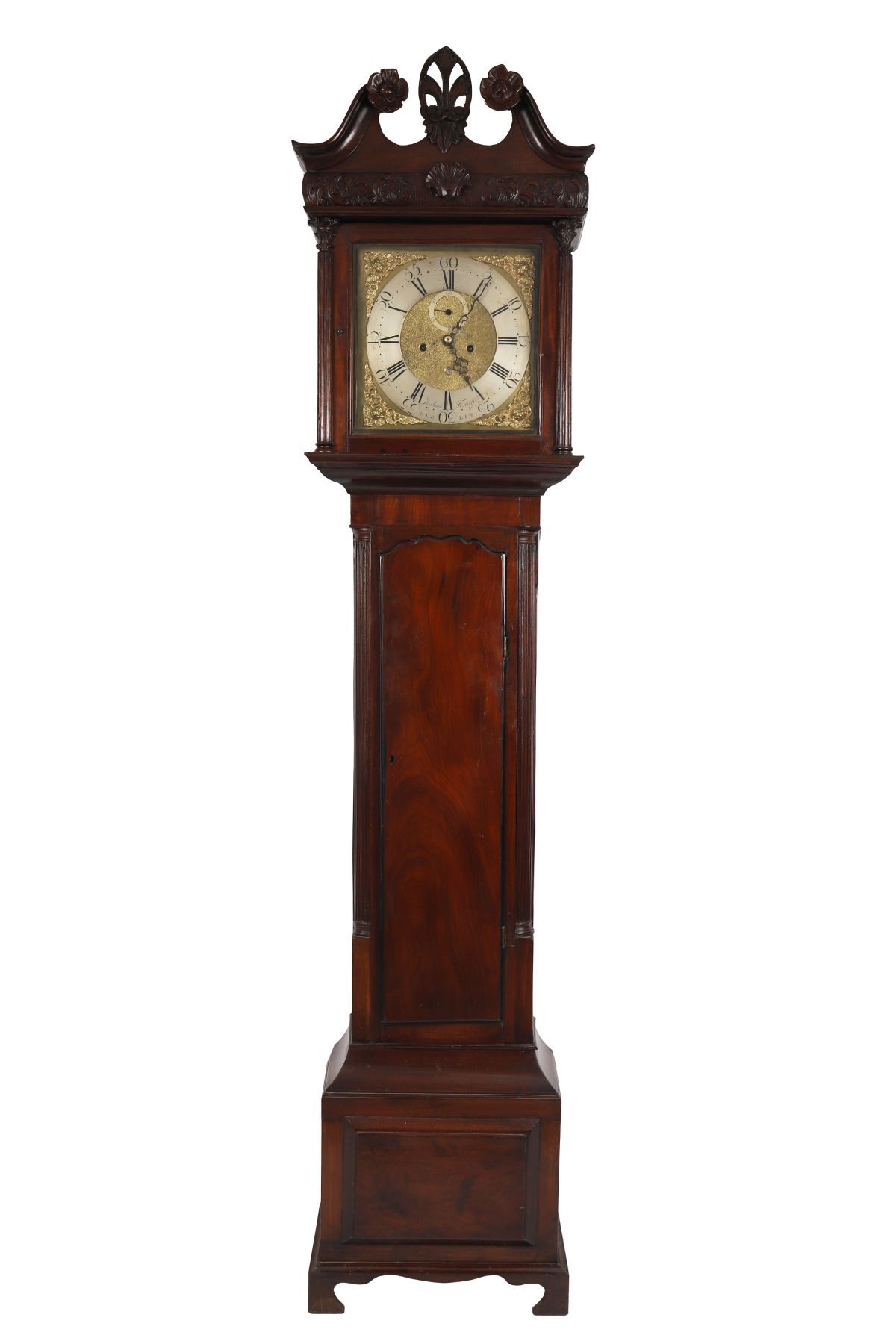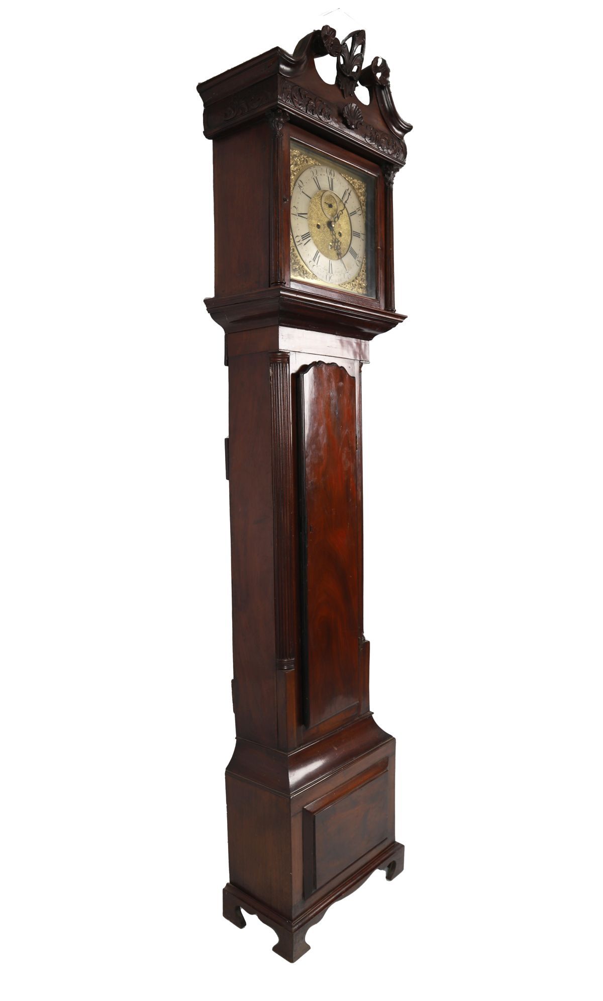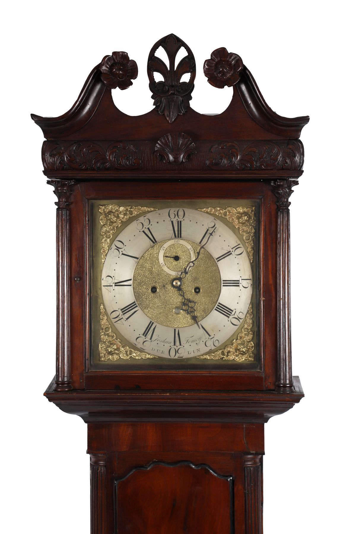 An 18th-century Irish mahogany longcase clock, the broken-arch hood with carved scroll cresting and central shell motif above fluted columns flanking a glazed door, enclosing a brass dial with silvered chapter ring, Roman numerals, subsidiary seconds dial and engraved spandrels, signed Joshua Tomsey, Dublin. The trunk with shaped door above a moulded base, raised on bracket feet.