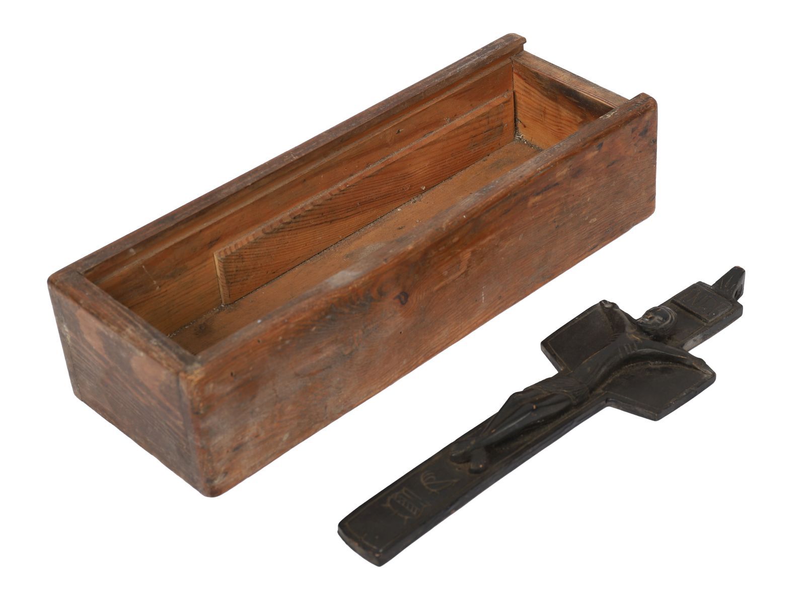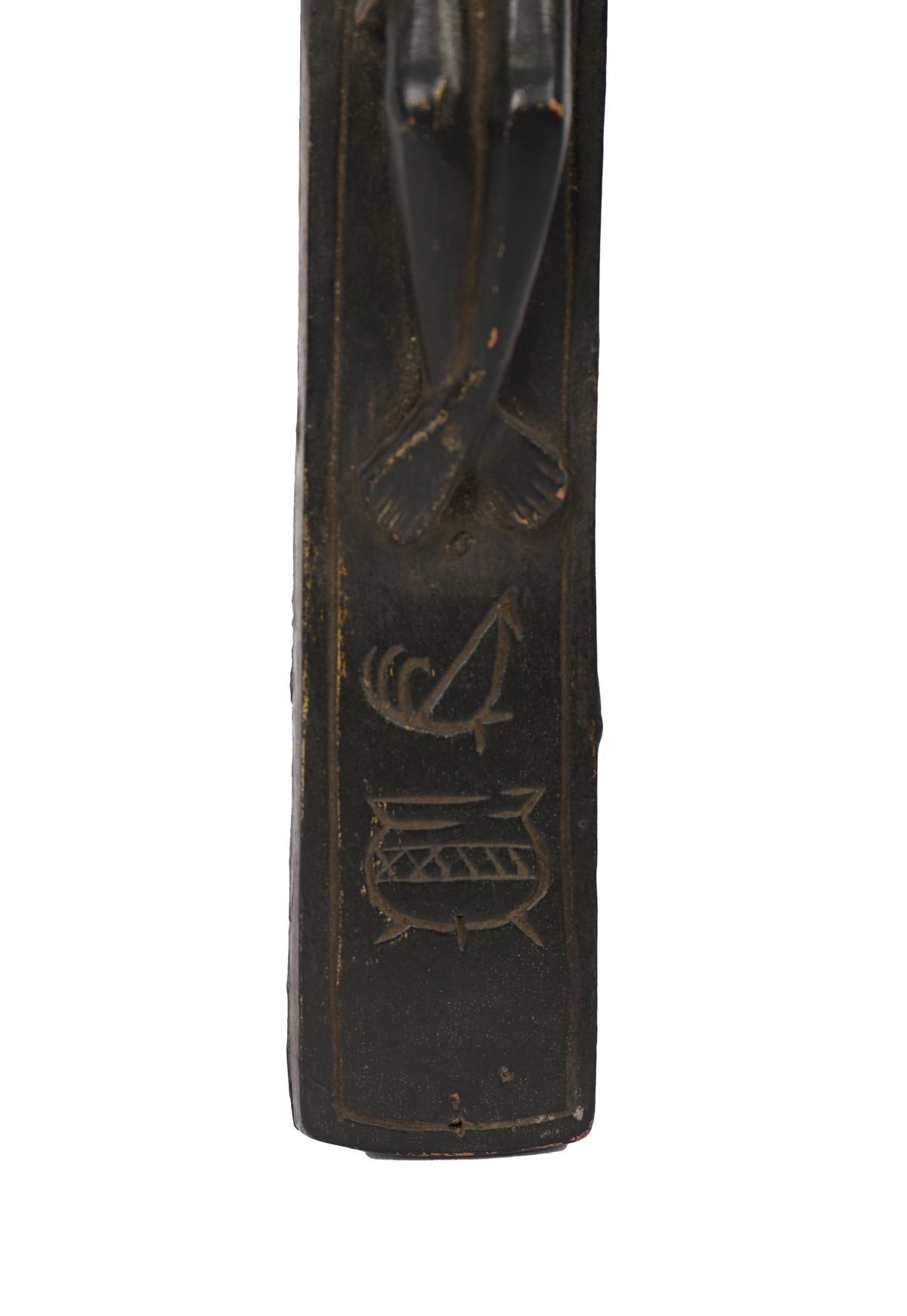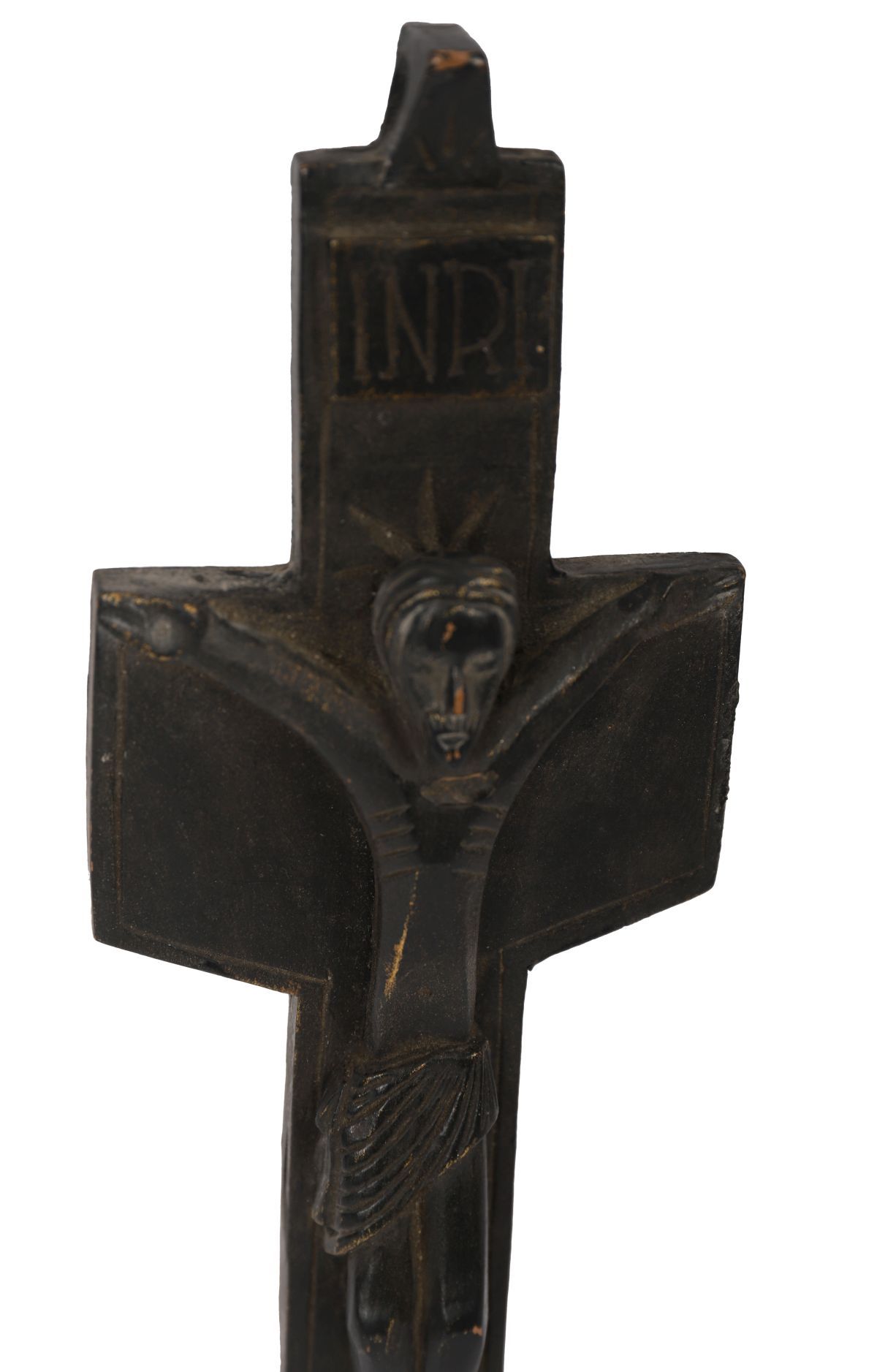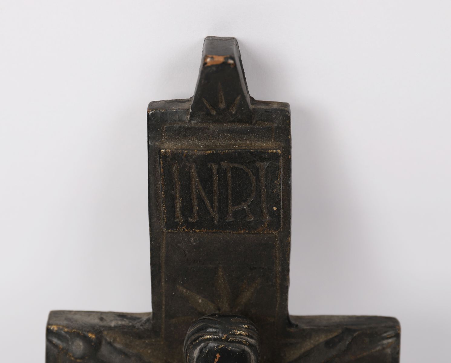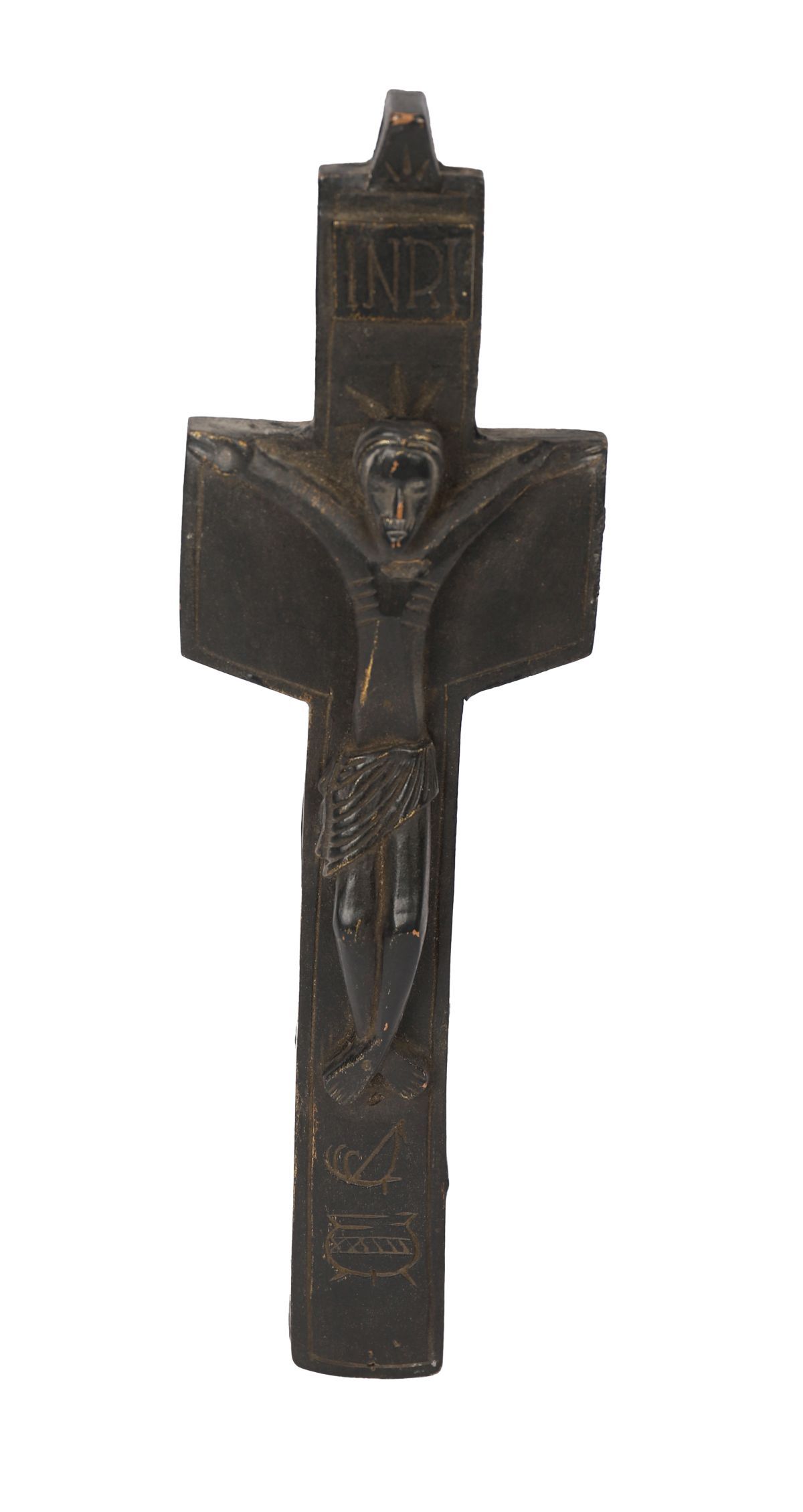 An 18th-century carved bog oak penal cross, the figure of Christ rendered in low relief with traditional Irish inscriptions and carved symbols to the shaft.
