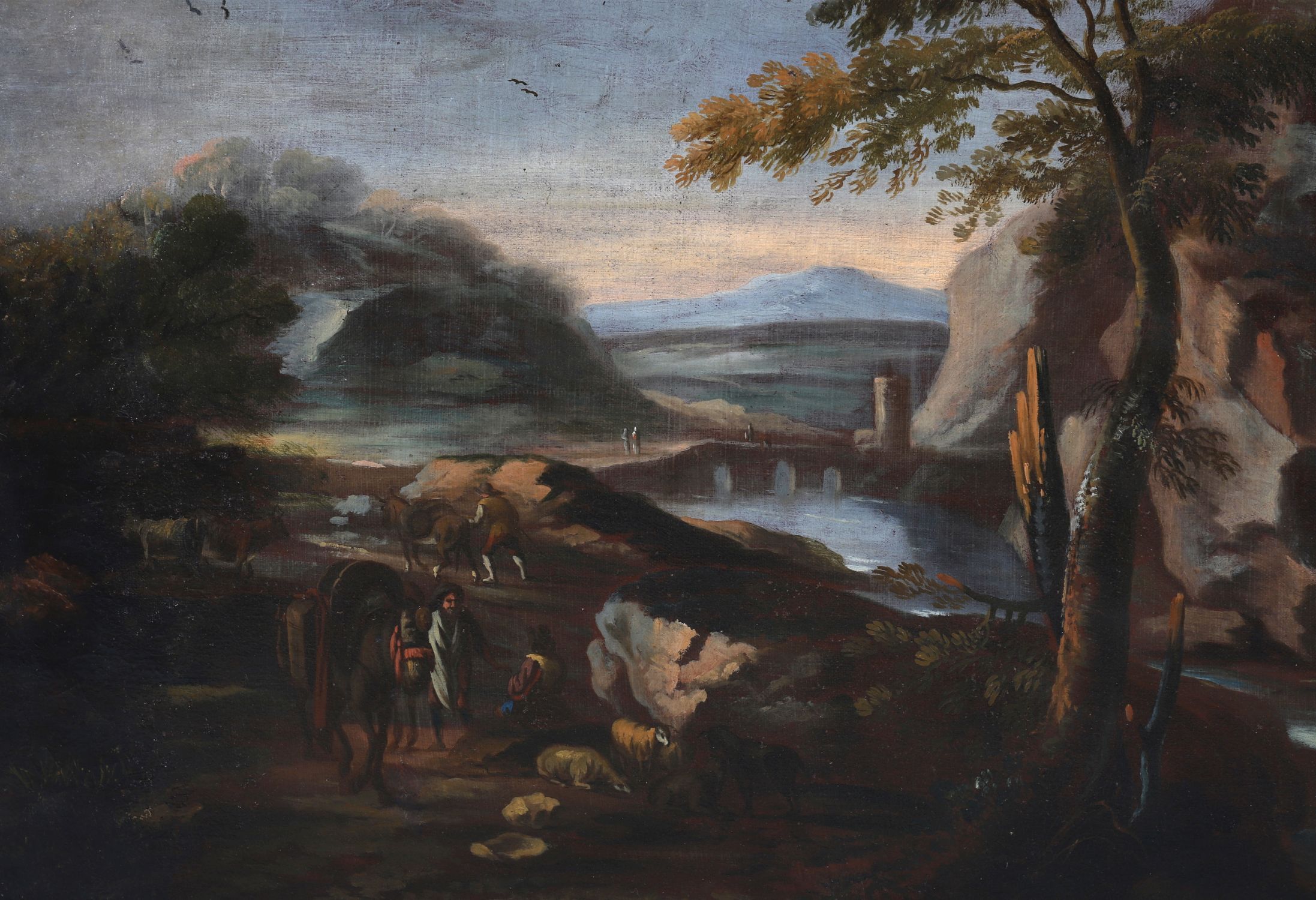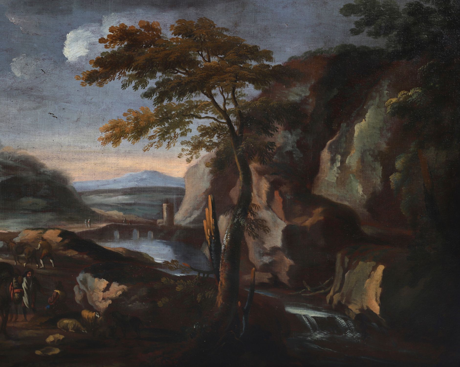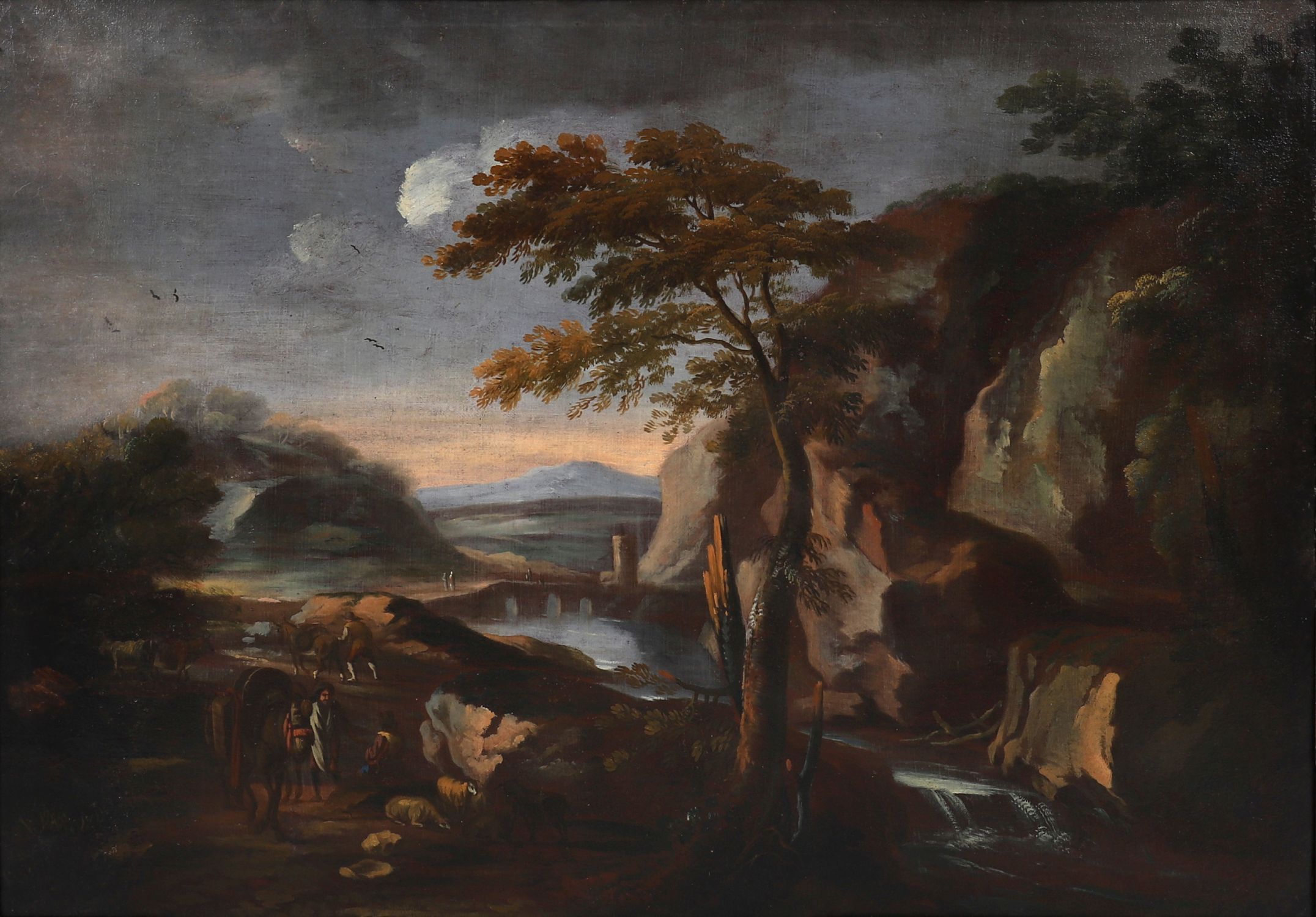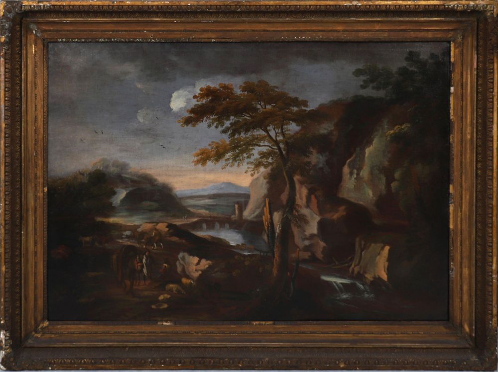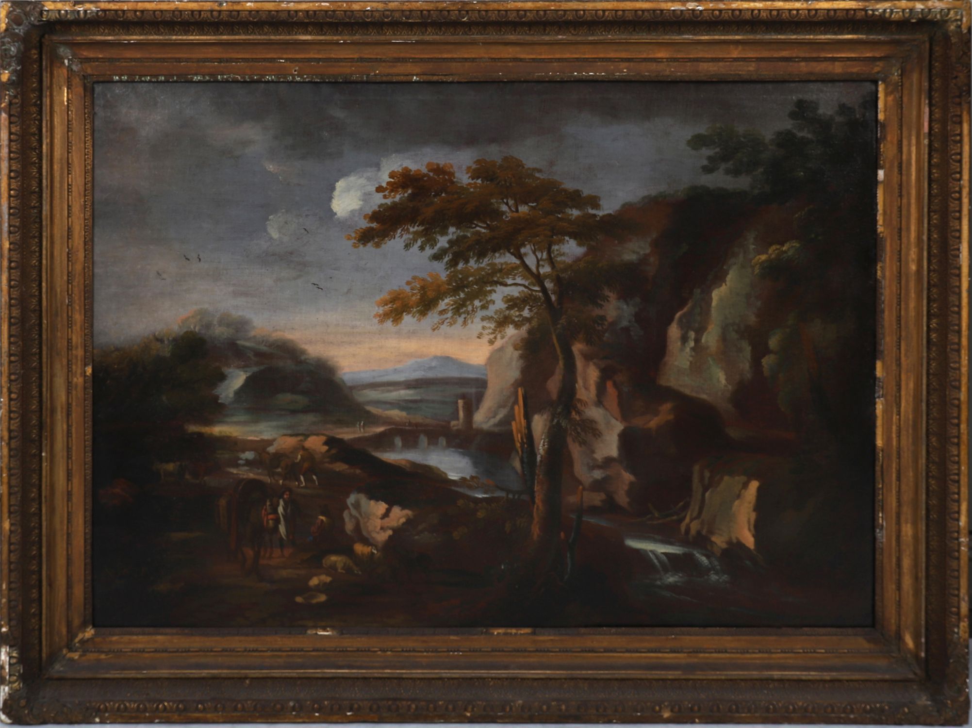 Oil on canvas depicting travellers with cattle on a river path beneath a prominent tree, rocky cliffs and waterfall beyond, with distant bridge and lakeside buildings; presented in a moulded gilt frame.