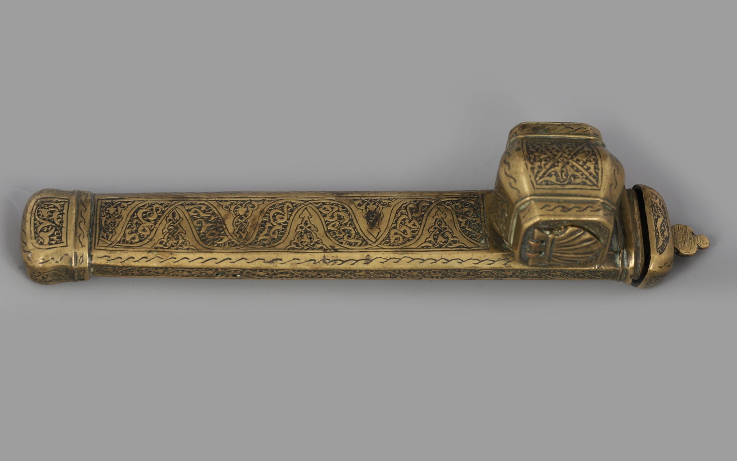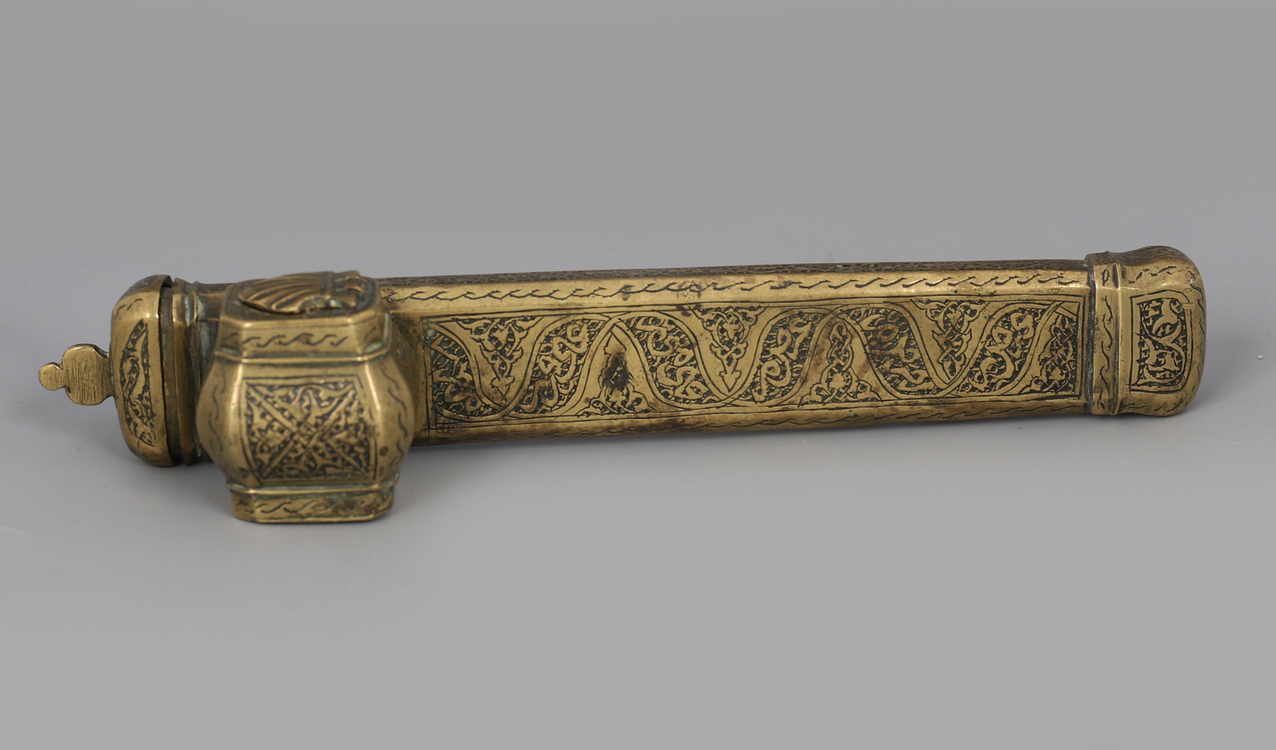 A finely engraved Islamic brass divit (scribe's case), 18th century, comprising a long tubular compartment for reed pens with an attached inkwell. The surface is richly decorated with intricate foliate and geometric motifs, highlighted with incised detail.
