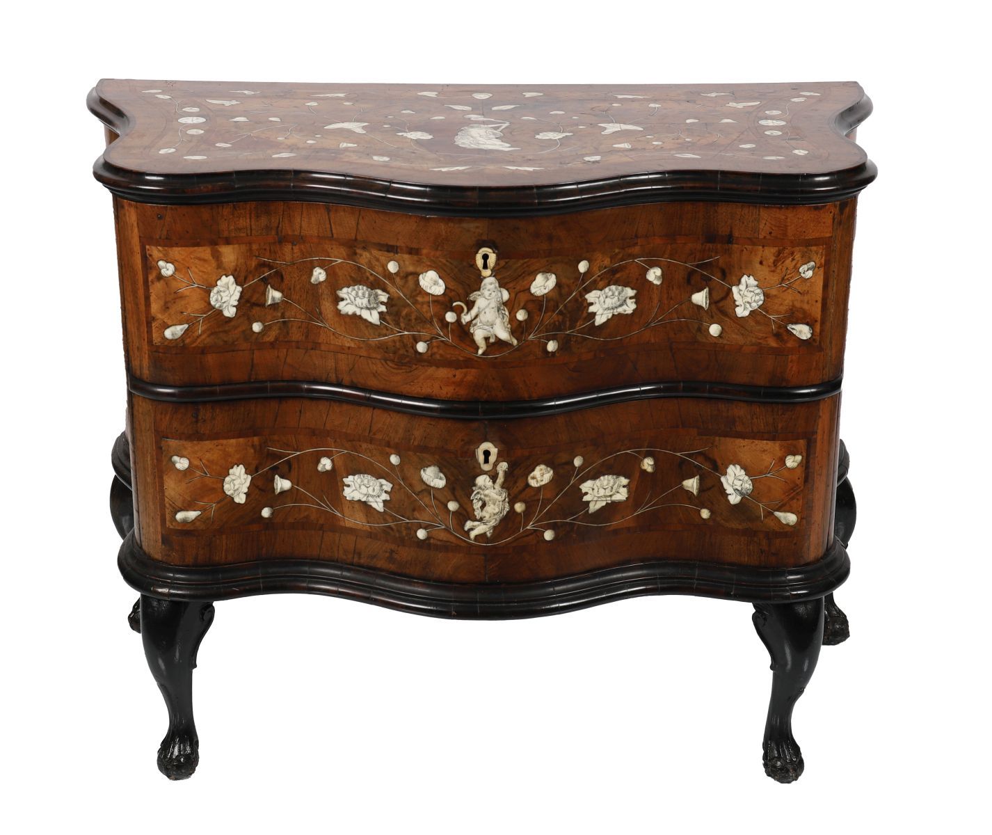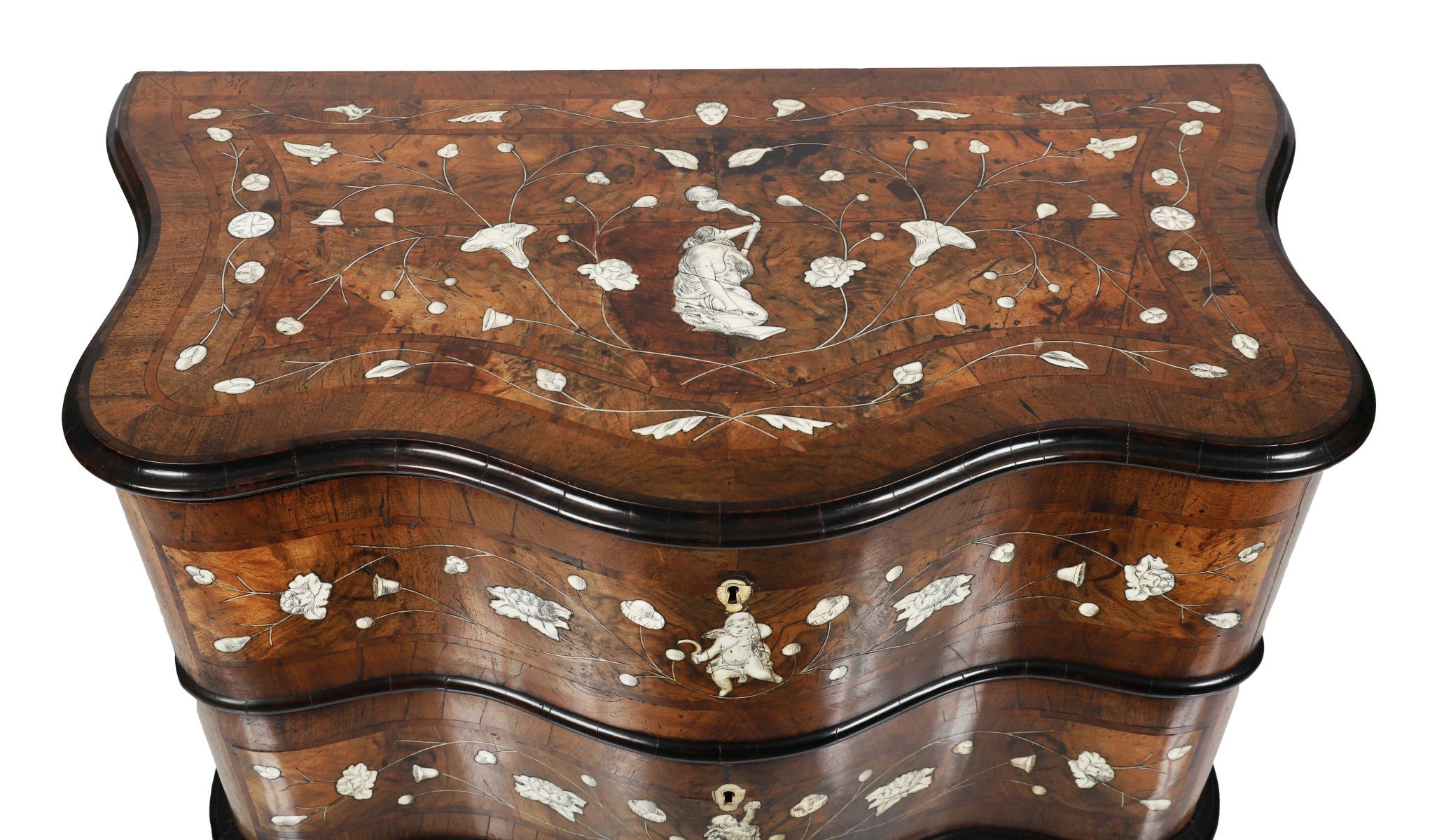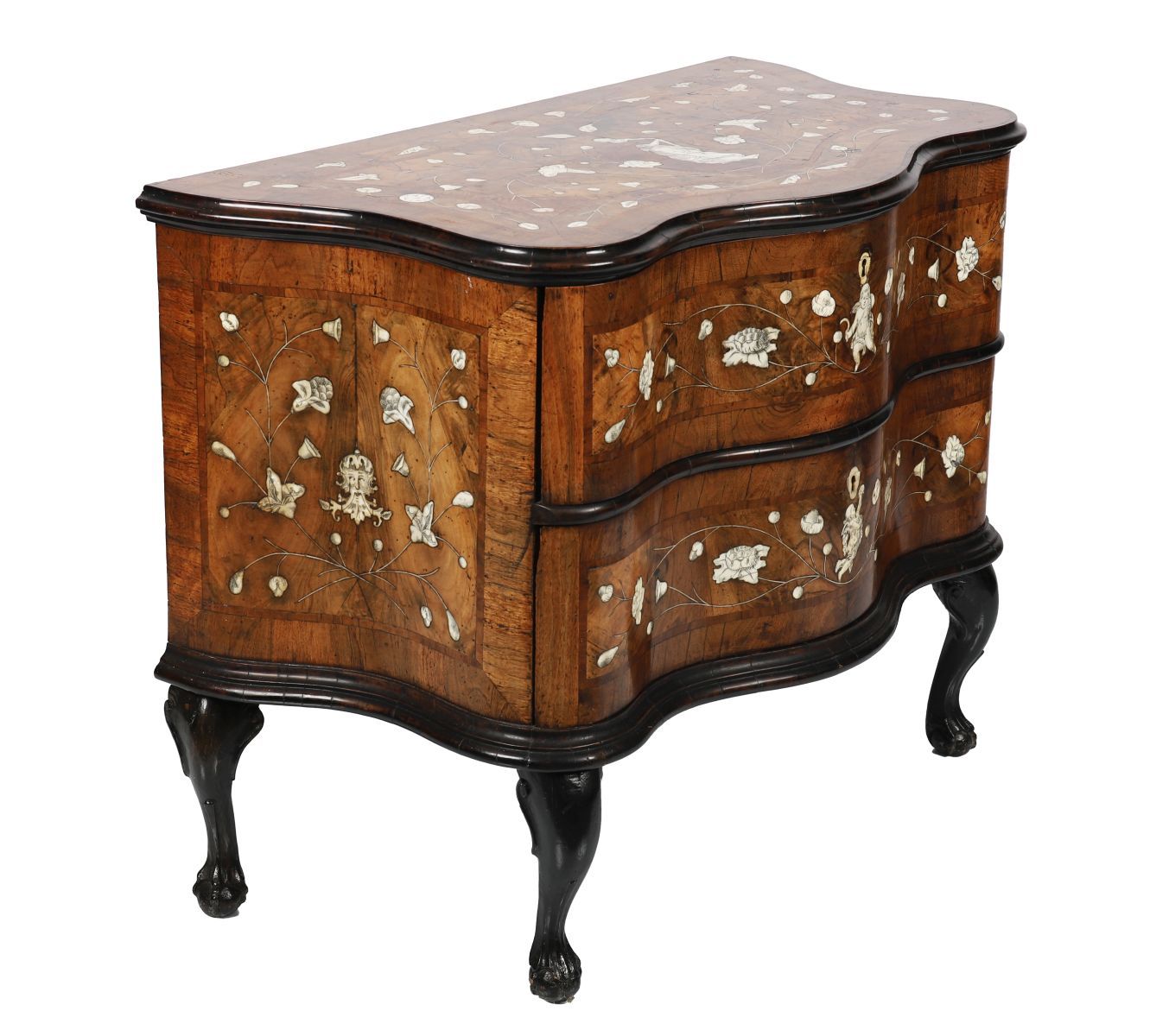 A fine 18th-century Italian walnut serpentine-front commode, the shaped top and drawer fronts intricately inlaid with floral and figural motifs in bone and contrasting woods. Fitted with two long drawers and framed by ebonised mouldings, raised on cabriole legs.