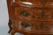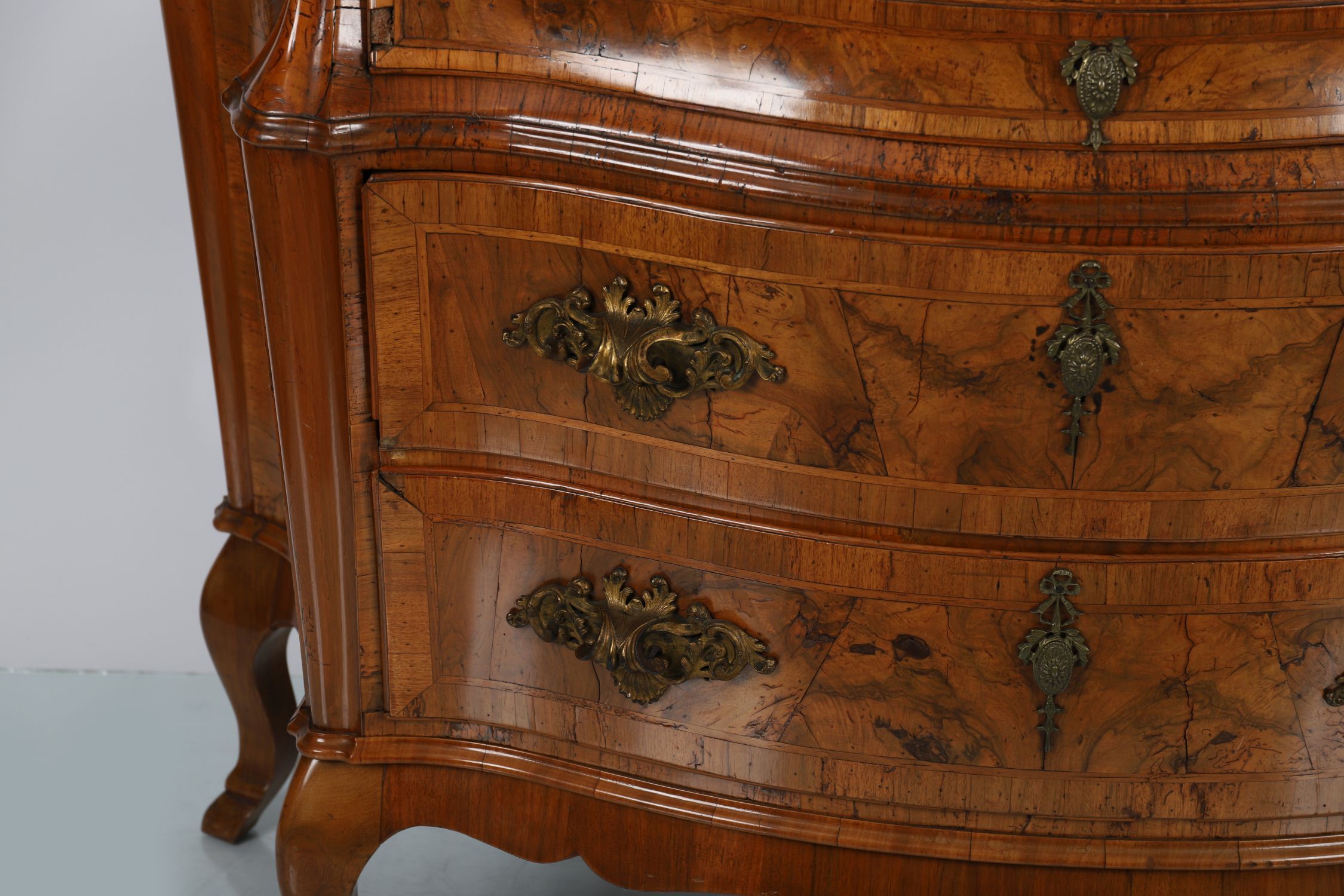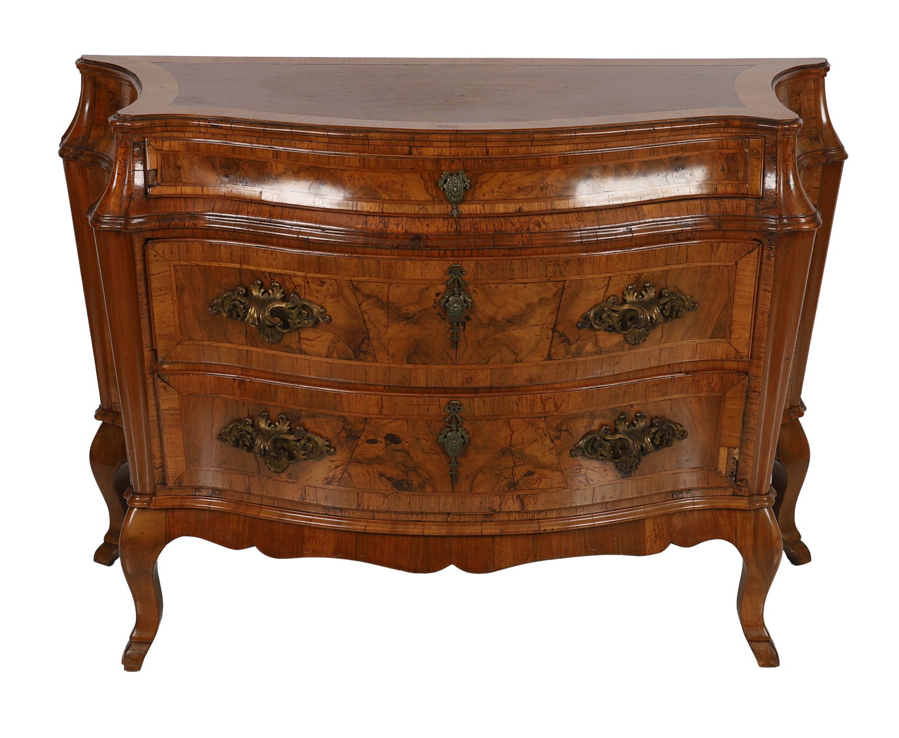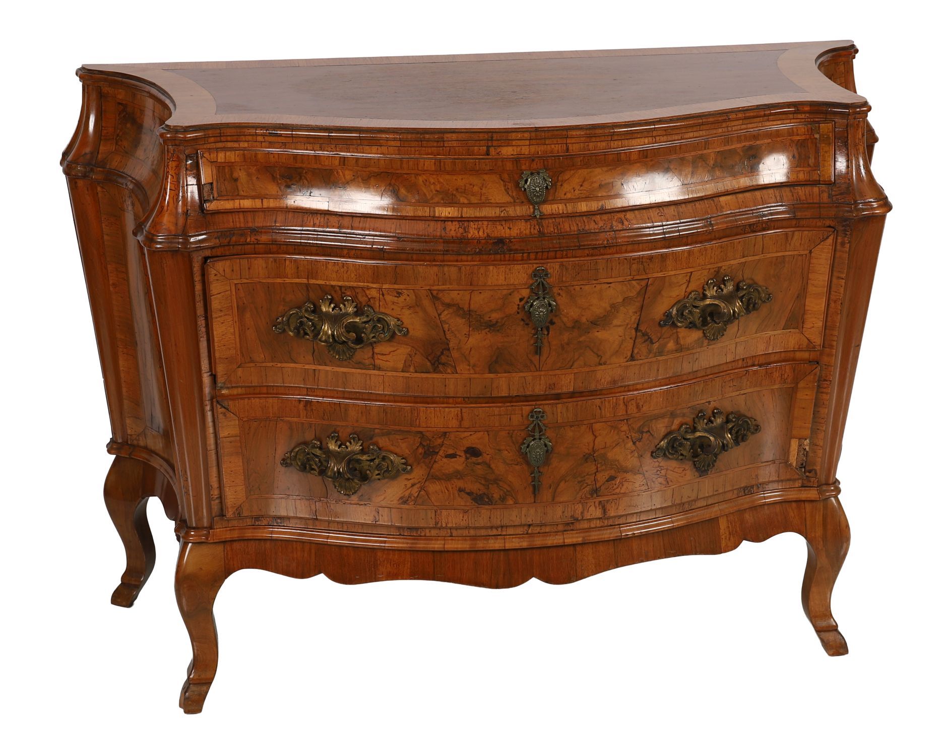 A fine 18th-century Italian commode of serpentine form, veneered in richly figured walnut with crossbanded edges and moulded top. The commode comprises three long drawers, each with ornate pierced brass escutcheons and handles, flanked by curved serpentine stiles. Raised on short cabriole legs, the piece displays excellent proportions and craftsmanship throughout.
