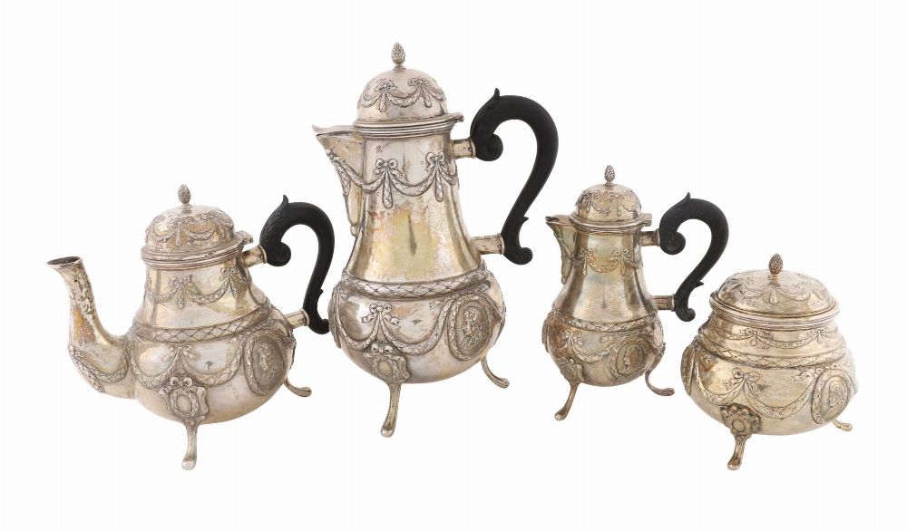 Comprising a coffee pot, teapot, covered sugar bowl and cream jug, each of baluster form and raised on scrolling feet, richly decorated in the neoclassical taste with cast and chased laurel swags, ribbon bowknots and oval portrait medallions depicting a classical male profile. The covers surmounted by pinecone finials, the teapot and coffeepot fitted with shaped ebony handles.