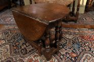 An 18th century oak gate leg table of low form, the top supported on turned legs with swinging gates, united by stretchers.