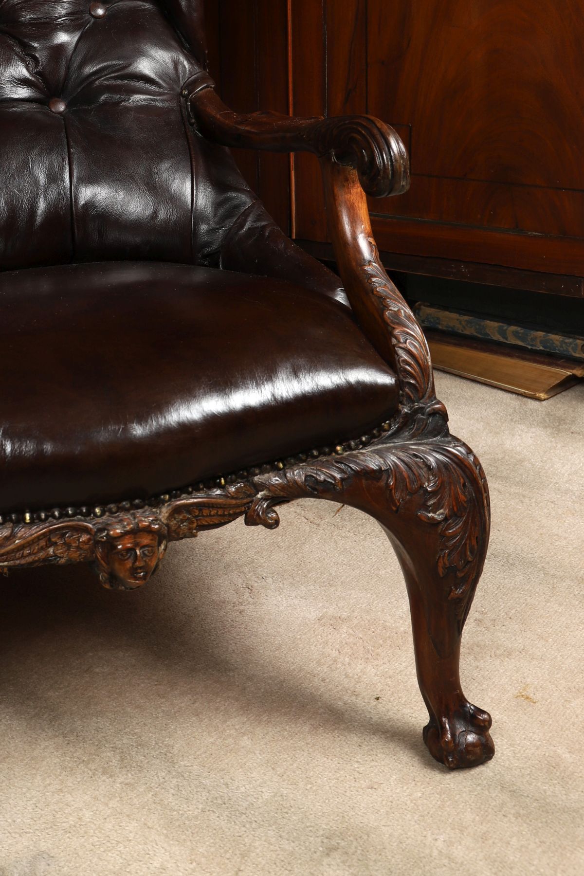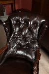 Mahogany wingback armchair with deep buttoned hide upholstery, shaped wings, scrolling arms and cabriole legs.