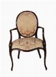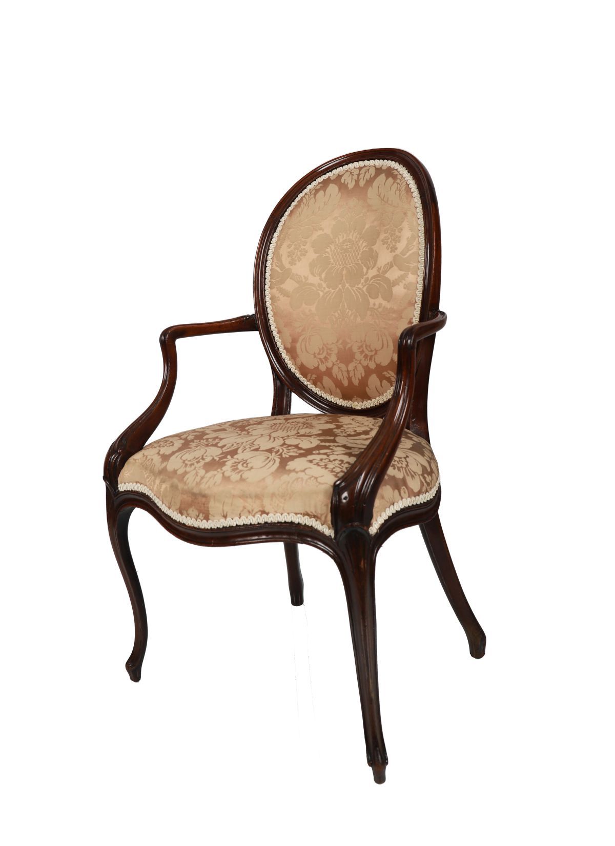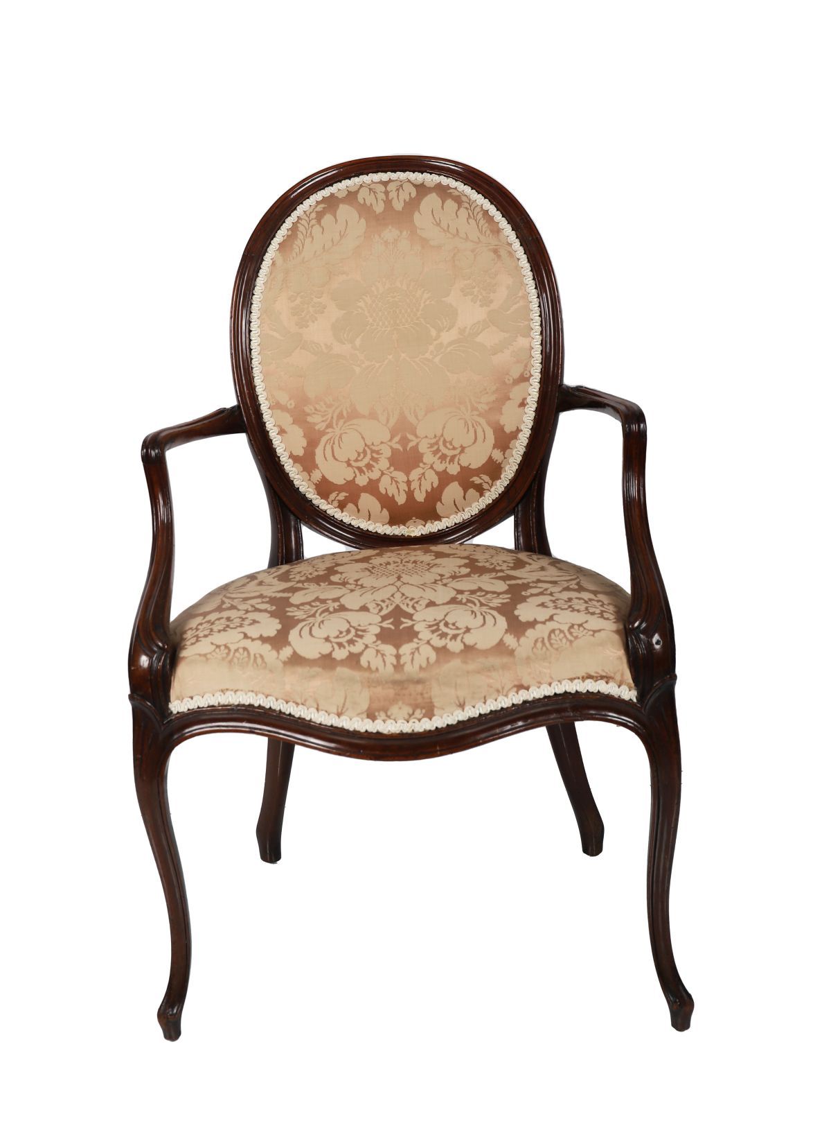 With oval padded back and seat in floral damask fabric, the moulded frame with scrolled arms and cabriole legs.