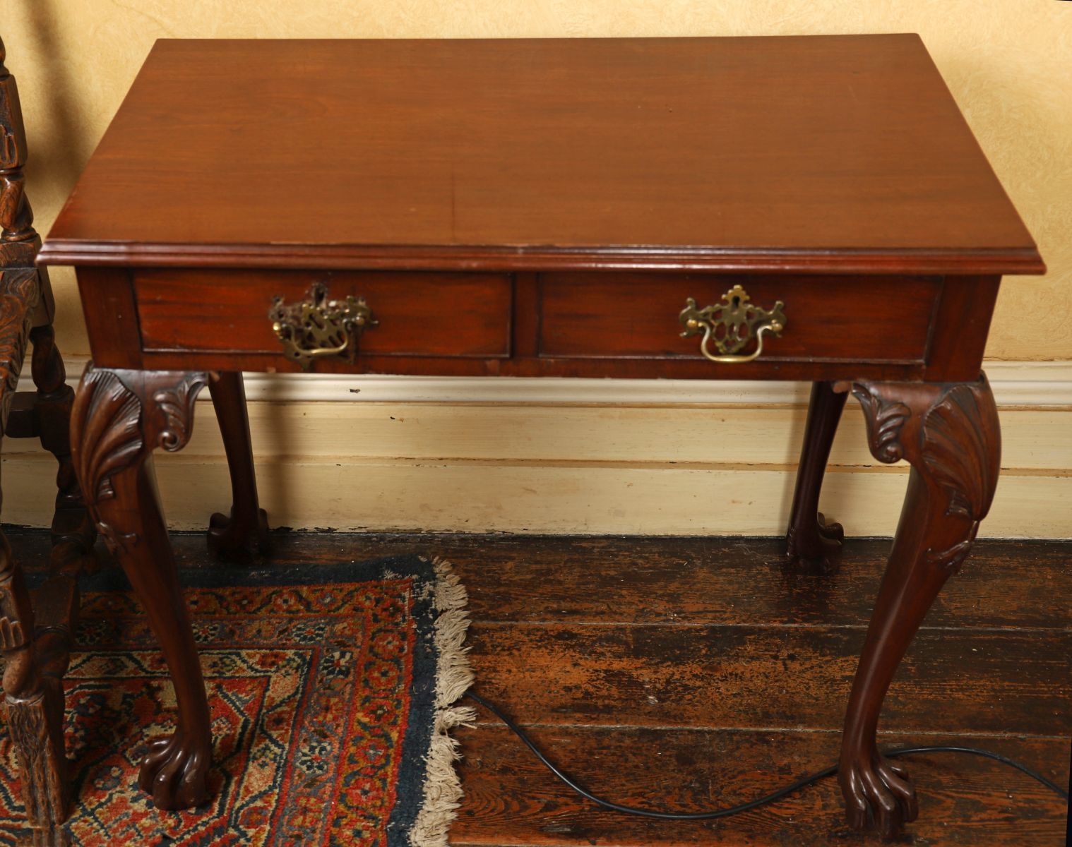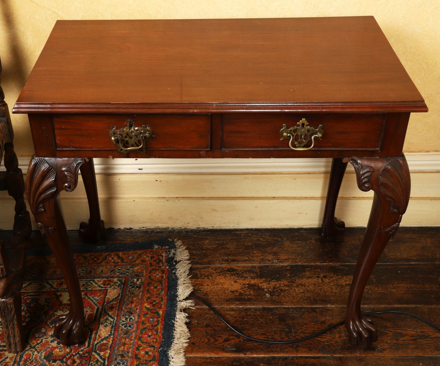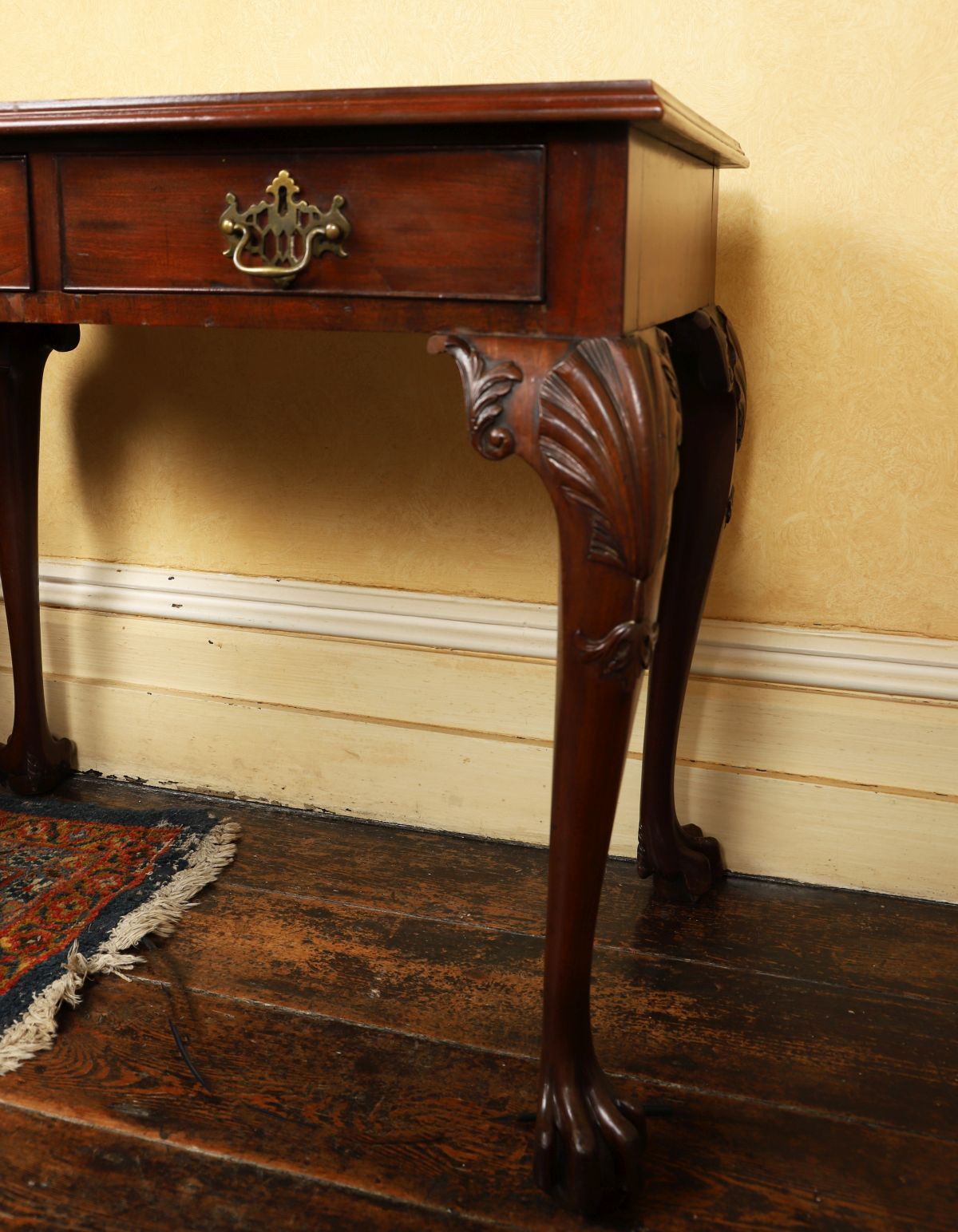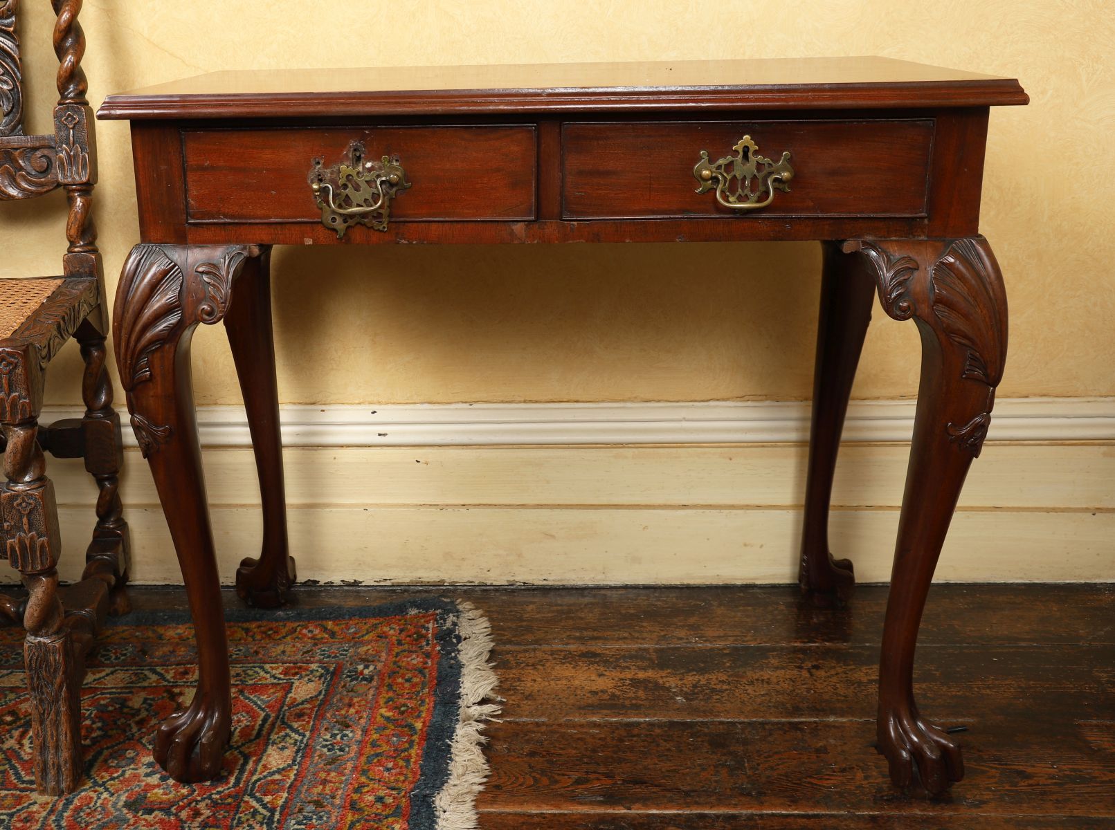 The rectangular moulded edged top above two frieze drawers furnished with pierced armorial brass handles, raised on scallop-headed cabriole legs terminating on claw feet.