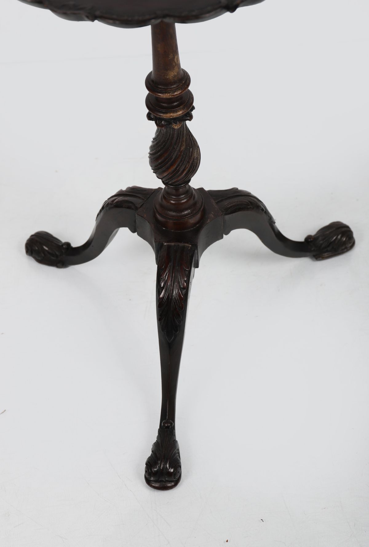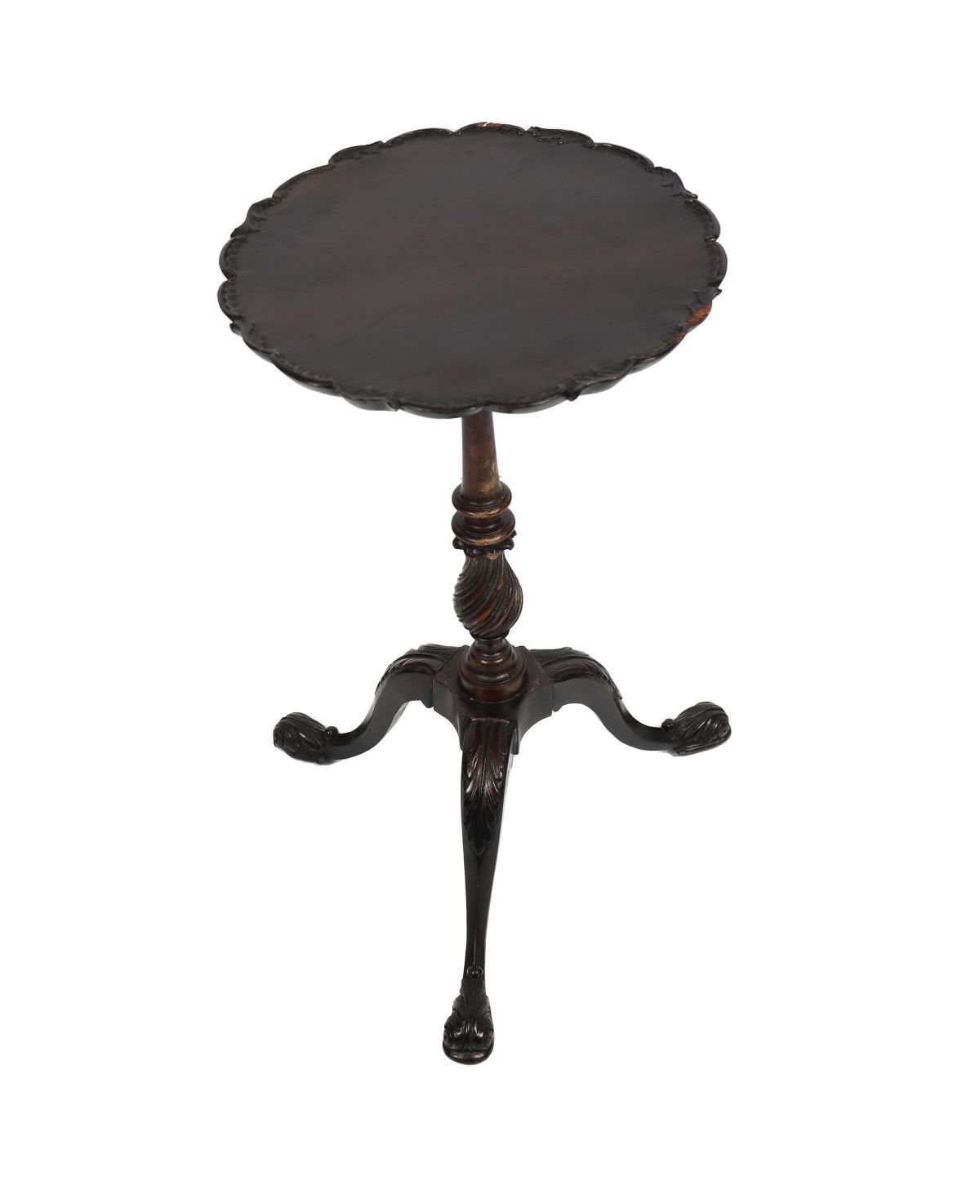 An elegant Georgian mahogany tripod table with scalloped top, carved stem, and cabriole legs terminating in ball-and-claw feet.