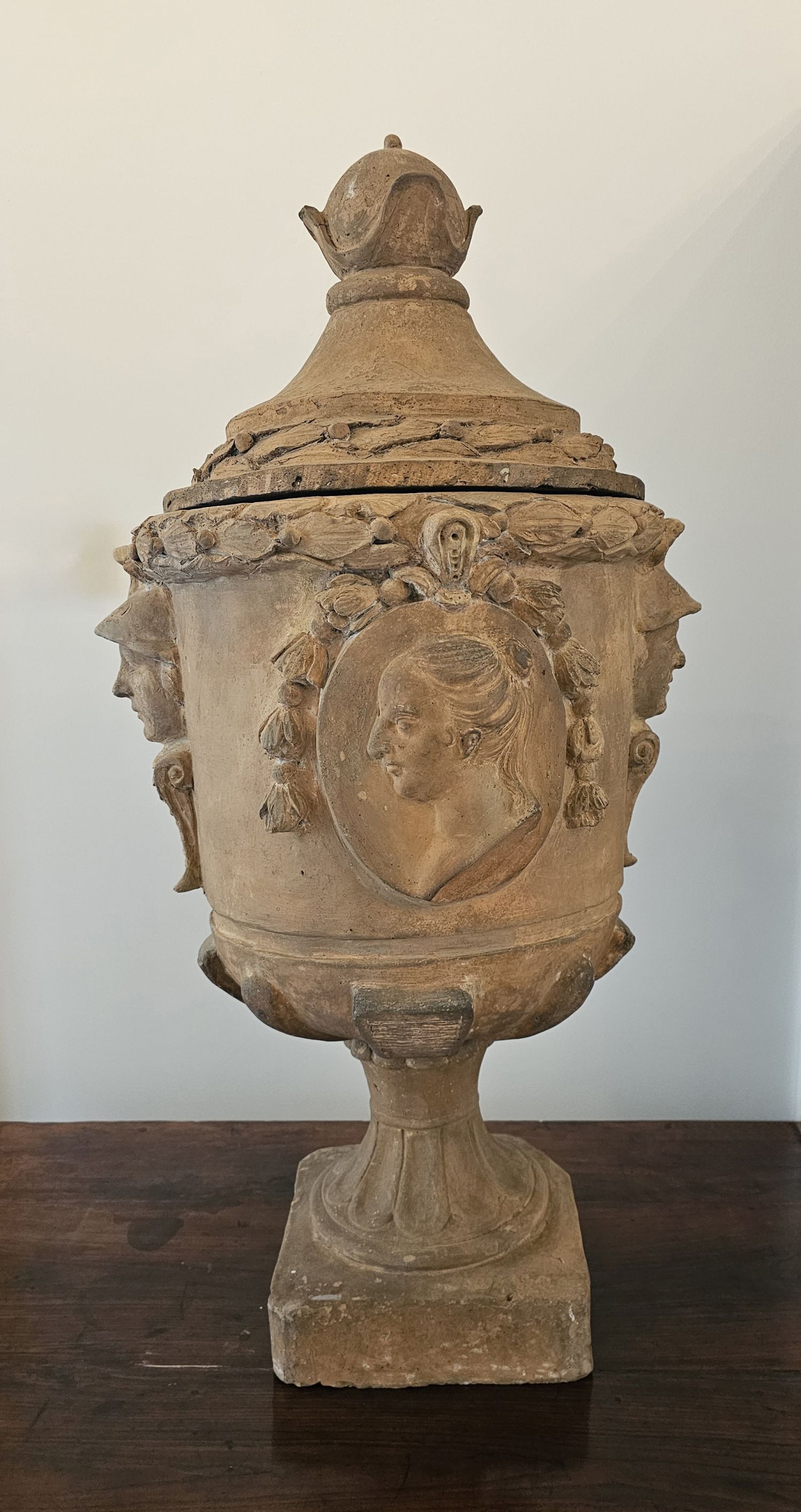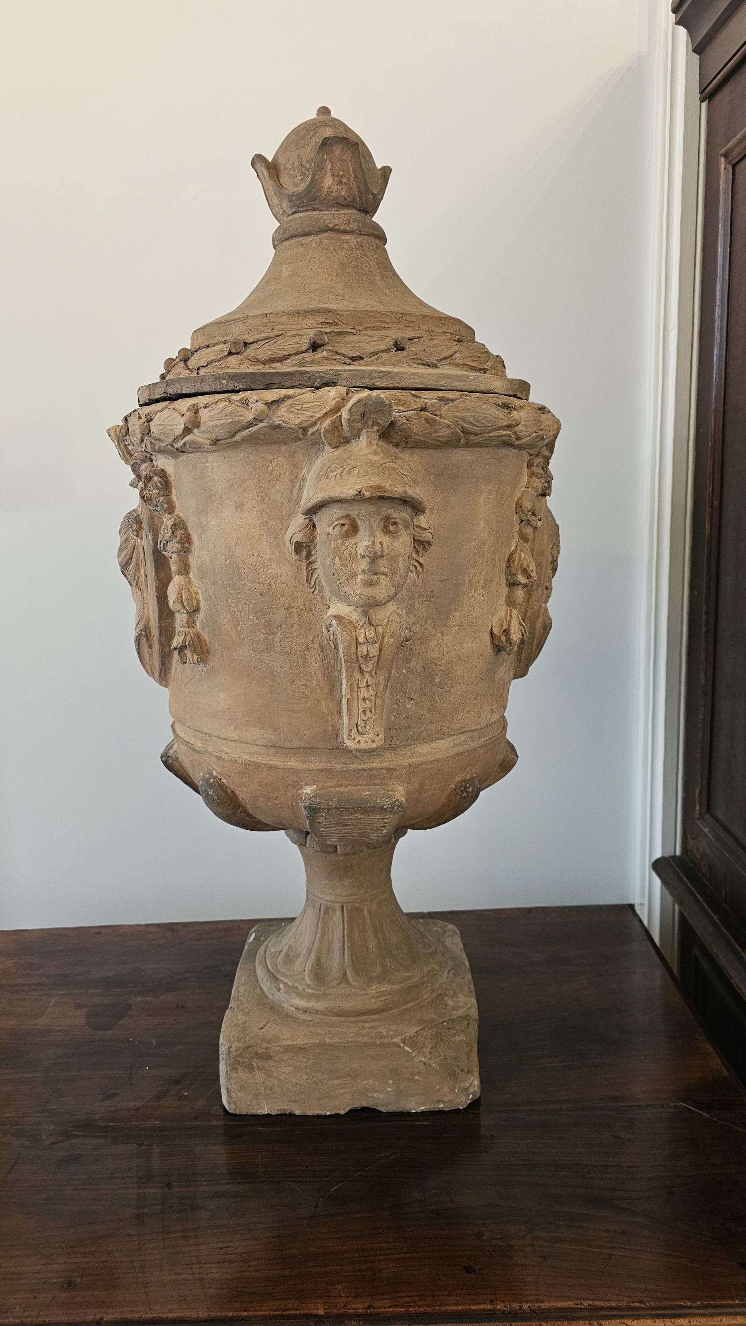 A large terracotta urn with domed lid, the body applied with laurel swags and masks of helmeted warriors, raised on a spreading socle and square base. The decoration and form reflect classical revival taste in the late 18th century.