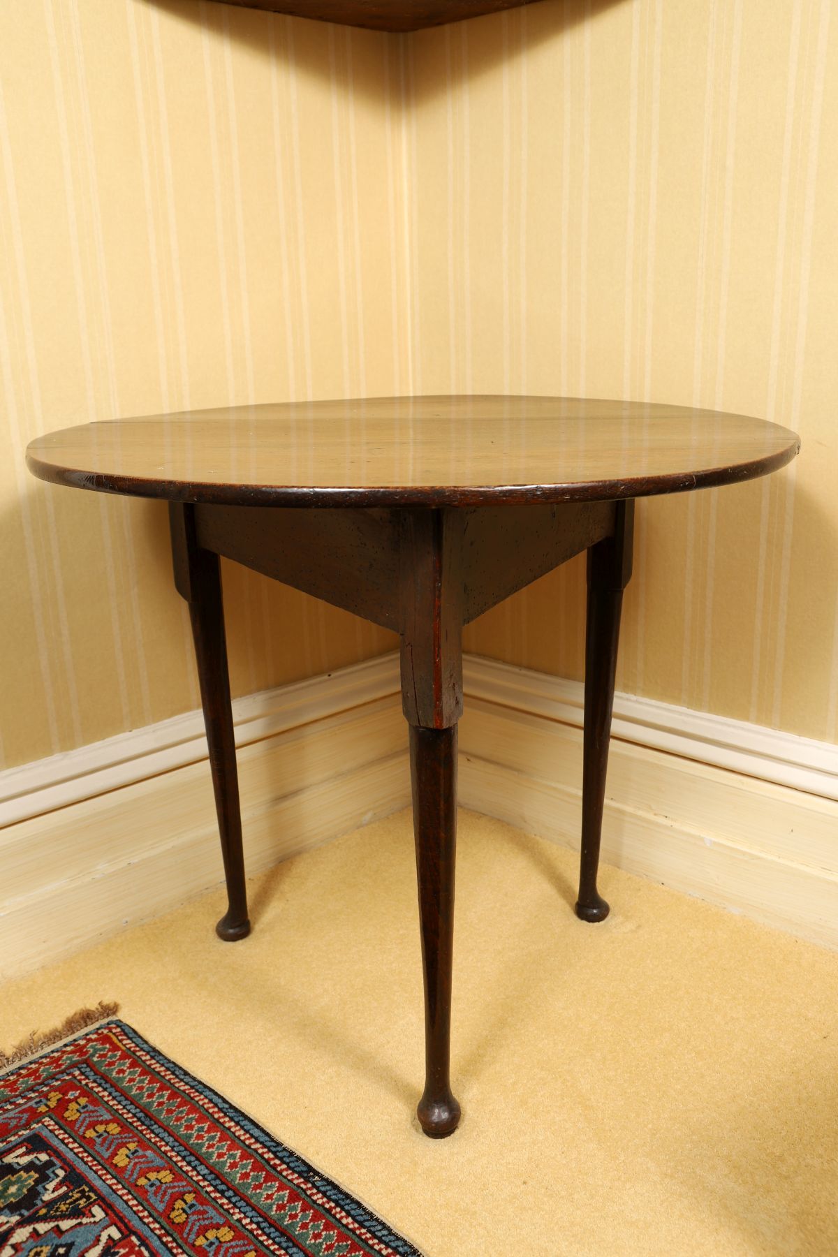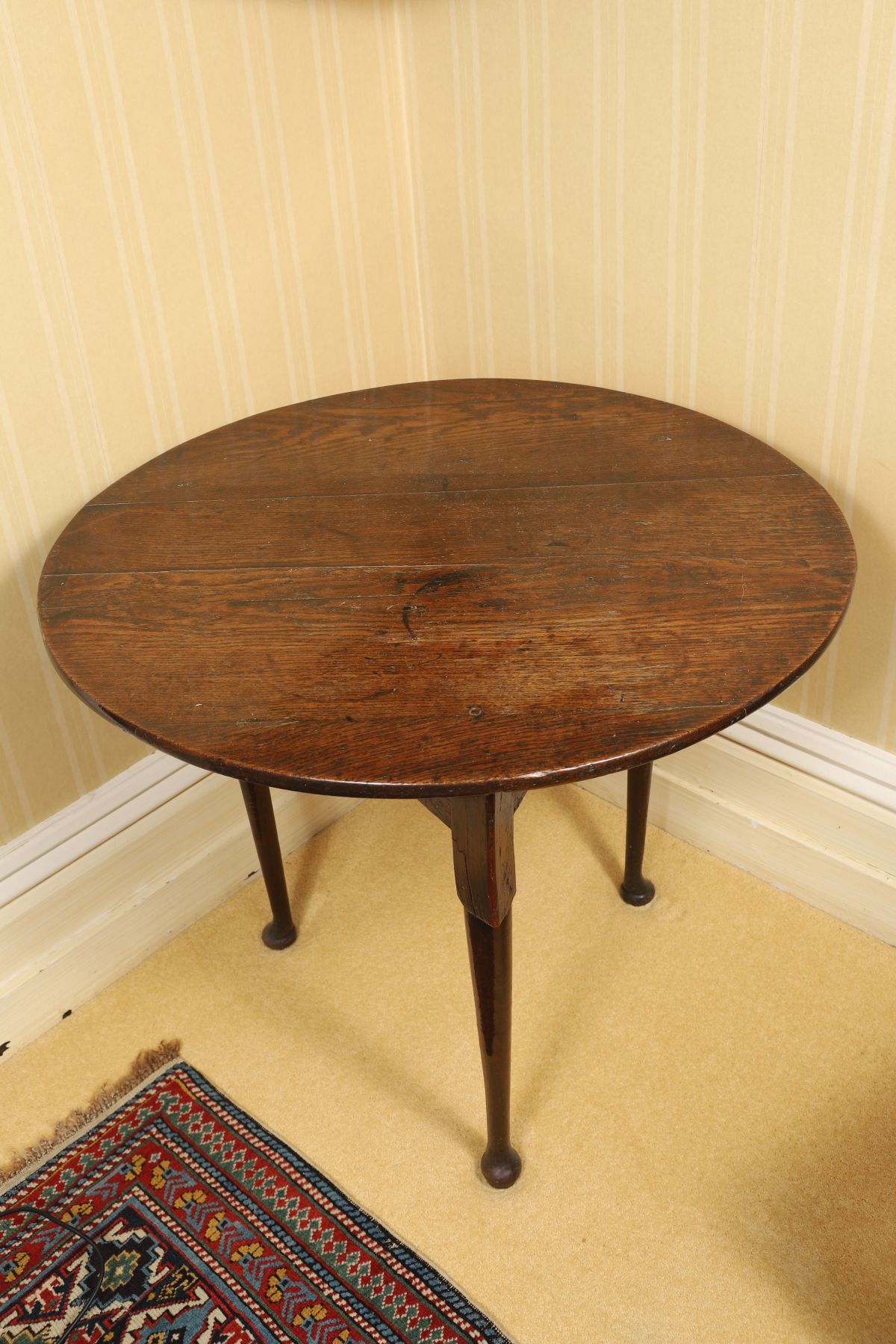 An 18th-century oak cricket table, the circular top raised on three tapering supports, the surface showing wear and patination consistent with age.
