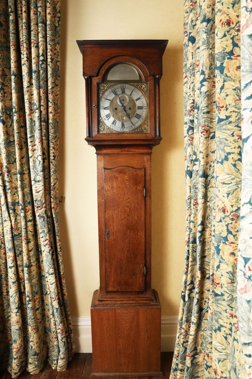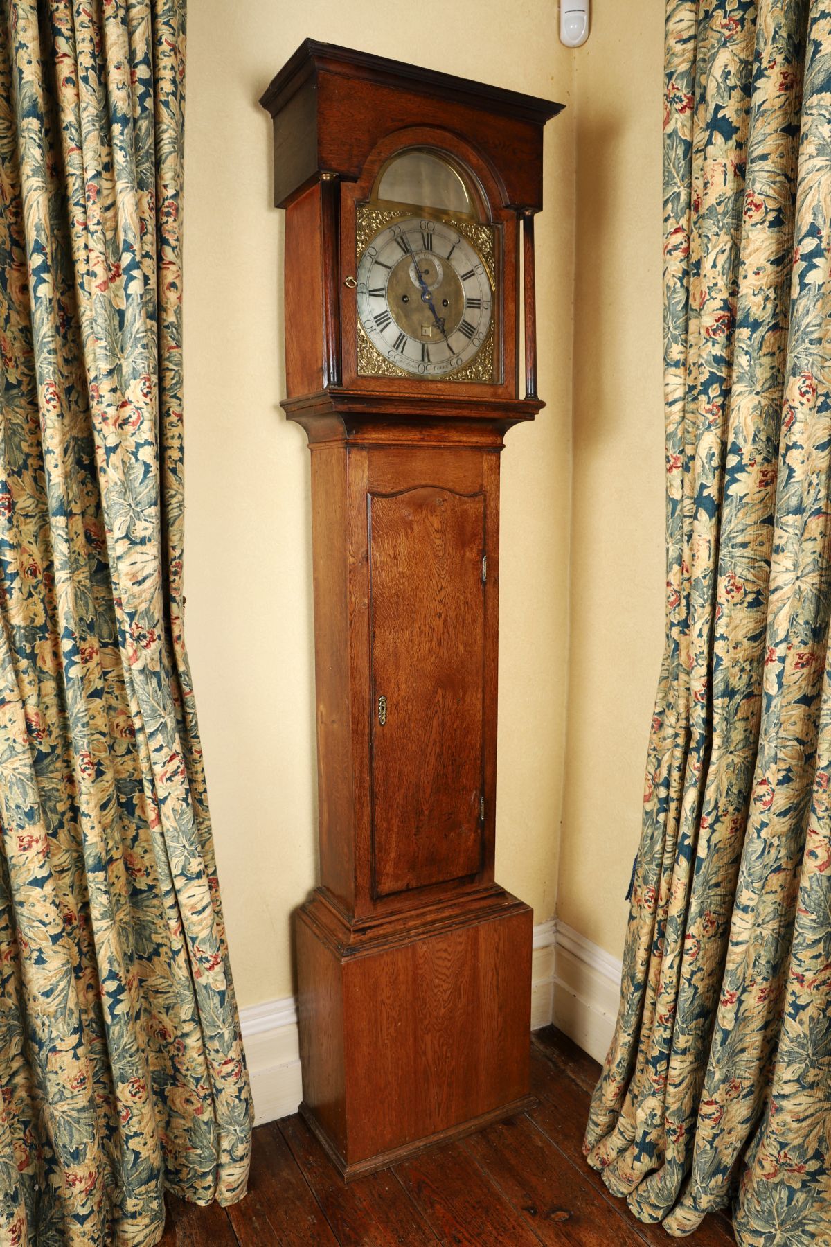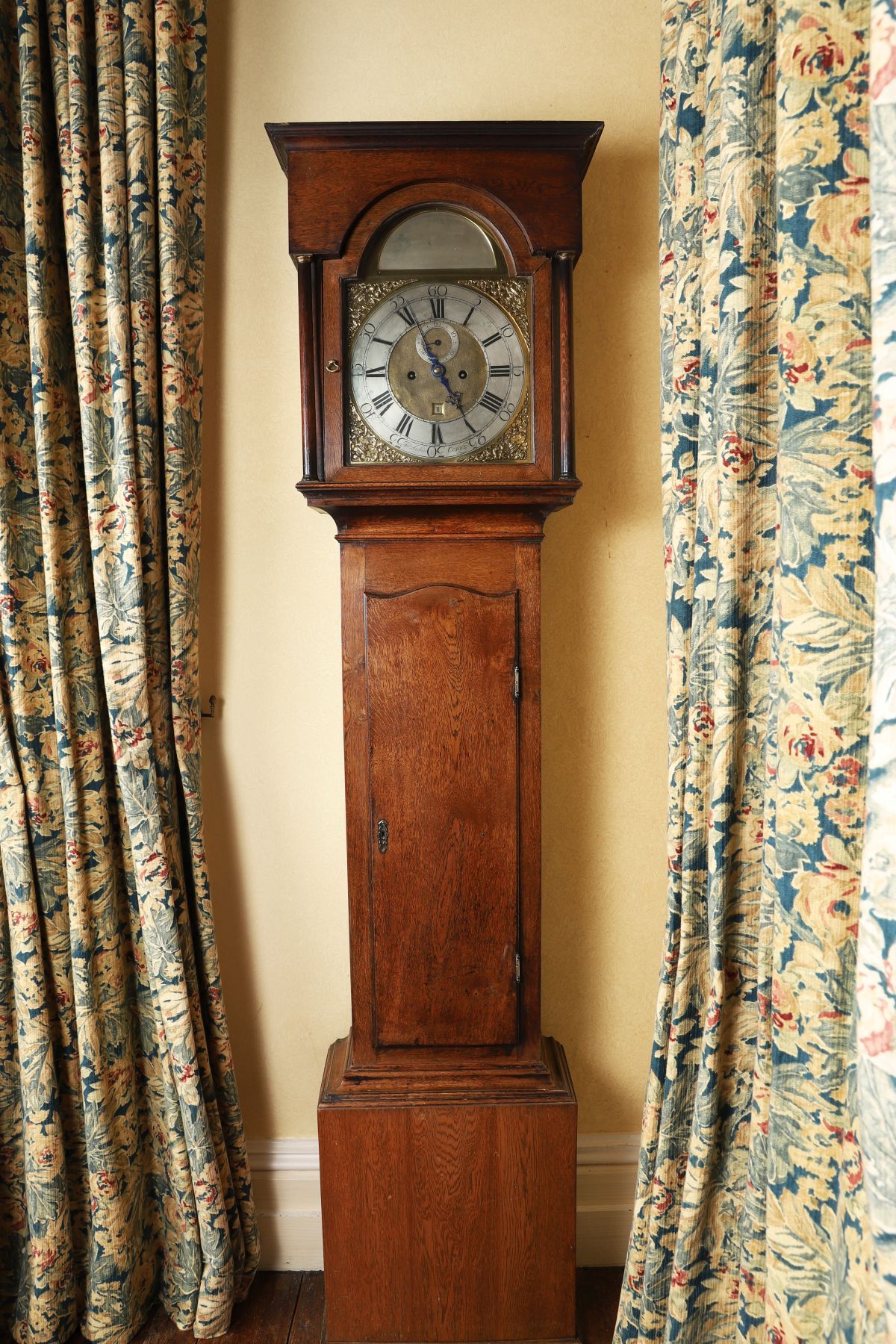 An 18th century oak longcase clock, the case with arched hood and moulded cornice above a glazed door flanked by turned columns. The brass dial fitted with a silvered chapter ring engraved with Roman numerals and minute divisions, with subsidiary seconds dial and date aperture, and pierced and engraved spandrels to the corners. Signed to the dial James Aickin, Cork. The trunk with shaped door above a plain base. The oak showing a well-developed patina, with surface wear, marks and tonal variation consistent with age and long use. Movement, weights and pendulum present; working condition not tested.