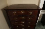 In two parts, the upper section with moulded cornice above graduated drawers, the lower section with further long drawers, raised on bracket feet.