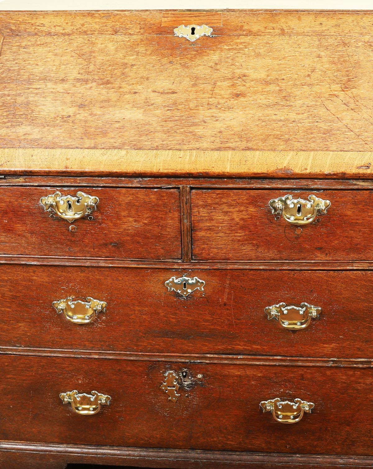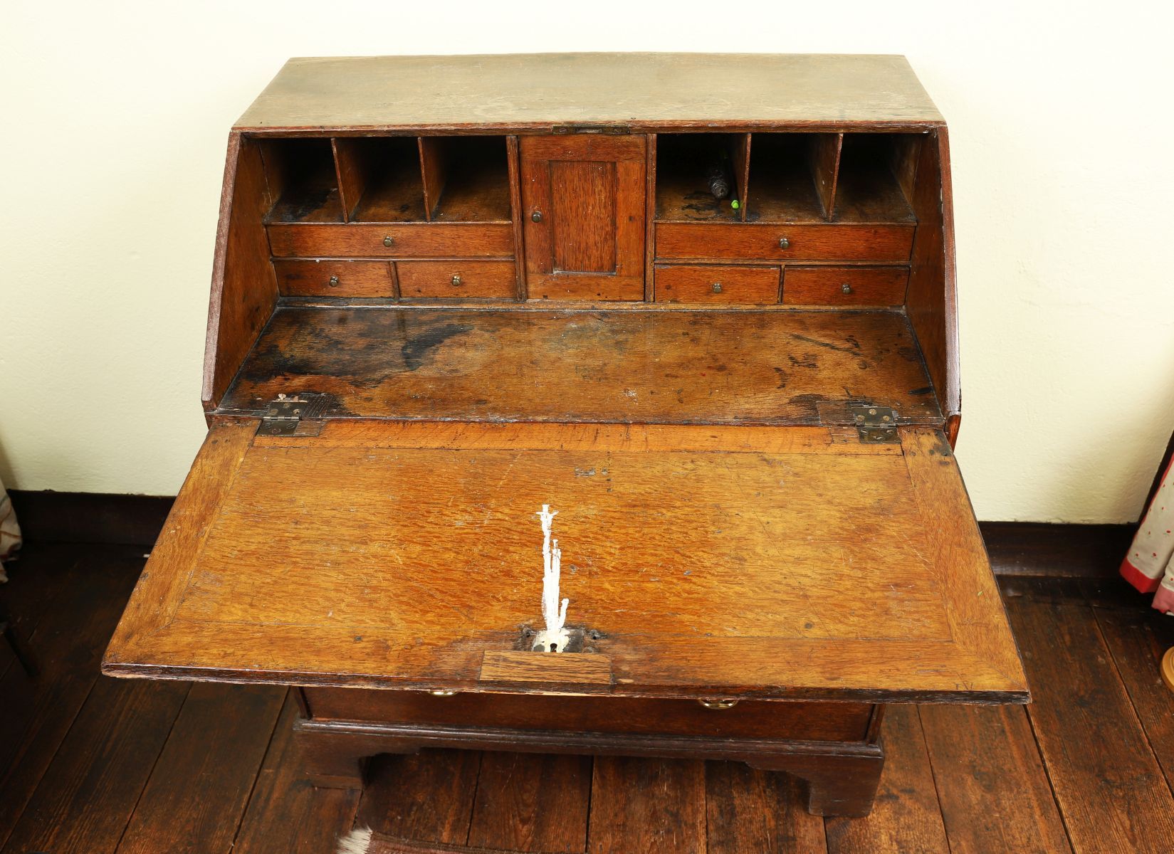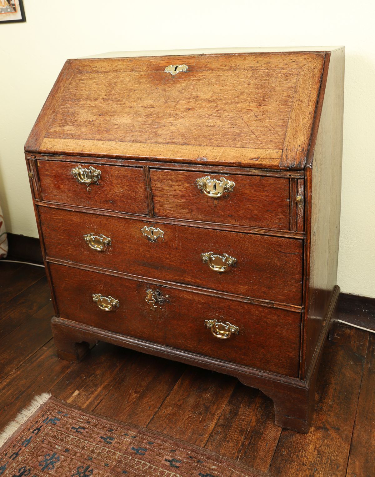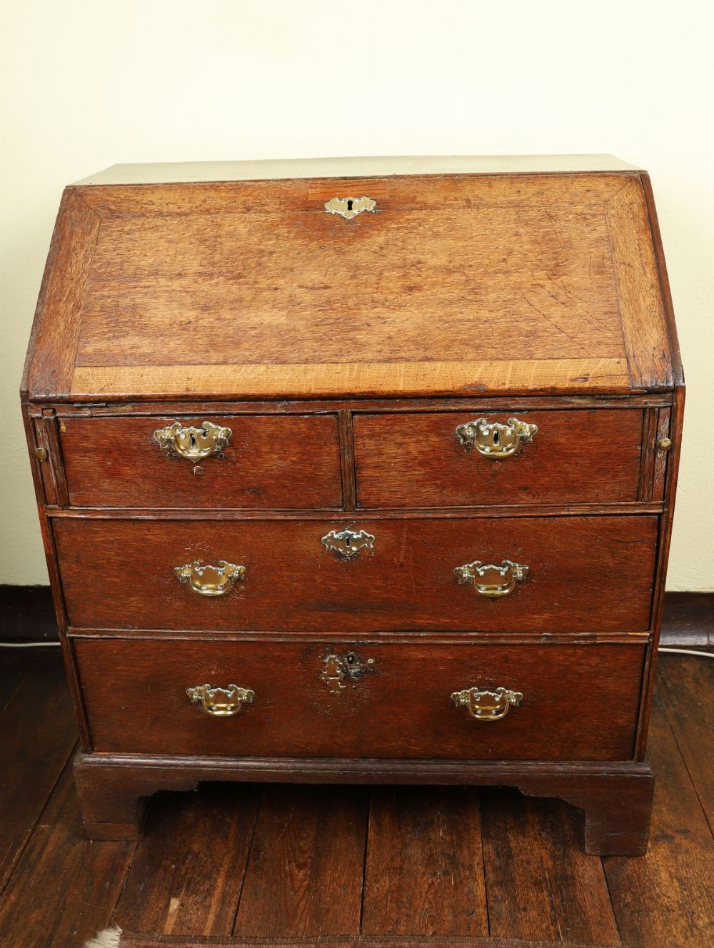 An 18th-century oak writing bureau with sloping fall enclosing a fitted interior of pigeonholes and small drawers, above two short and two long drawers, raised on bracket feet.