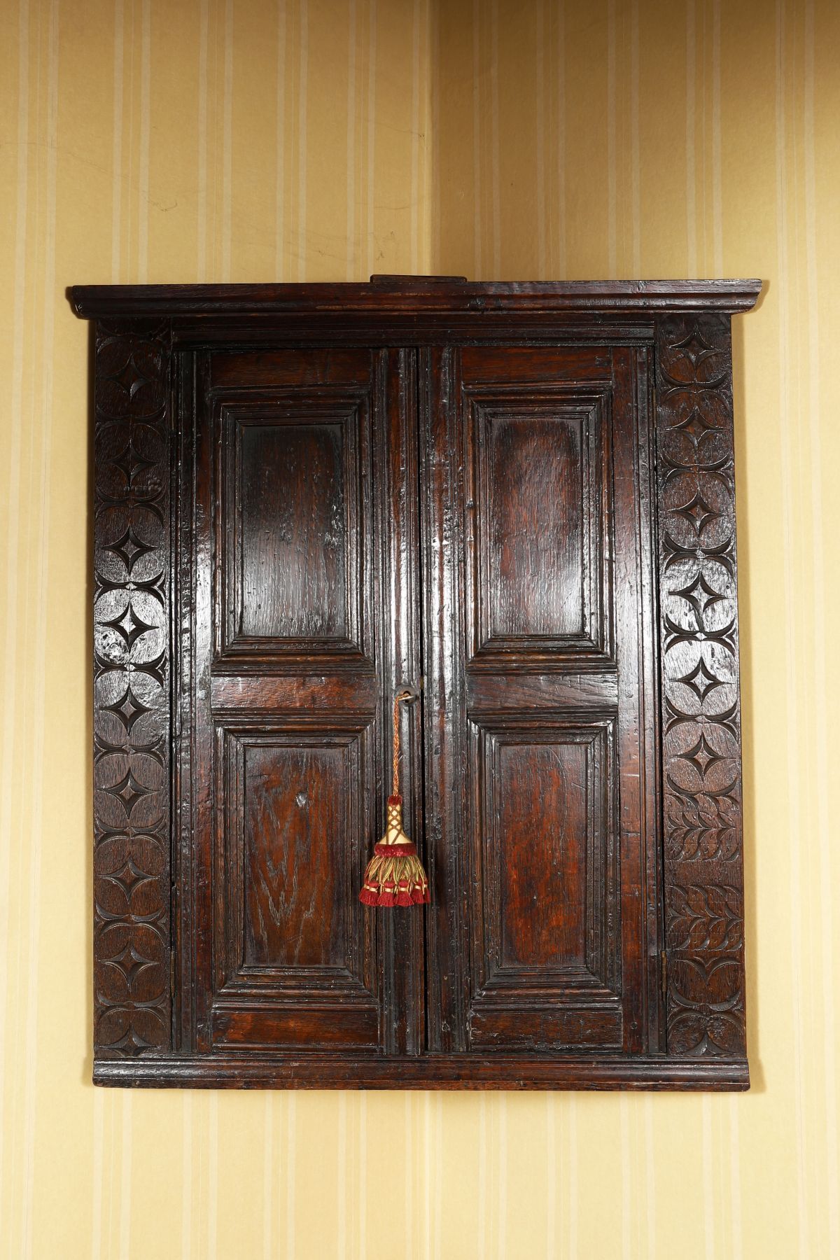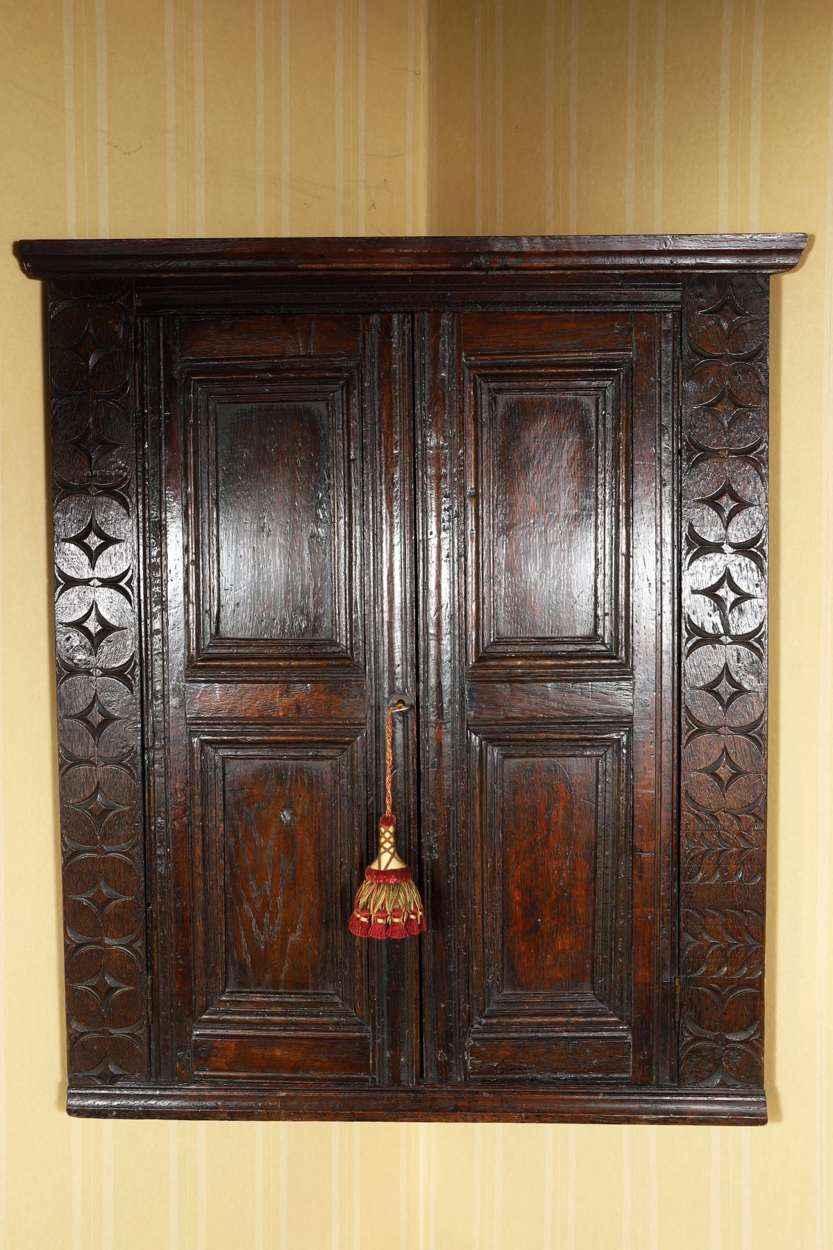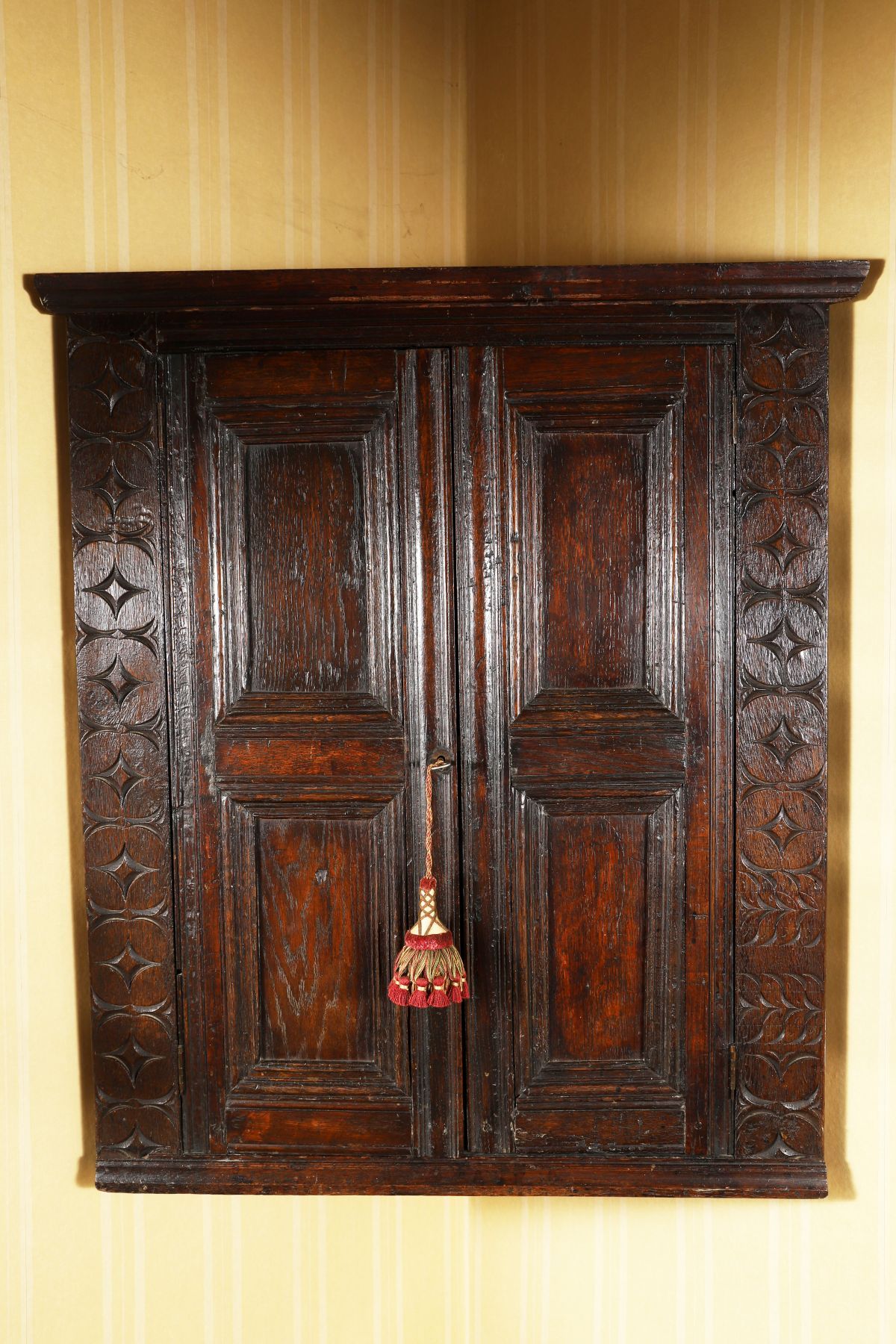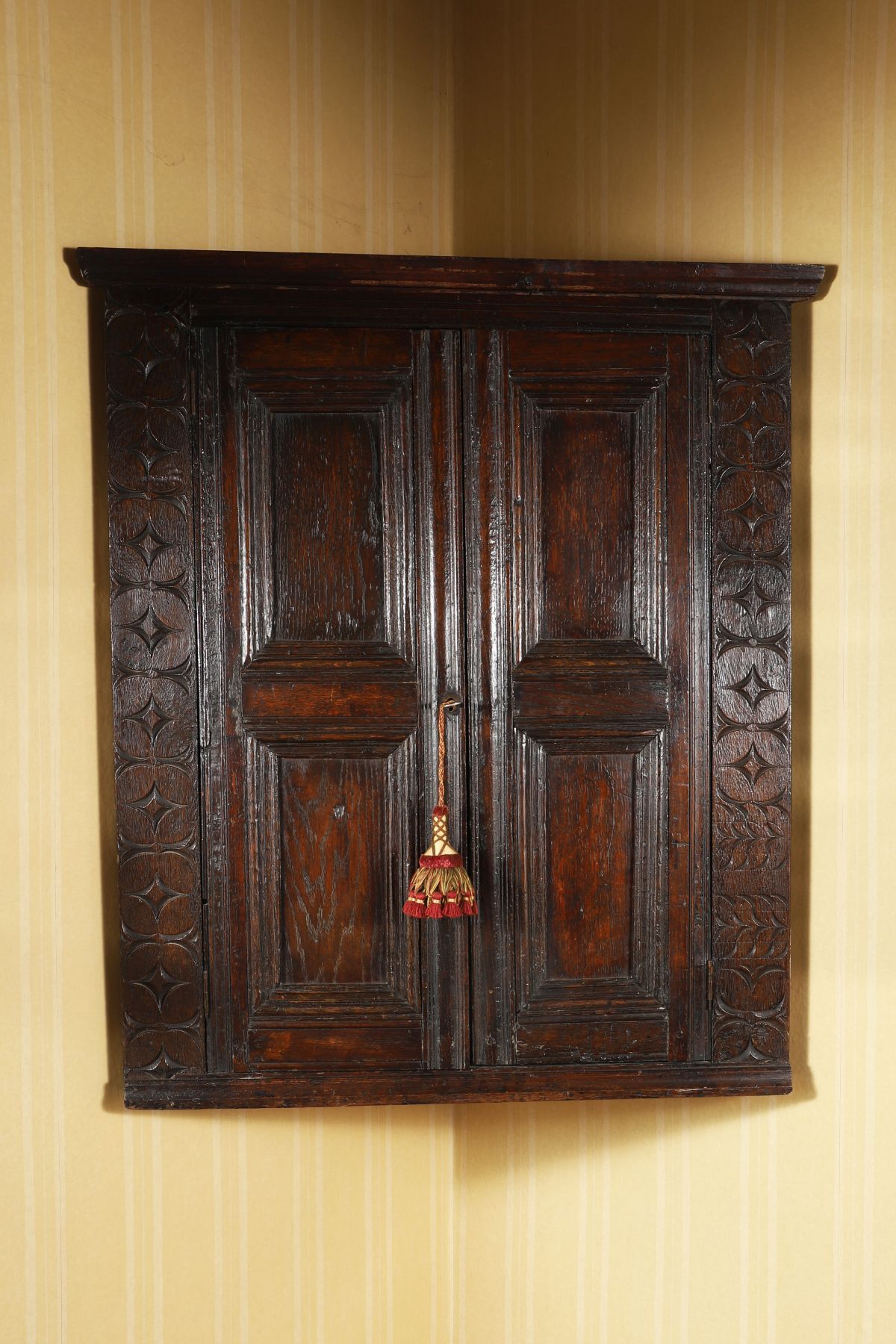 An 18th-century panelled oak wall-mounted corner cabinet, with twin panelled doors enclosed by carved stiles, retaining original hinges and fittings.