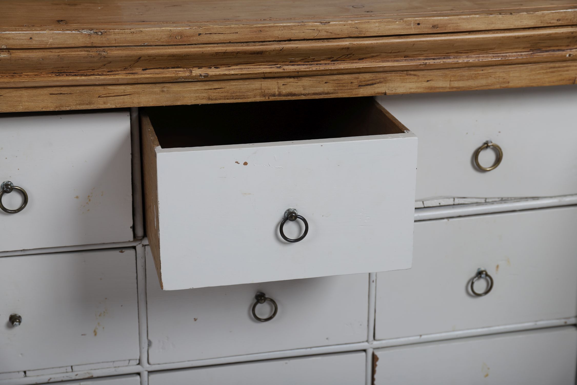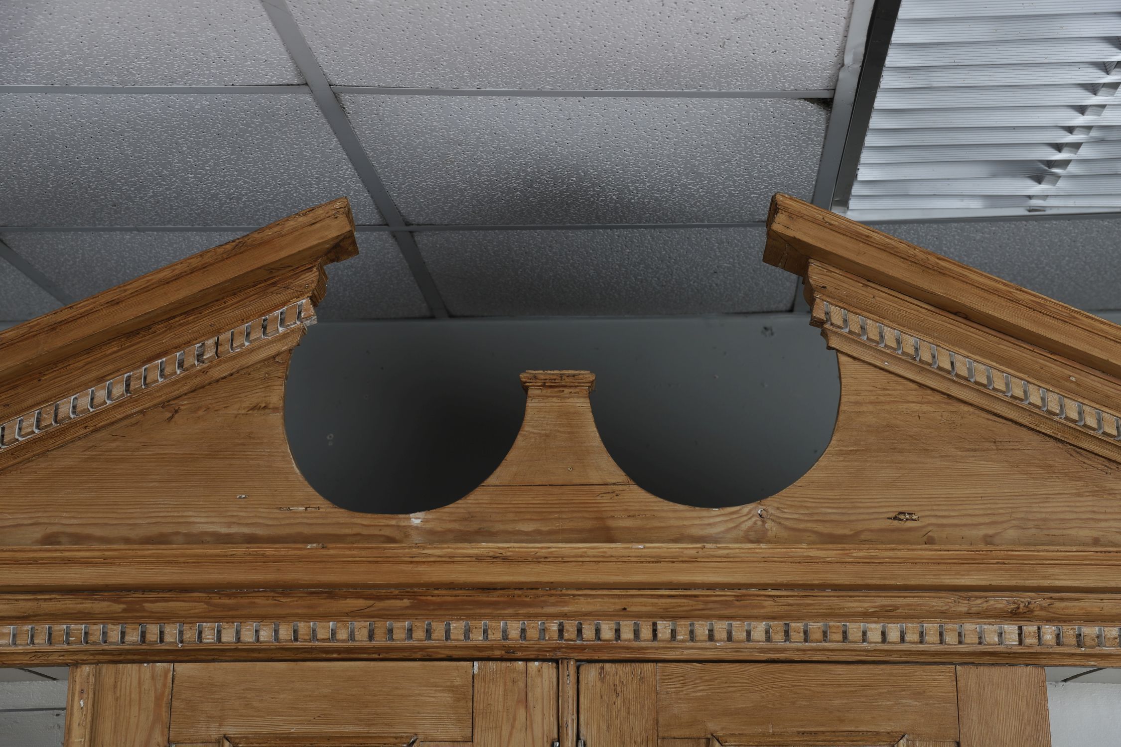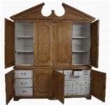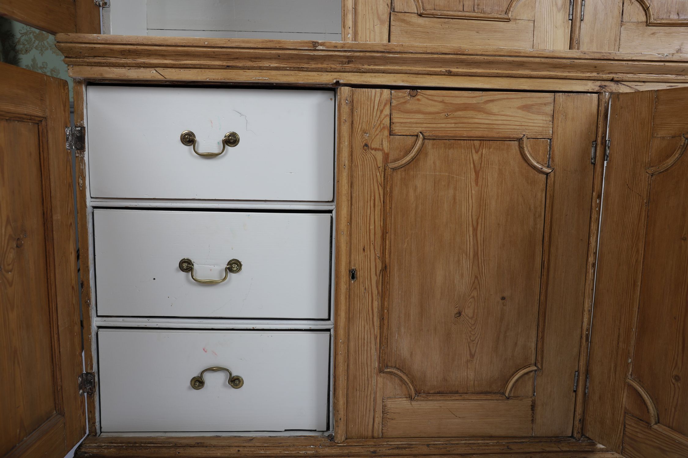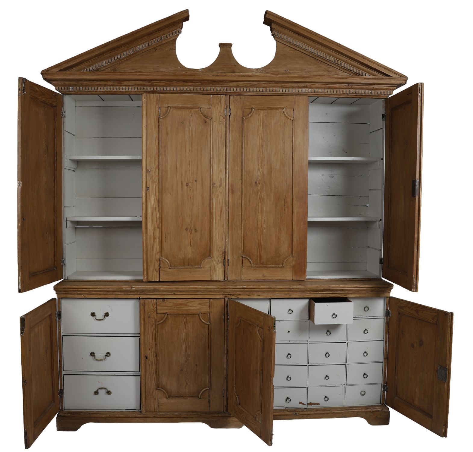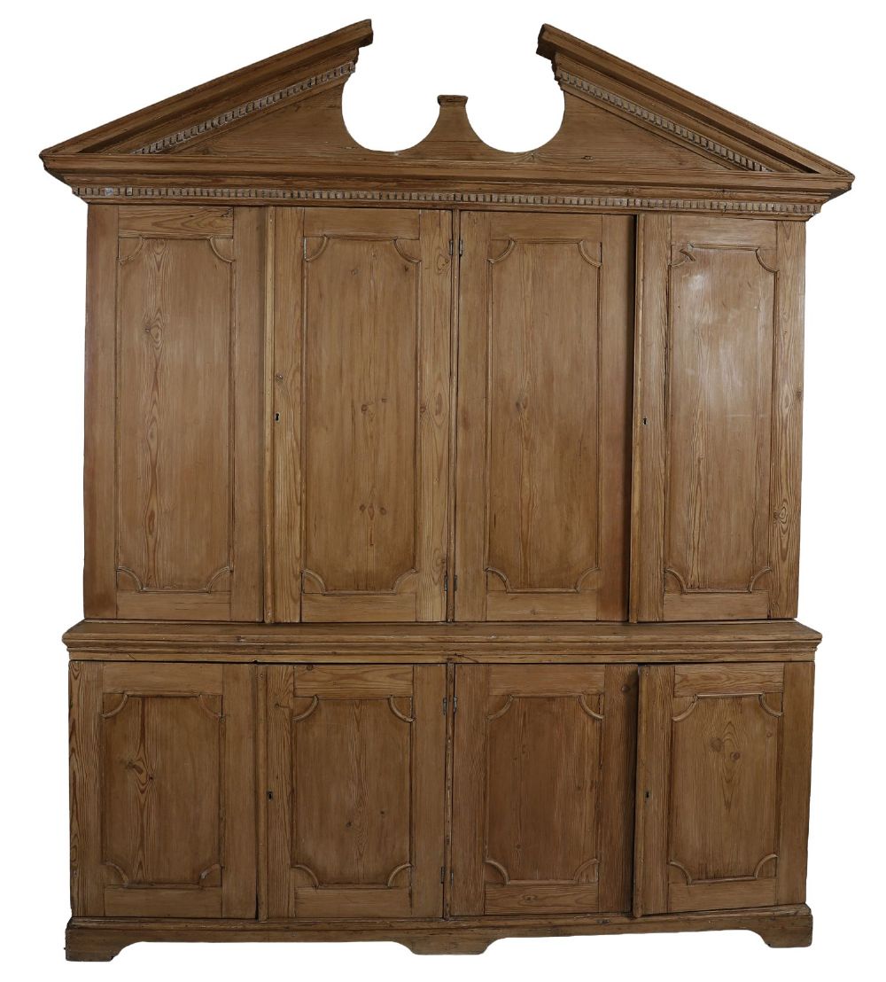 A large 18th century pine cupboard of impressive scale, the upper section with a bold broken pediment cornice above four panelled doors, opening to shelved storage. The lower section fitted with further panelled doors, one enclosing a bank of small painted drawers with ring-pull handles. Raised on shaped bracket feet.