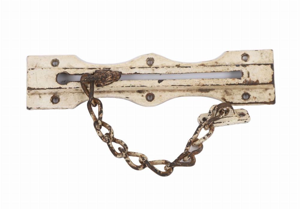 An 18th-century iron security lock with mounting plate and attached chain.