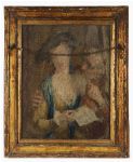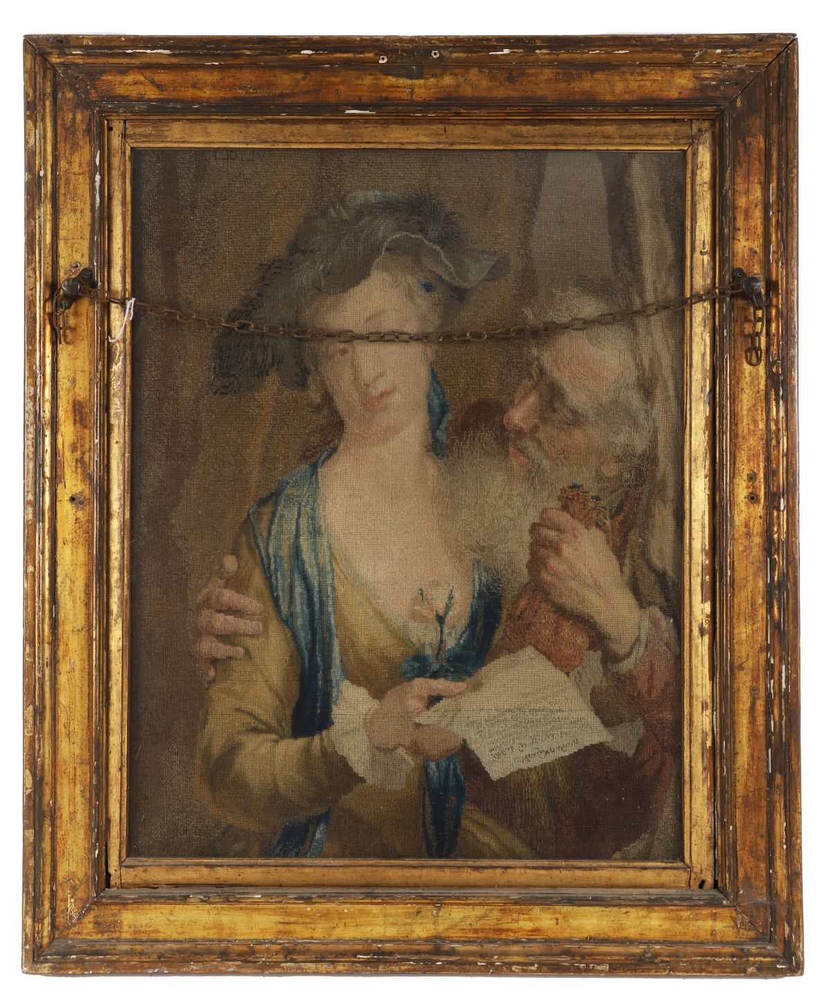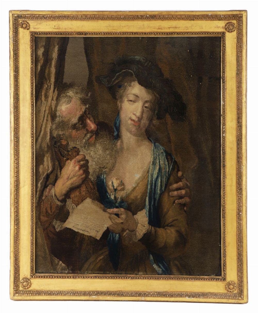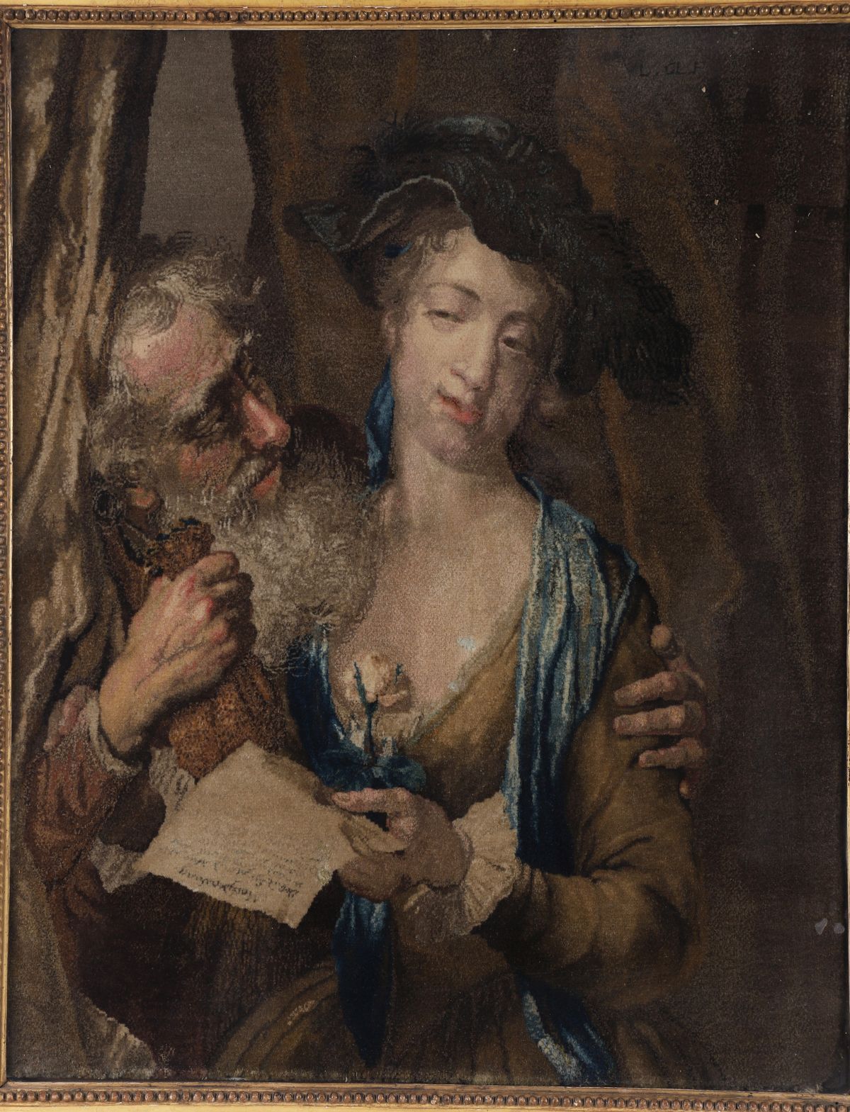 18th-century tapestry panel depicting a figural interior scene, framed and glazed; the reverse also displaying a further tapestry panel.