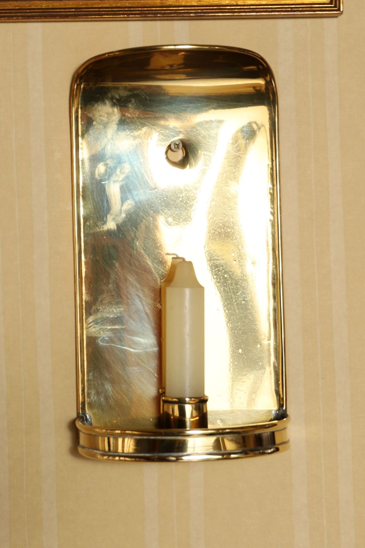 An 18th-century wall-mounted brass candlestick, with shaped backplate, drip tray, and candle socket.