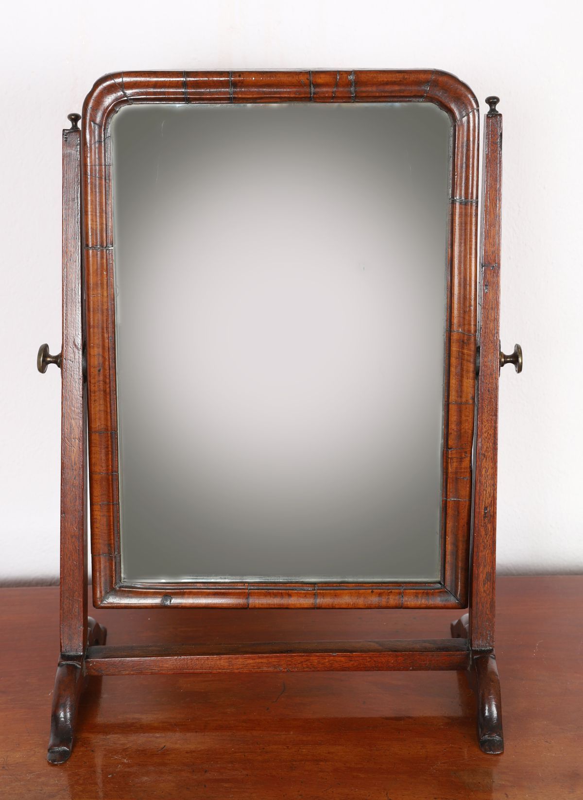 An 18th-century walnut-framed crutch mirror, the rectangular plate within a gently moulded frame, mounted on shaped supports with scroll feet.