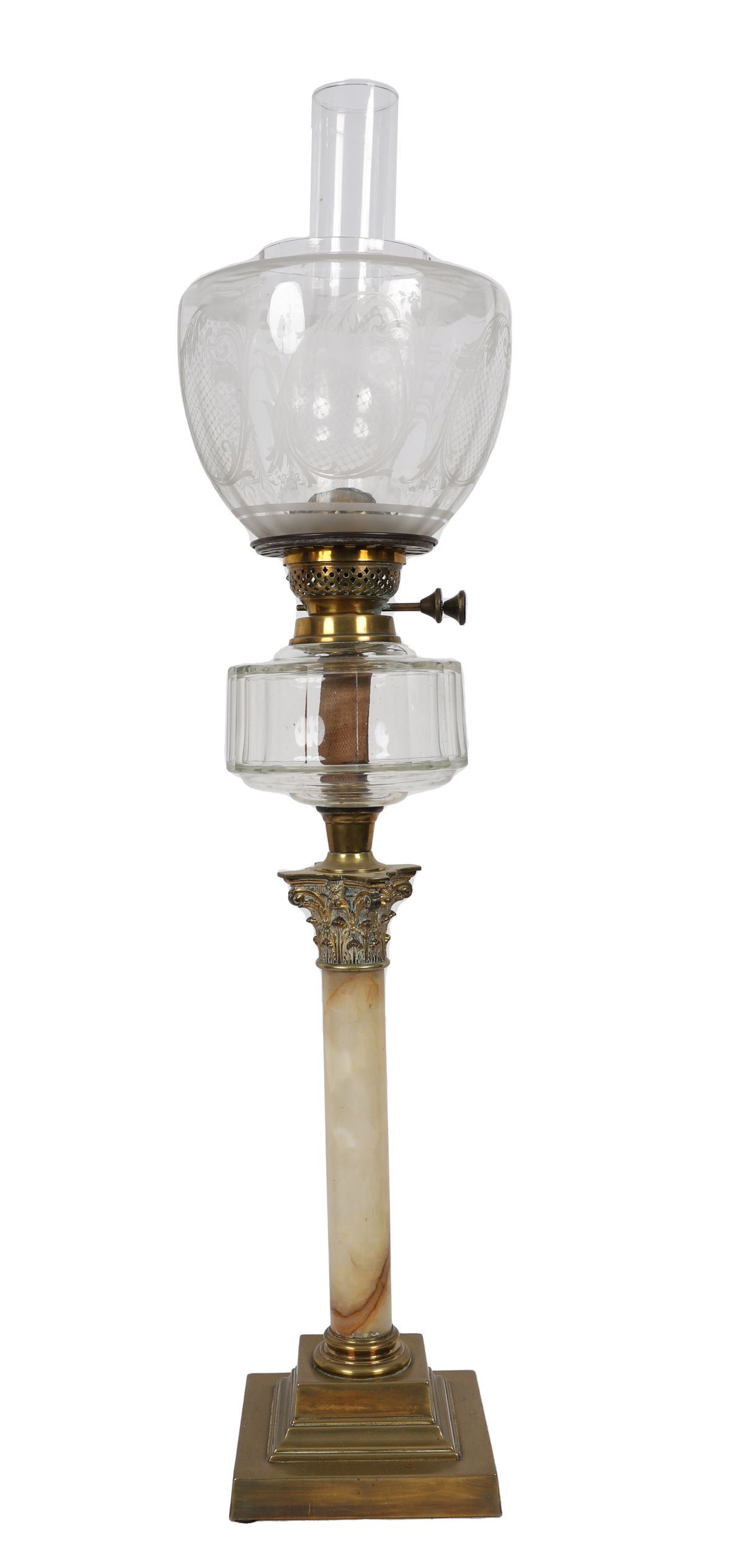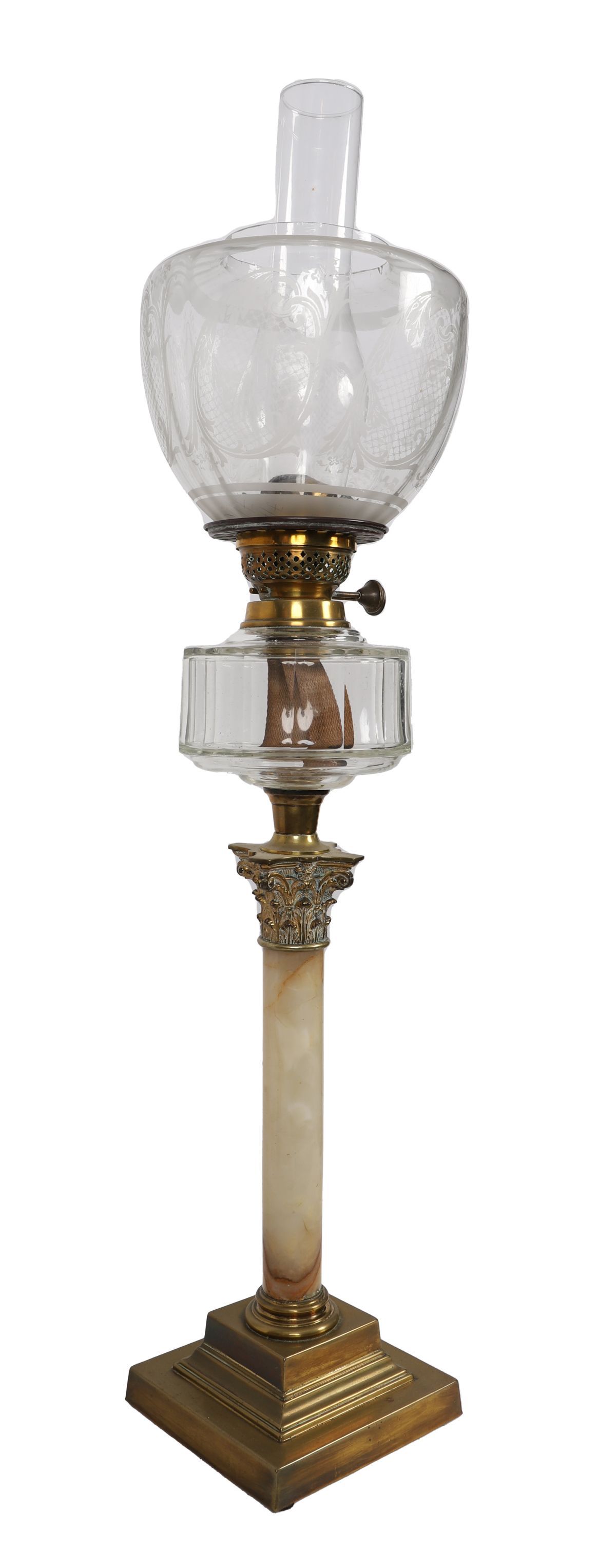 Lot 1206 19TH-CENTURY ALABASTER AND BRASS CORINTHIAN-PILLARED OIL LAMP