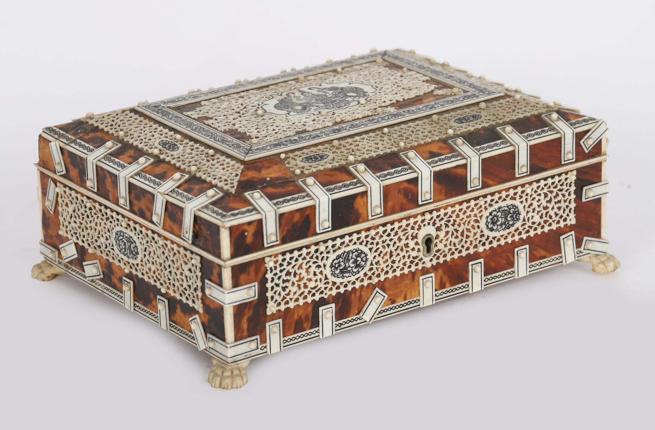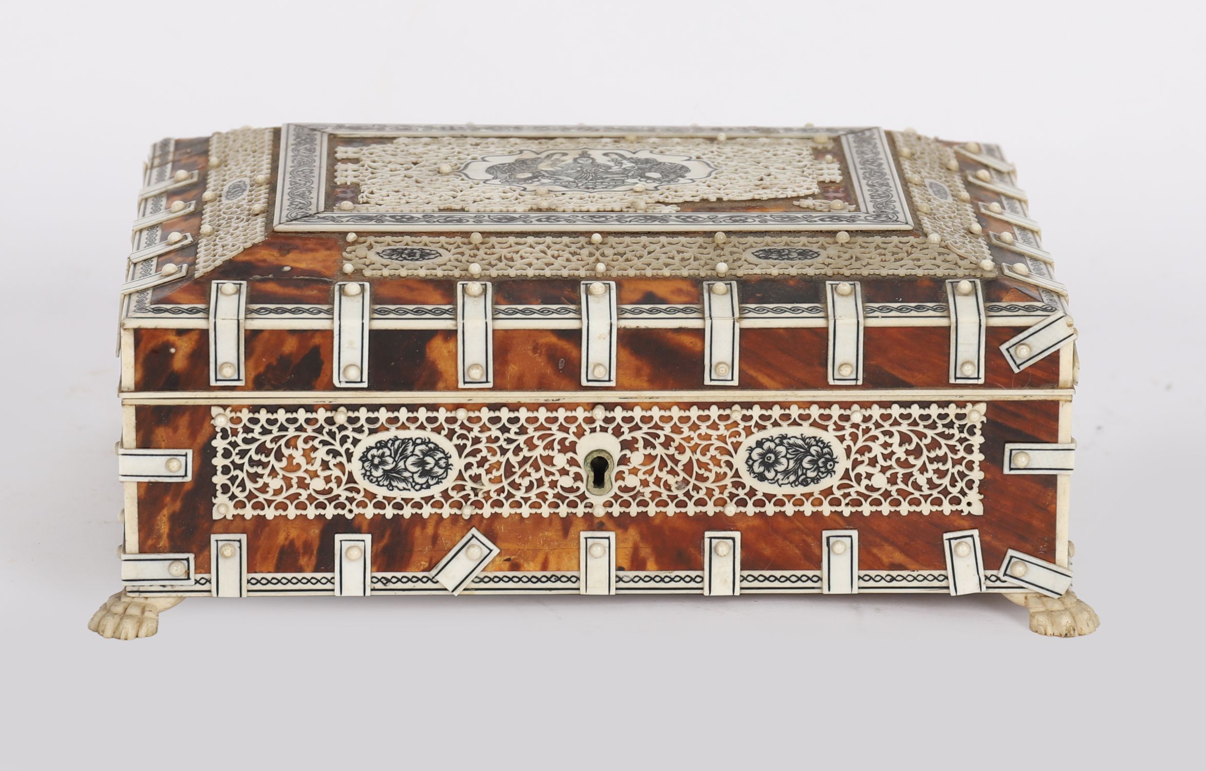 A 19th century Vizagapatam workbox, veneered in ivory and tortoiseshell, profusely decorated with intricate penwork designs and pierced ivory panels. The lid centred with an engraved cartouche depicting Britannia with lions and cornucopia, flanked by mythological figures. Raised on paw feet.