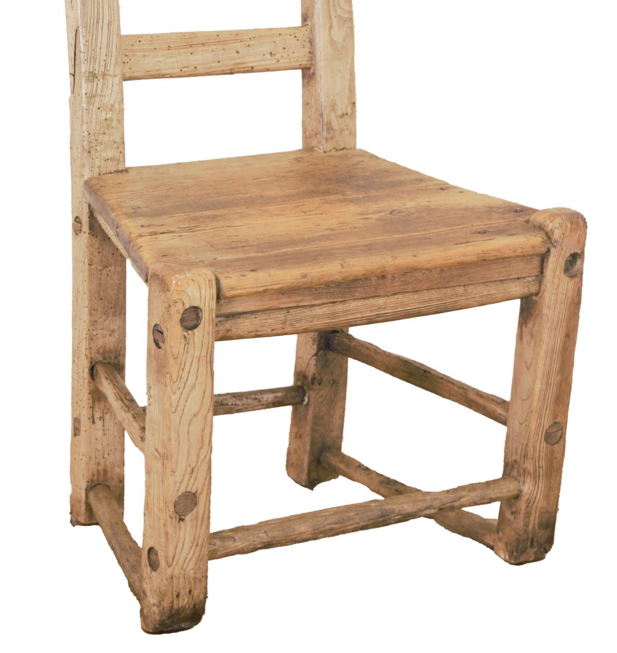 the railed back above a square frame seat once bound with straw rope (sugan), raised on square legs joined by stretchers; an authentic example of rural seating.