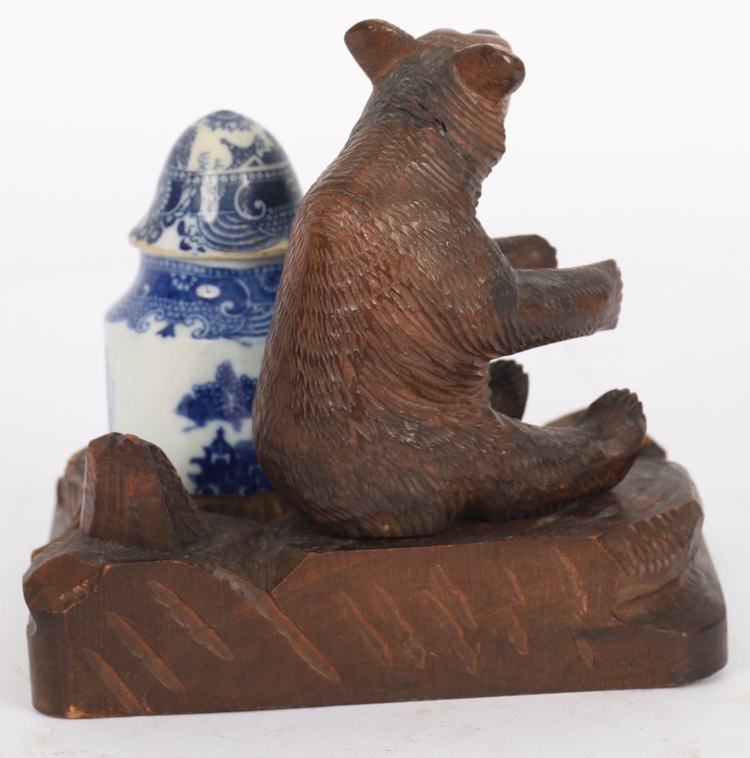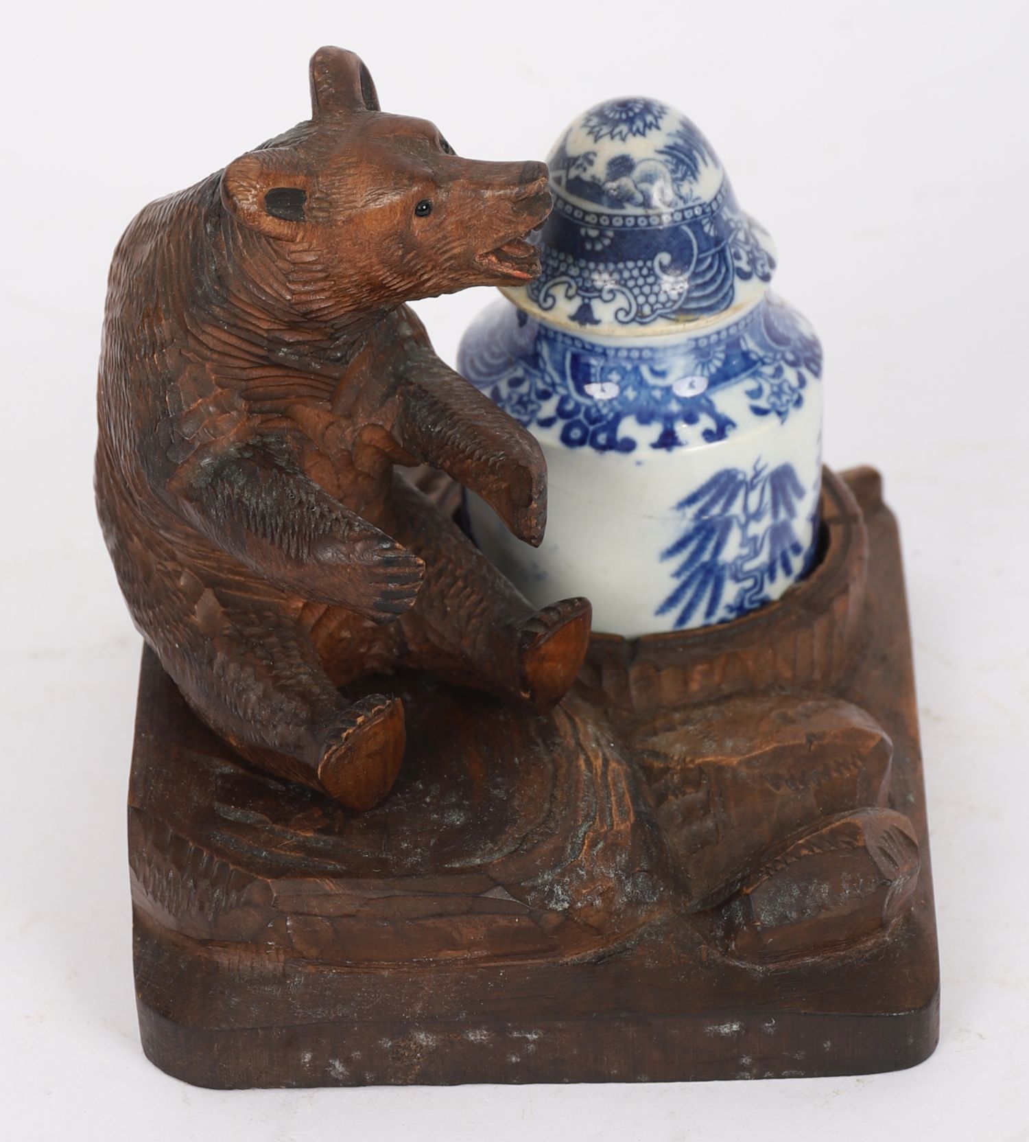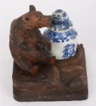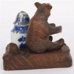Lot 497 19TH-CENTURY BLACK FOREST BEAR WITH BLUE AND WHITE URN