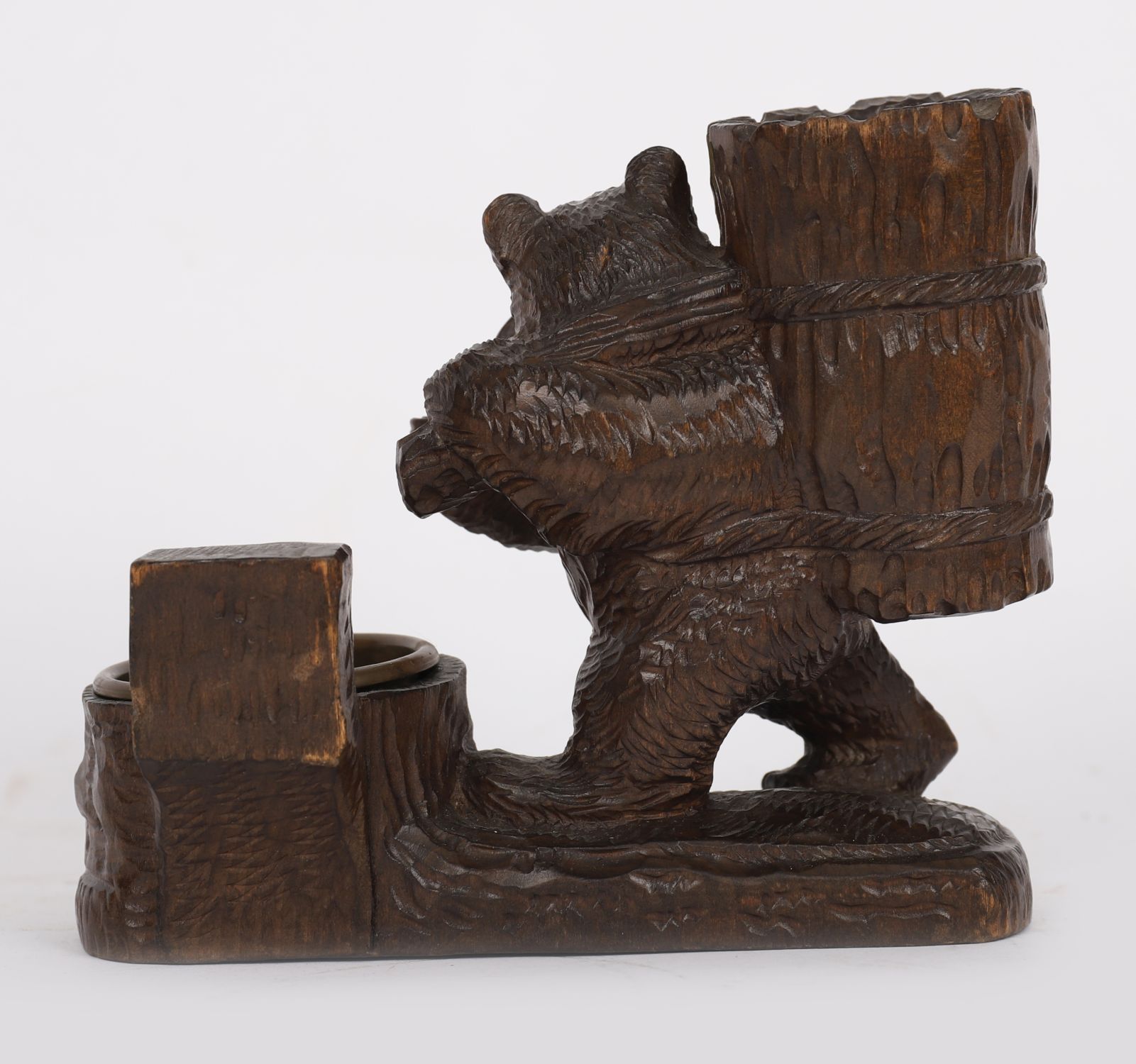 A 19th century Black Forest carved wooden bear, modelled upright holding a tree stump, fitted as an inkwell with brass liner. Detailed carving to fur and features, on an integral base.