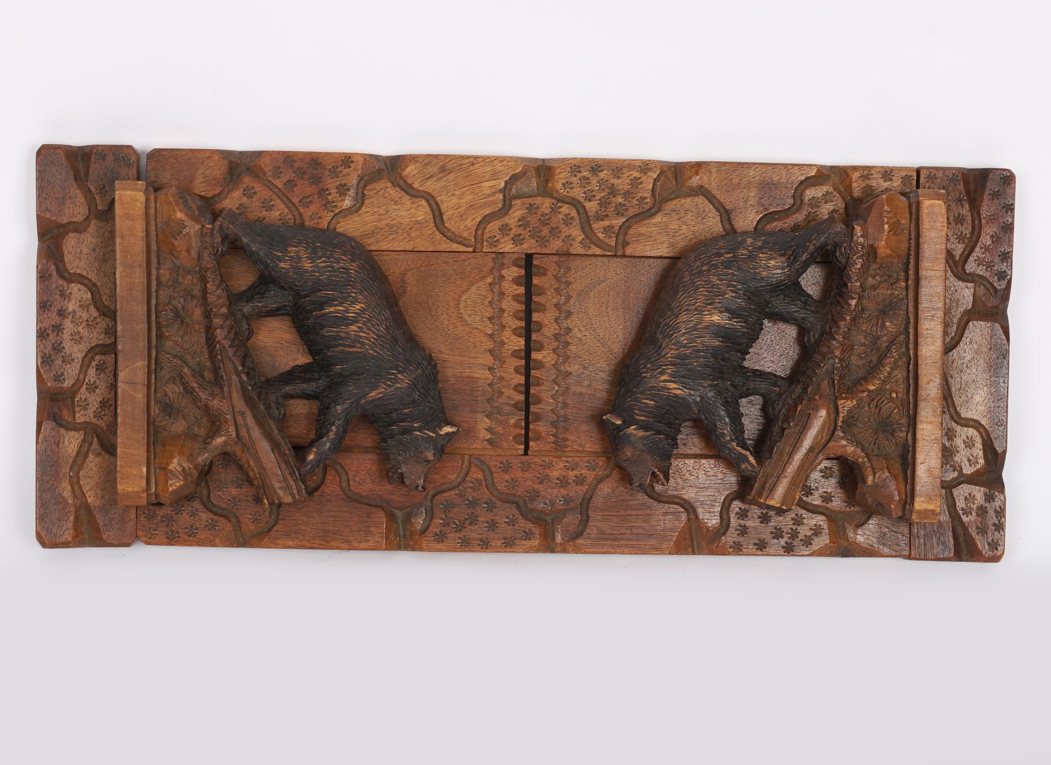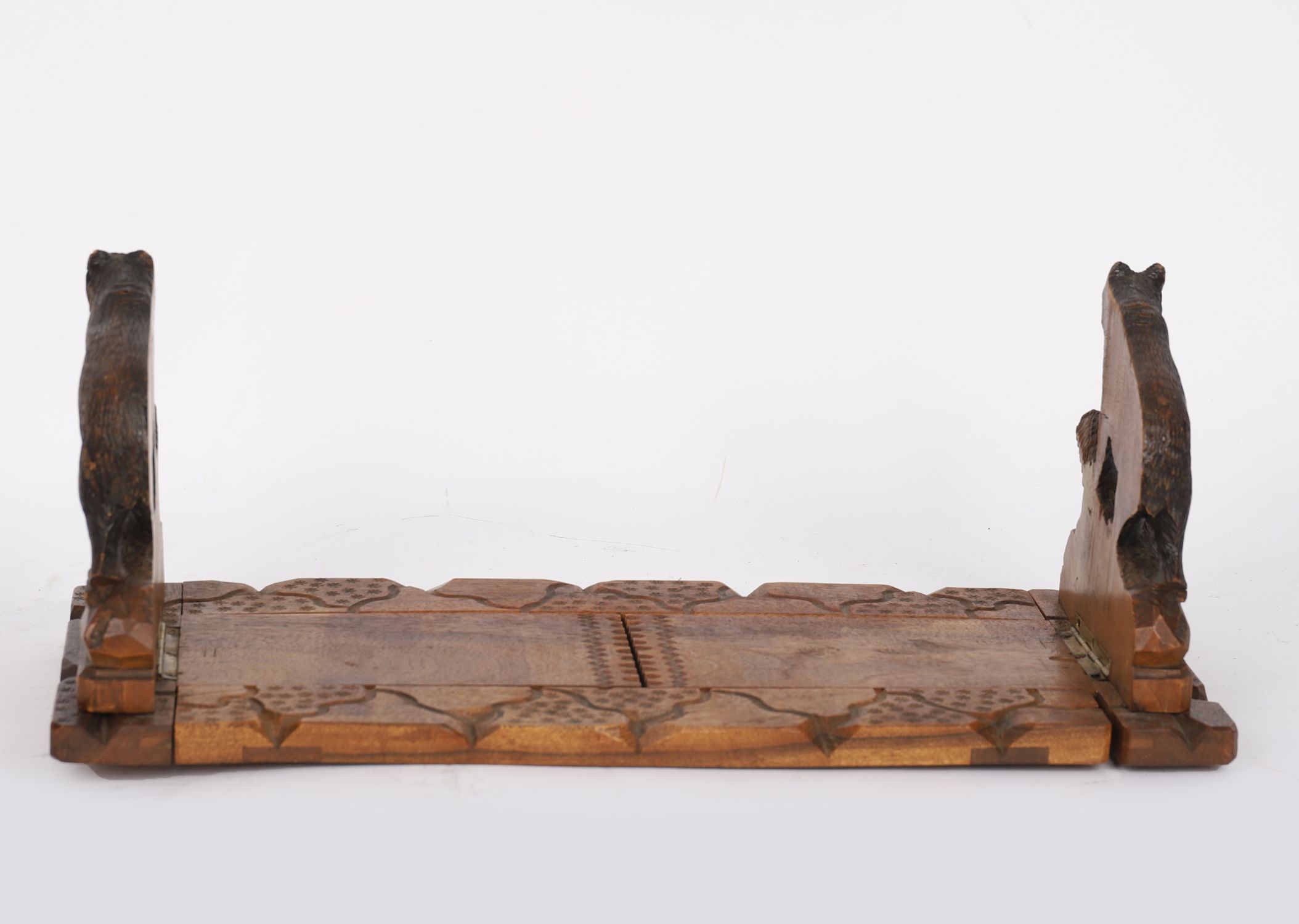 A 19th century Black Forest carved walnut book slide, each end finely modelled with bears climbing trees, carved with naturalistic detail. The base decorated with chip-carving and foliate patterns, with sliding action to extend or contract.