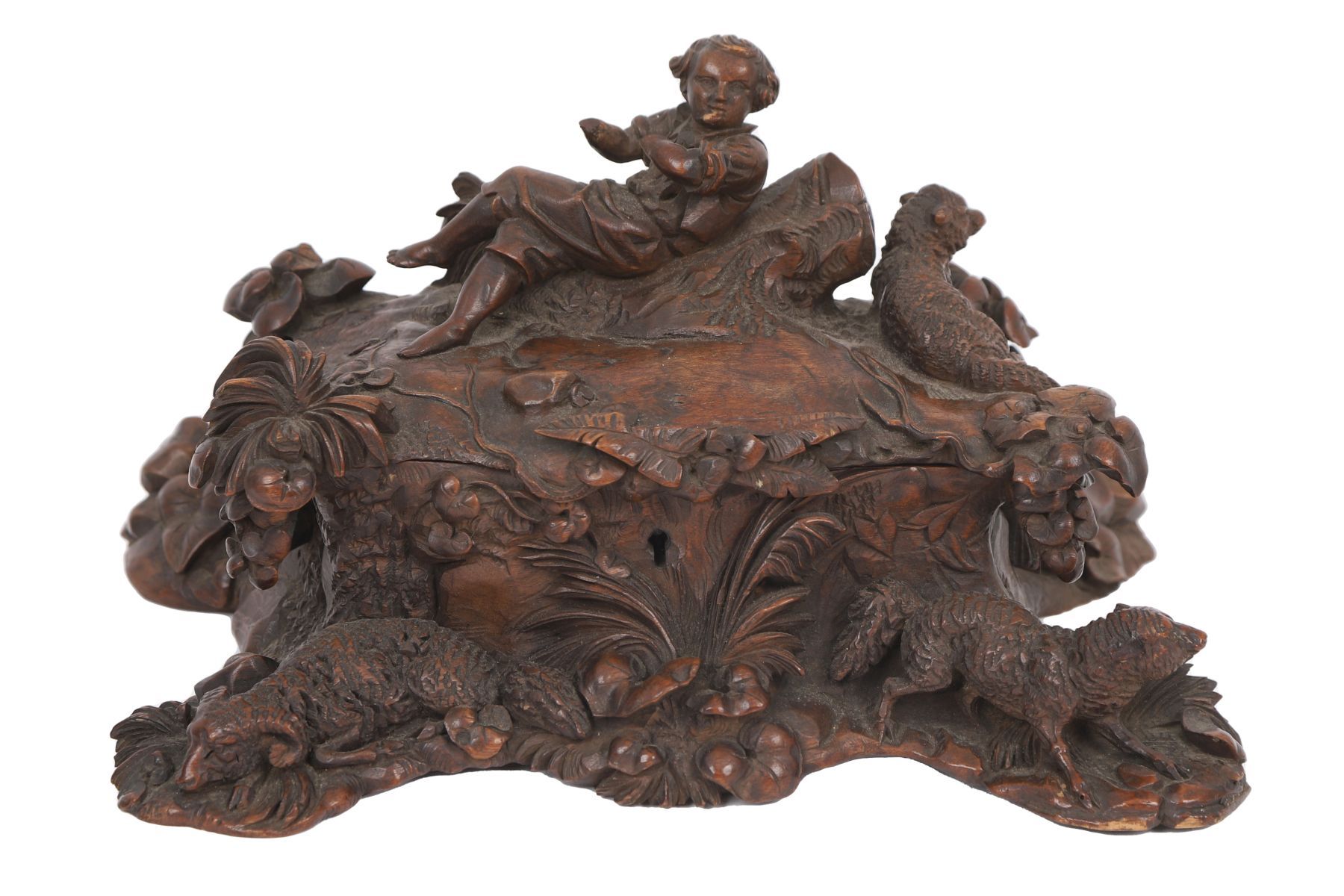 A finely carved Black Forest wooden group depicting a reclining child figure amid naturalistic foliage and animals, executed with deep relief and expressive detail.