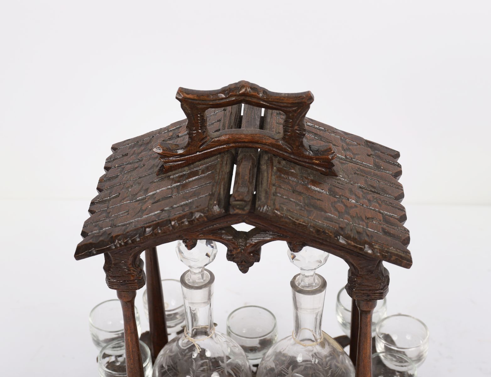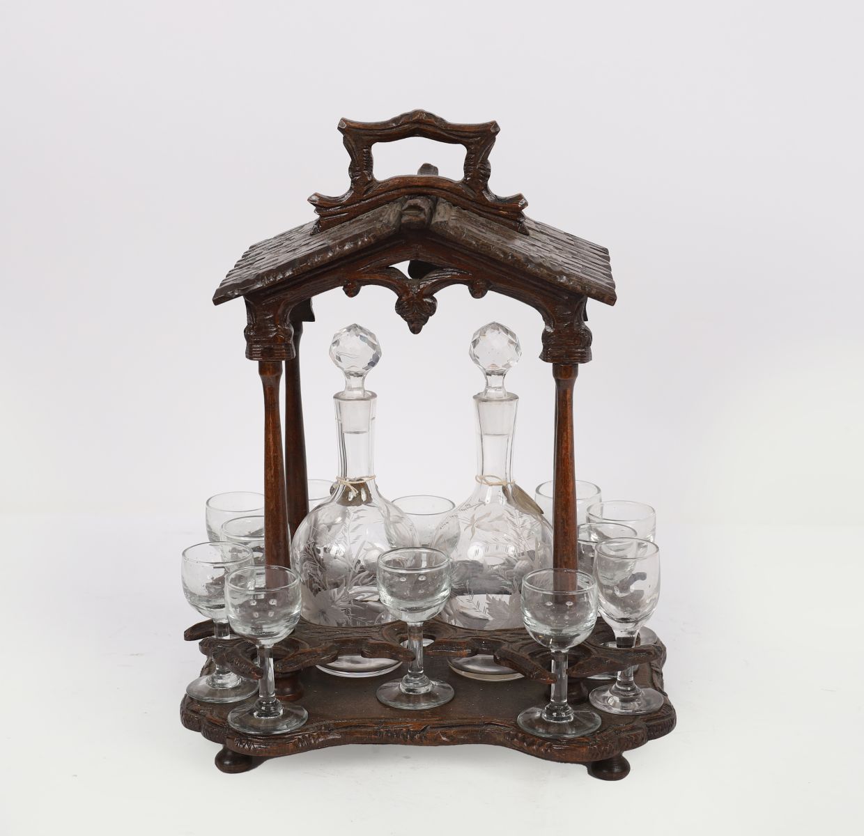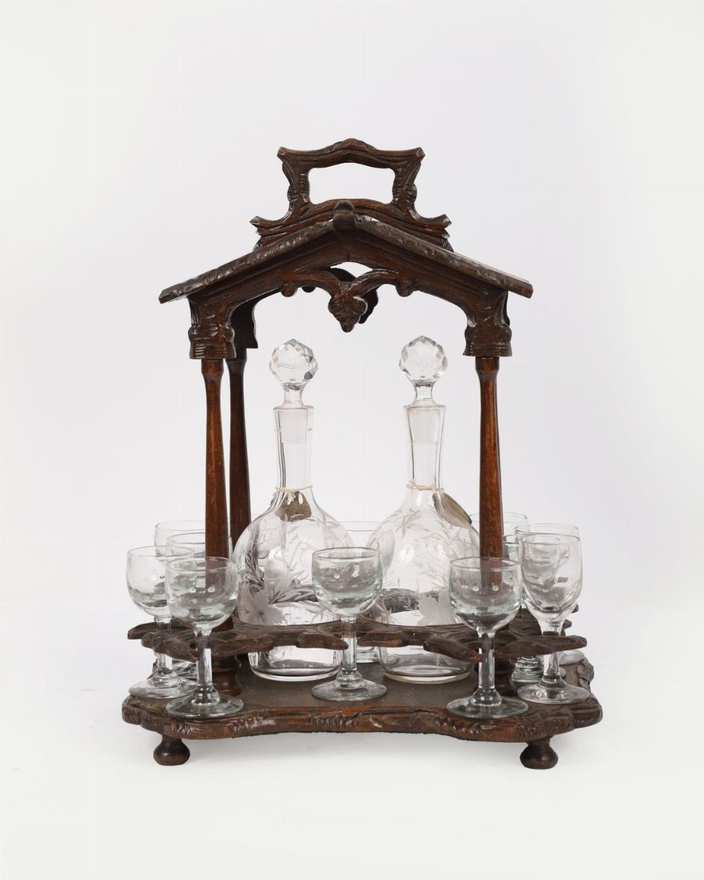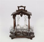 A finely carved Black Forest oak tantalus, the architectural frame enclosing three cut-glass decanters with stoppers and six small liqueur glasses on a shaped base. The decanters etched with foliate designs.