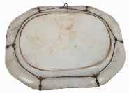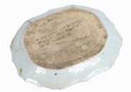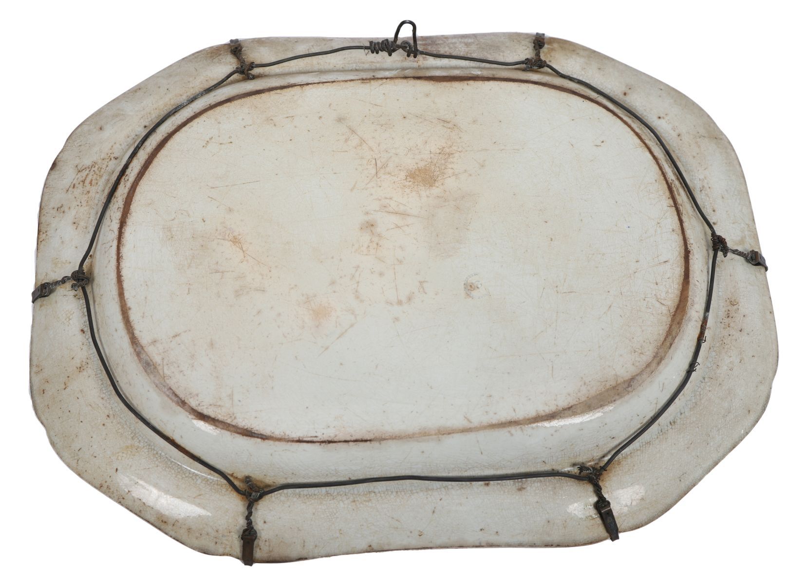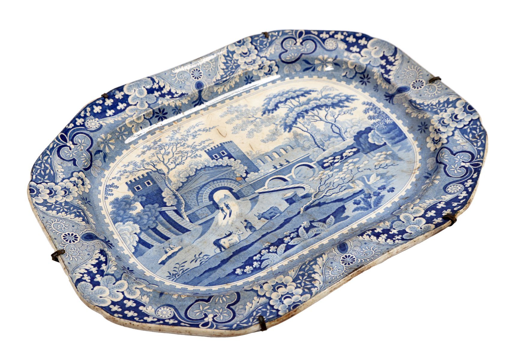 Of oval form, printed with a classical landscape scene centred on a bridge and fortified gateway, within a dense floral and foliate border, the reverse fitted with wire hangers.