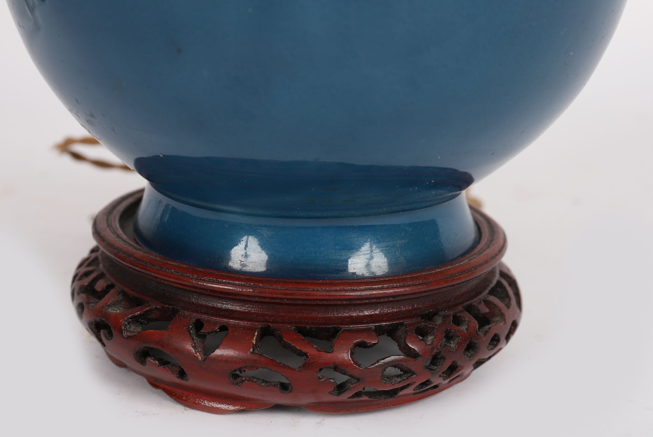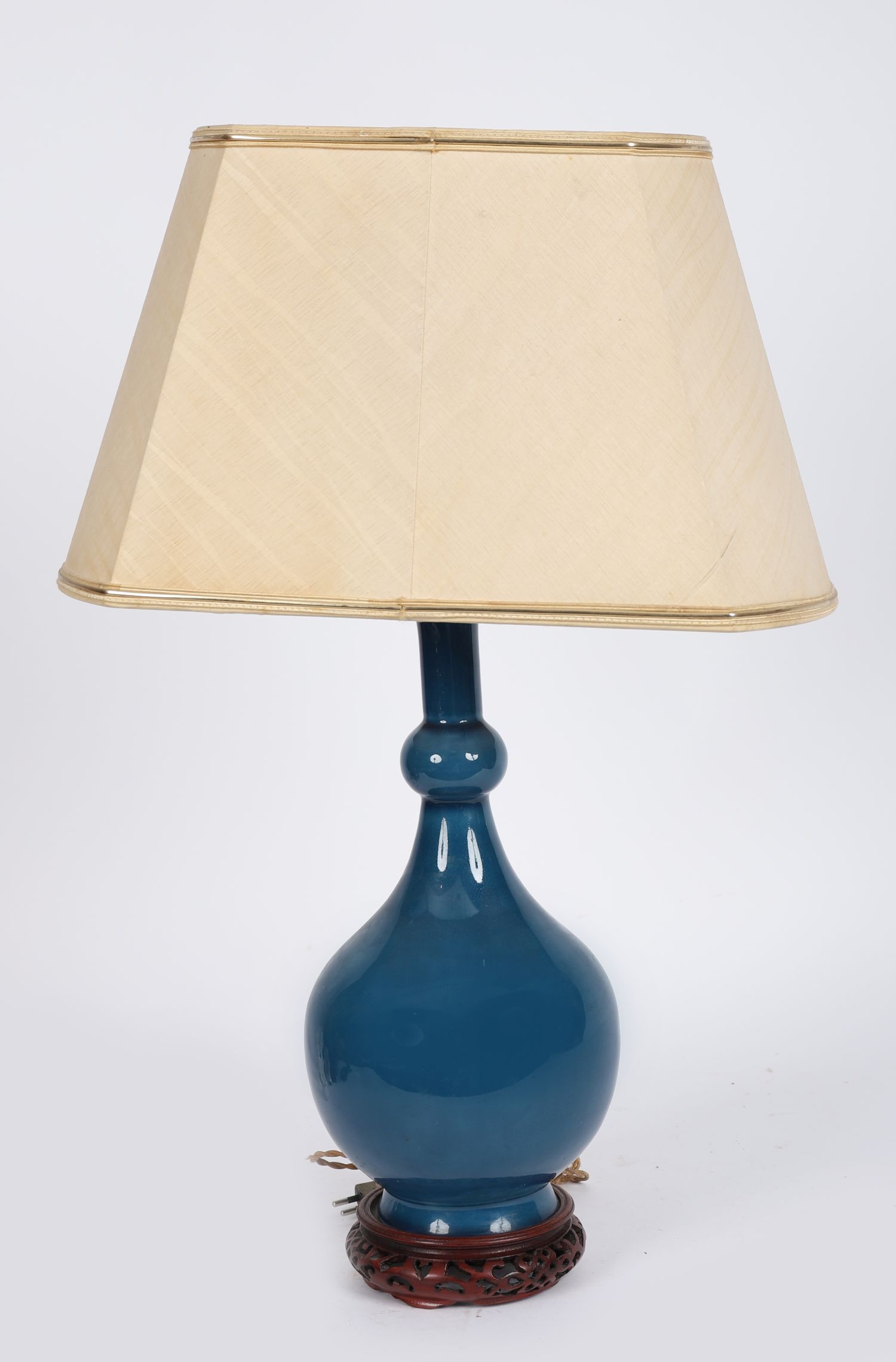 A baluster-form blue glazed ceramic table lamp, the body of rich cobalt hue, raised on a carved and pierced hardwood stand. Fitted with a cream fabric shade and electrical fittings.