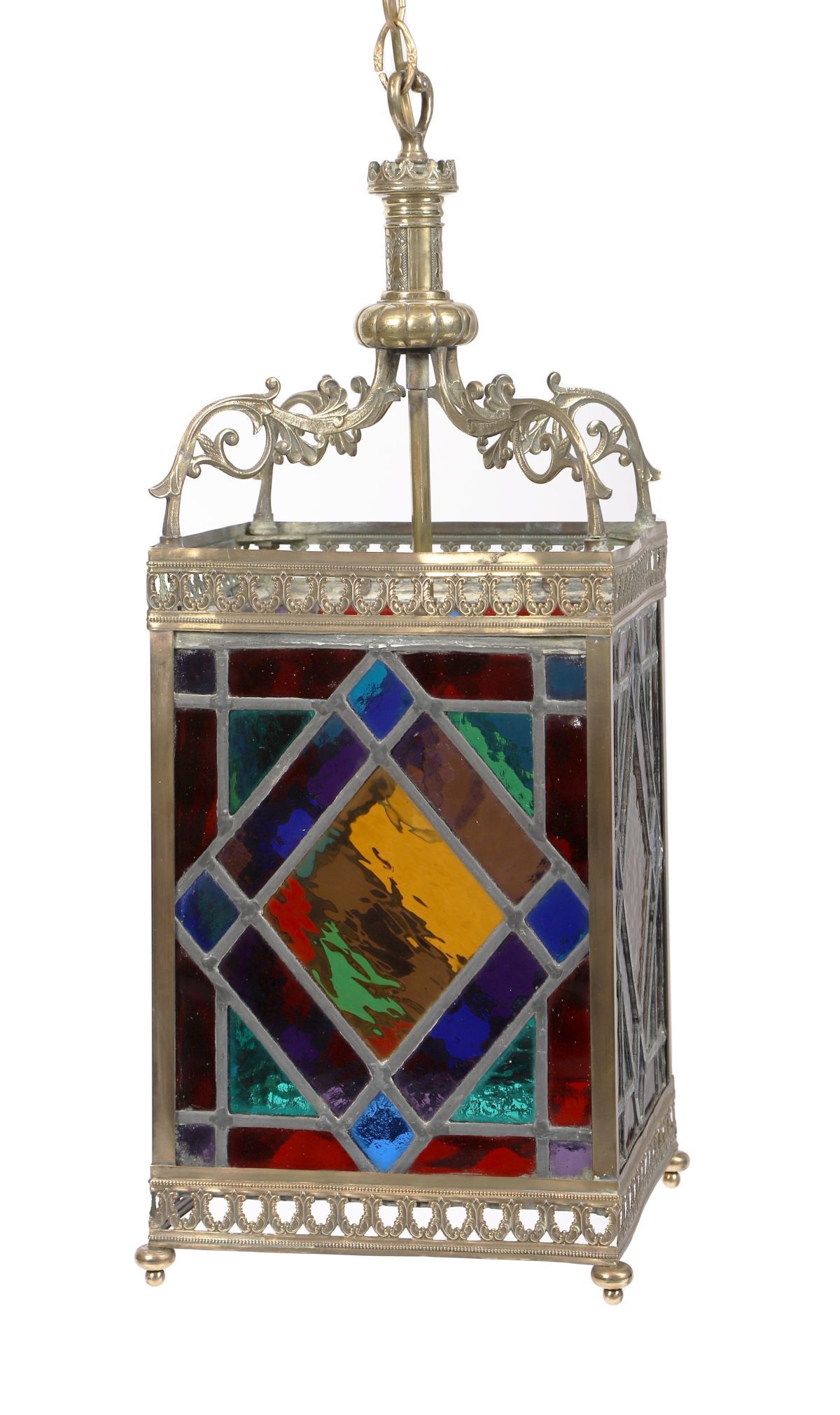 A square hall lantern of brass construction with leaded glass panels, the frame of architectural form, originally intended for ceiling suspension.