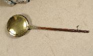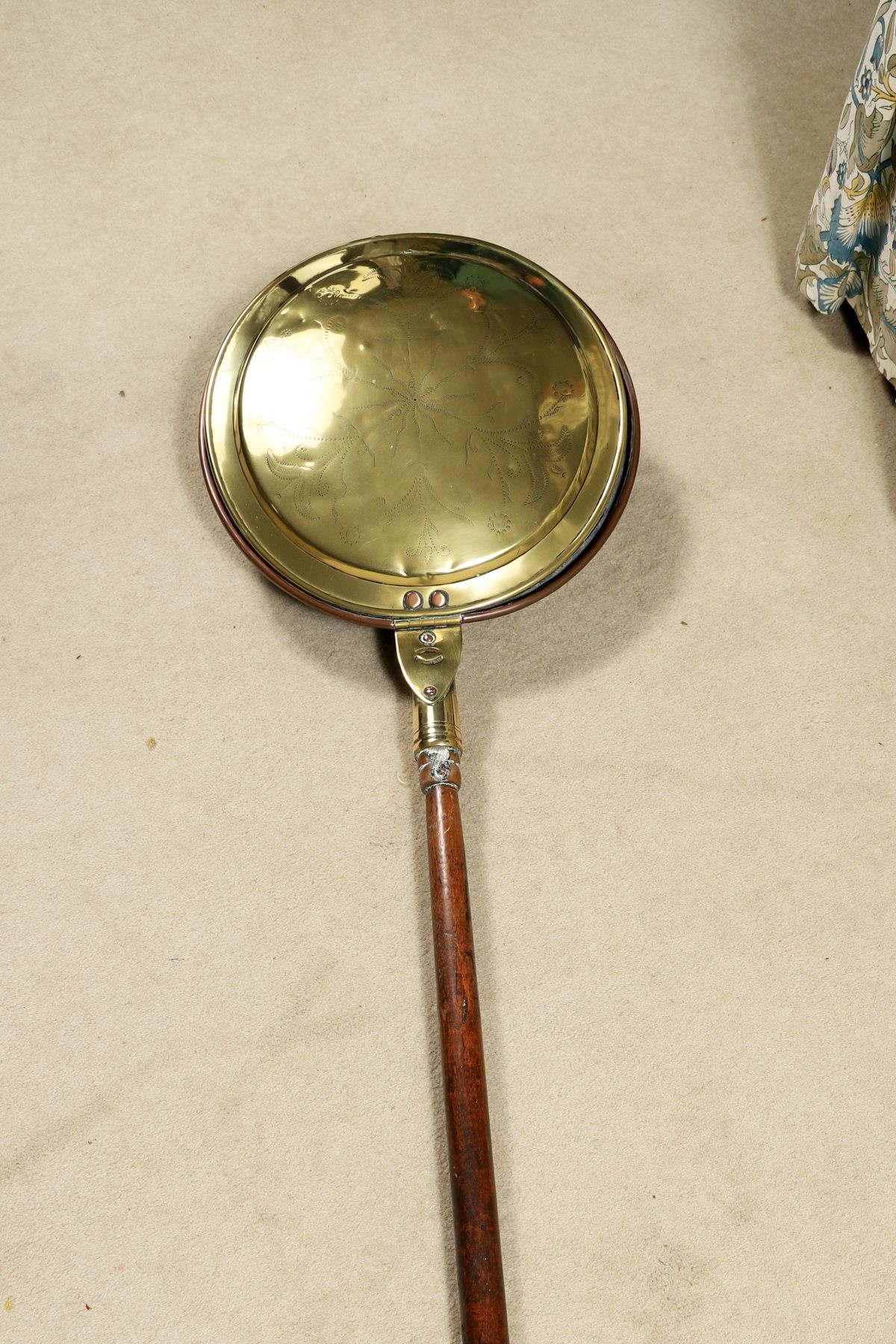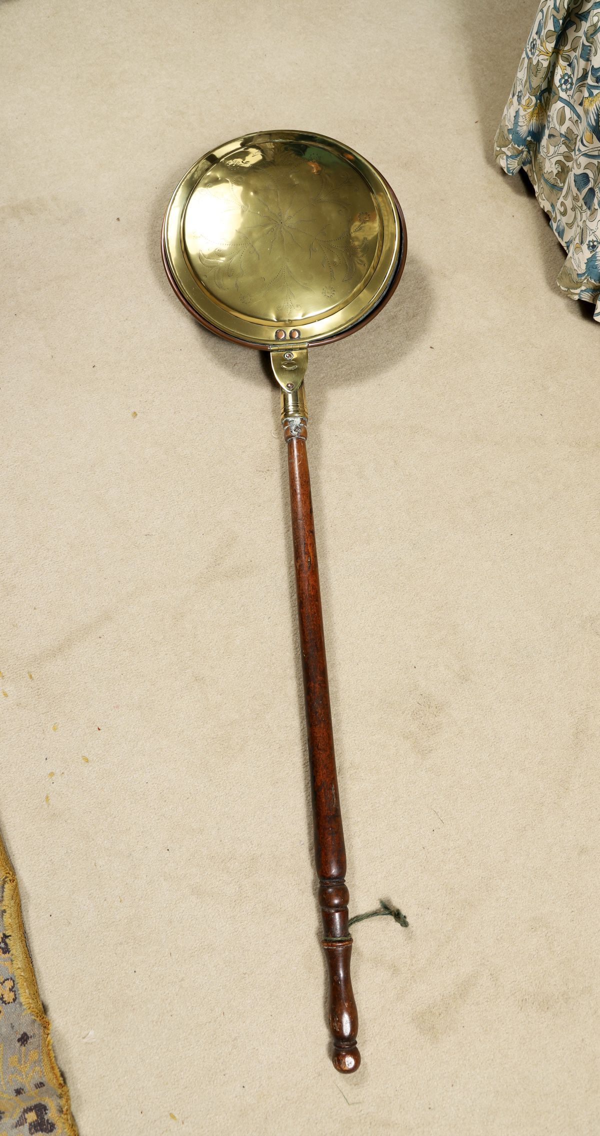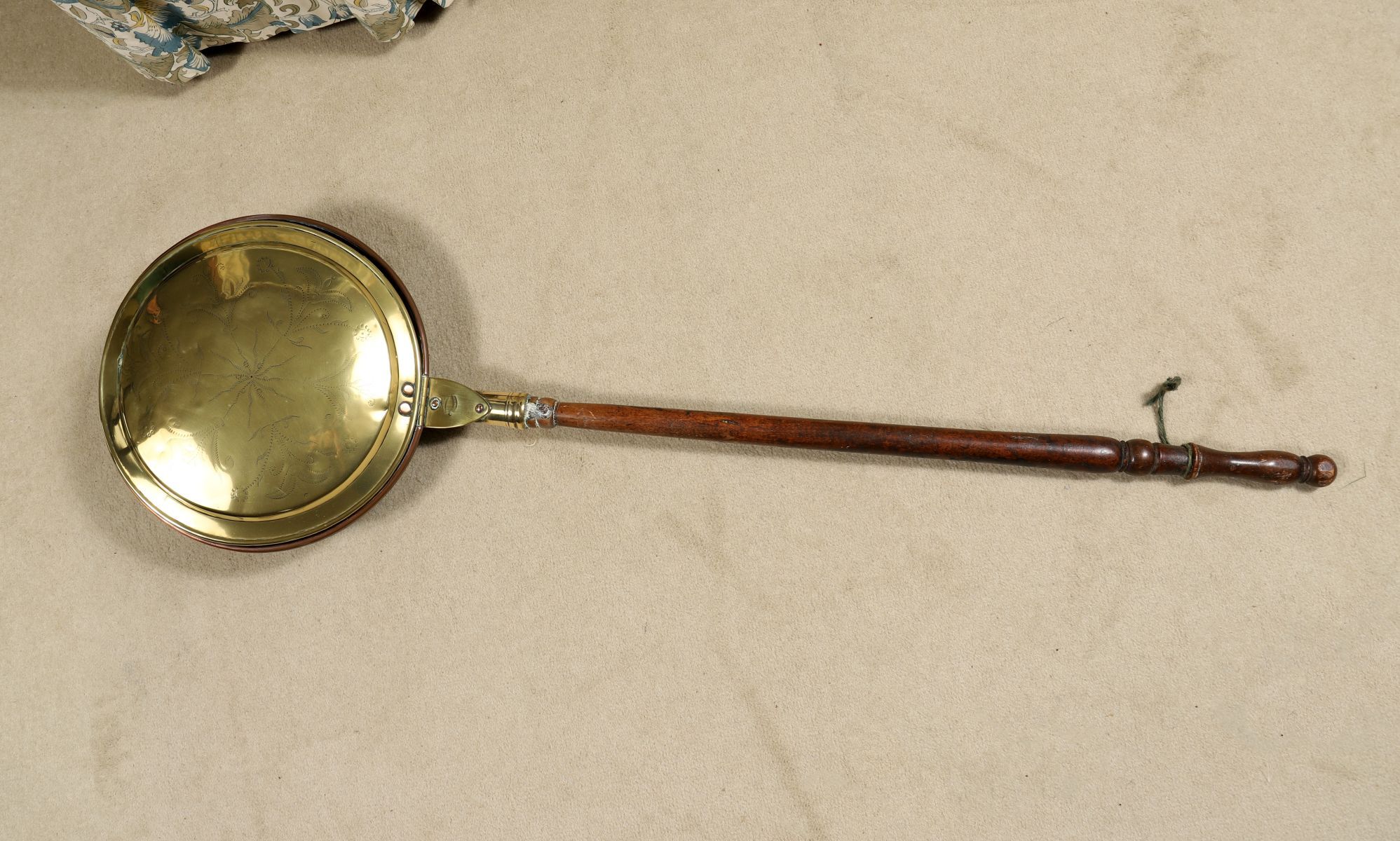 With circular hinged pan decorated with engraved floral motifs, fitted with a long turned wooden handle and brass collar.