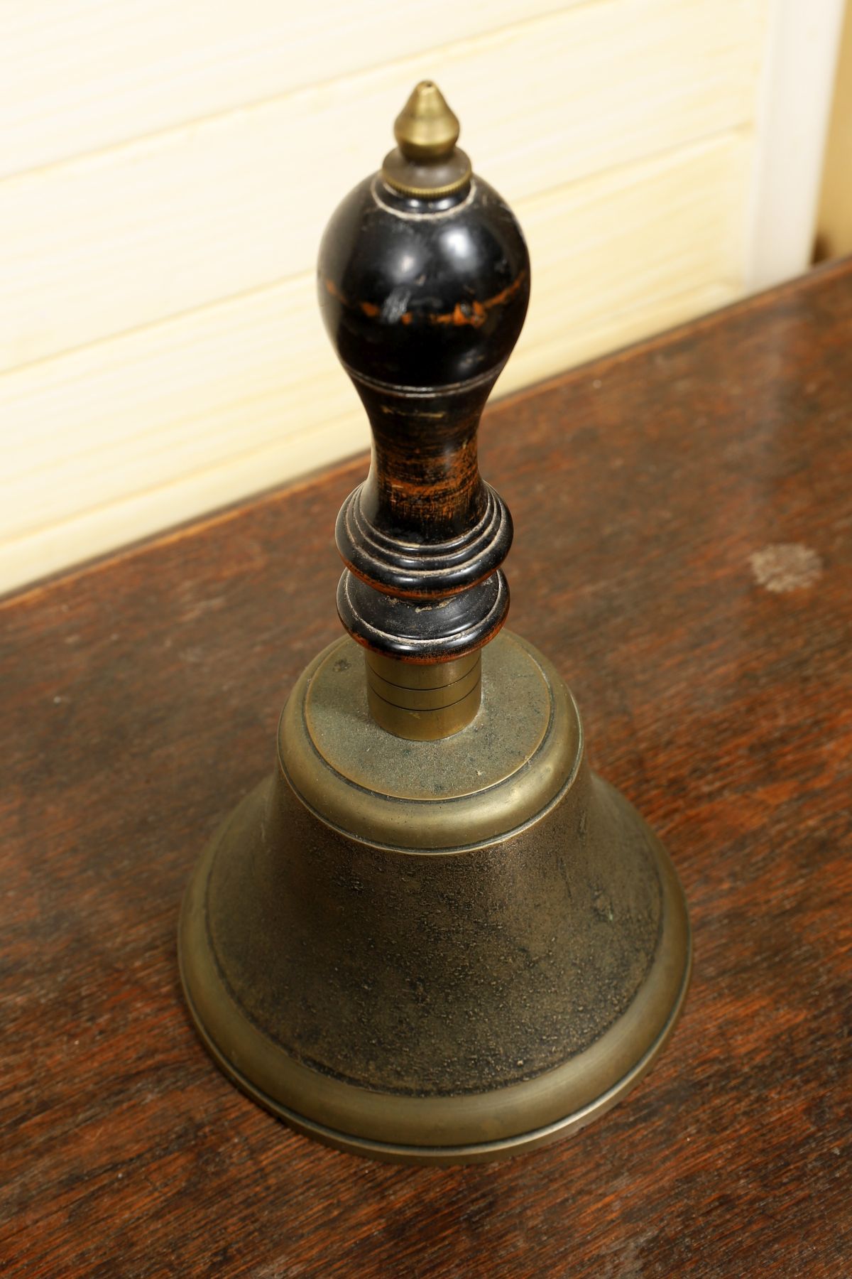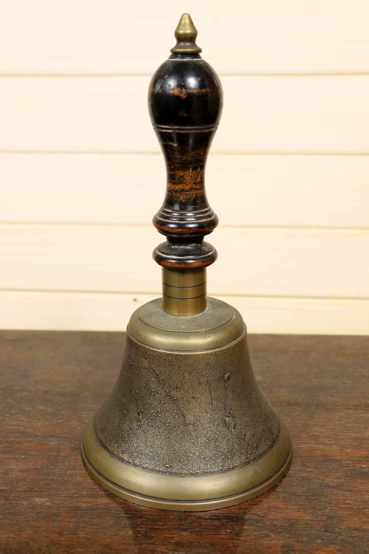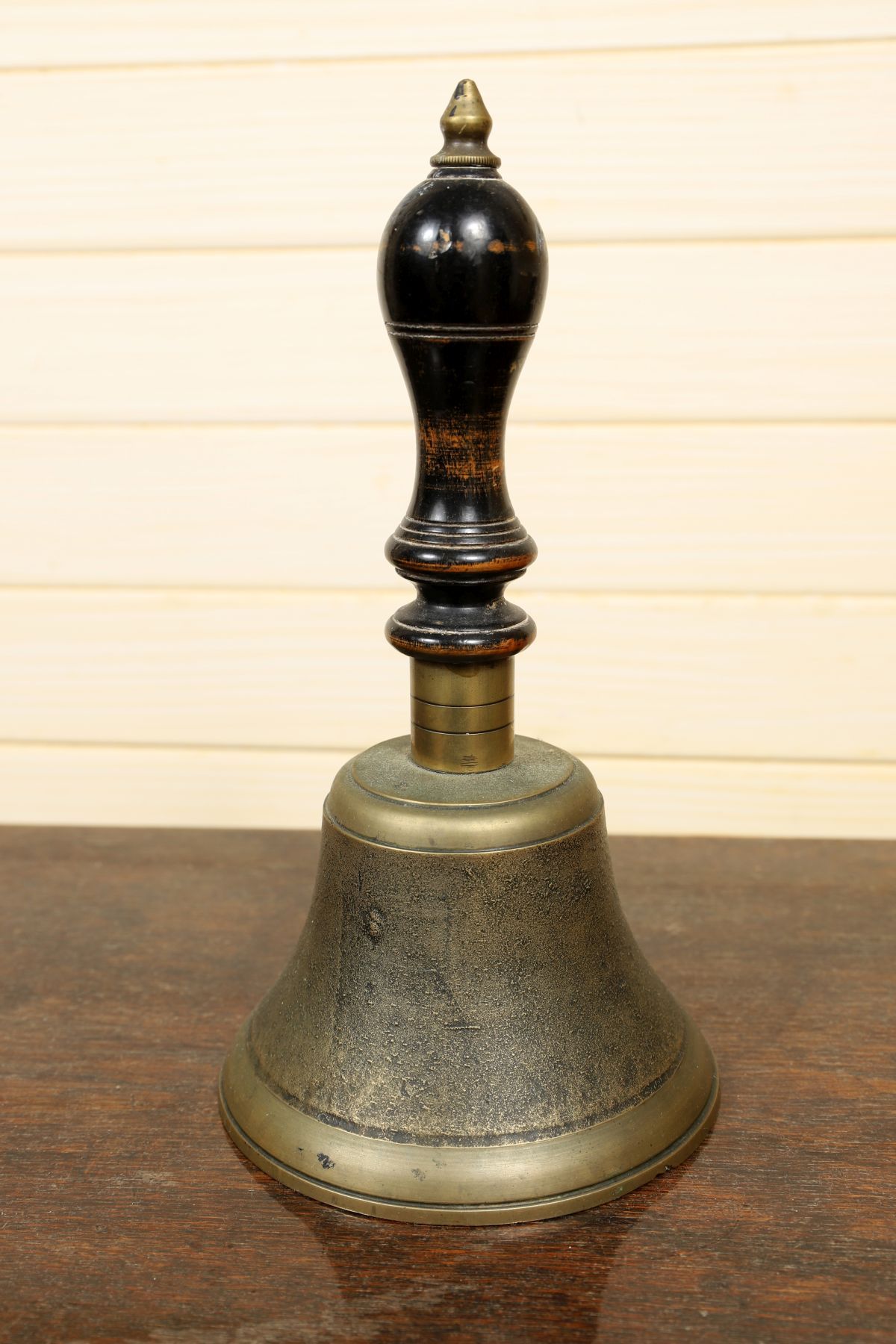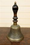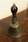 A 19th-century brass hand bell, with turned handle above a flared bell body, the surface showing wear and patination. 19th century.