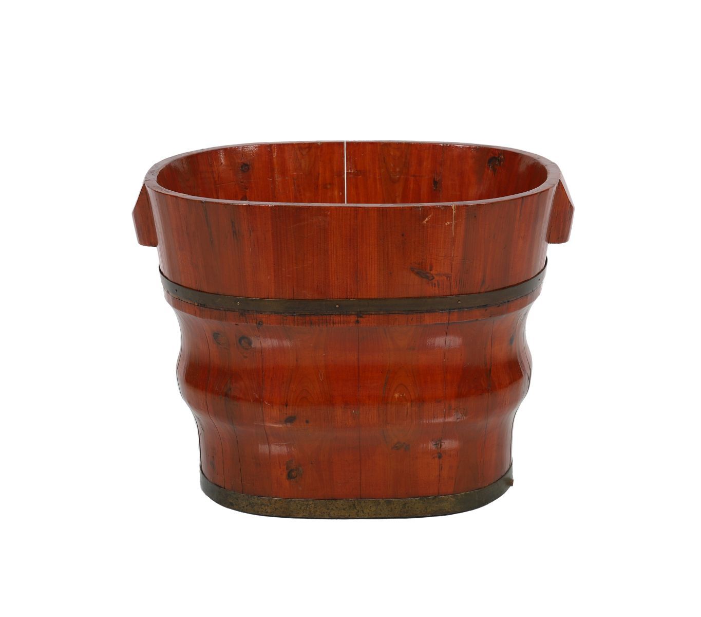 Of coopered construction with brass bands and shaped sides, the fruitwood showing a rich mellow patina.