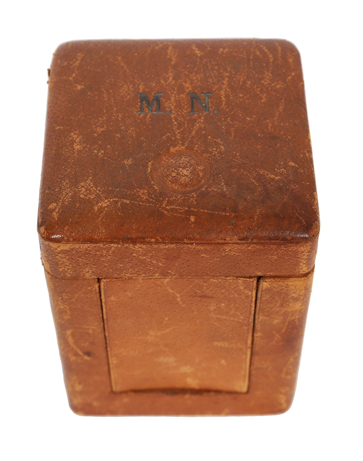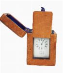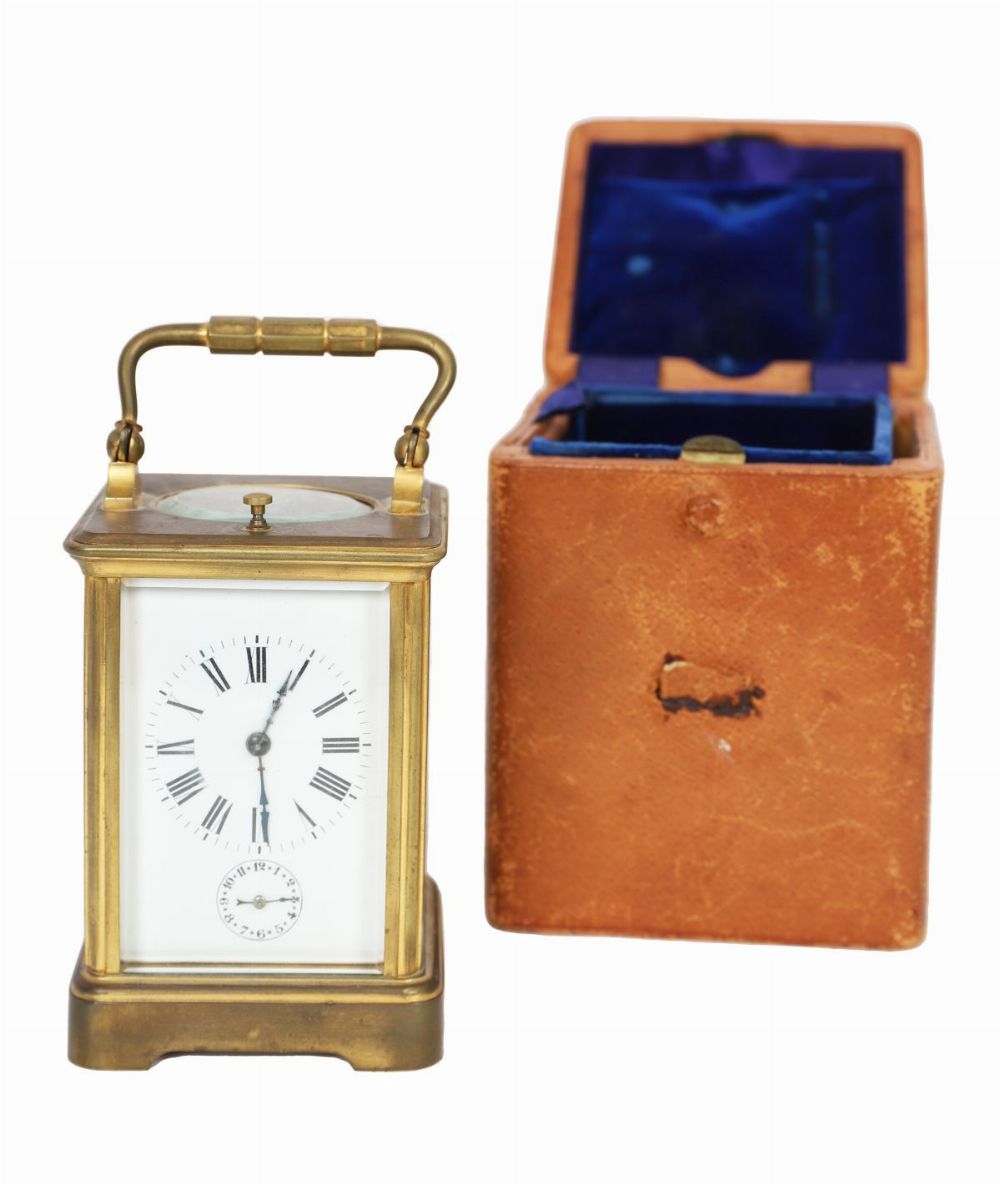 Rectangular brass case with swing handle, white enamel dial with Roman numerals and subsidiary seconds dial, the movement striking on demand. Presented in its fitted leather travelling case.