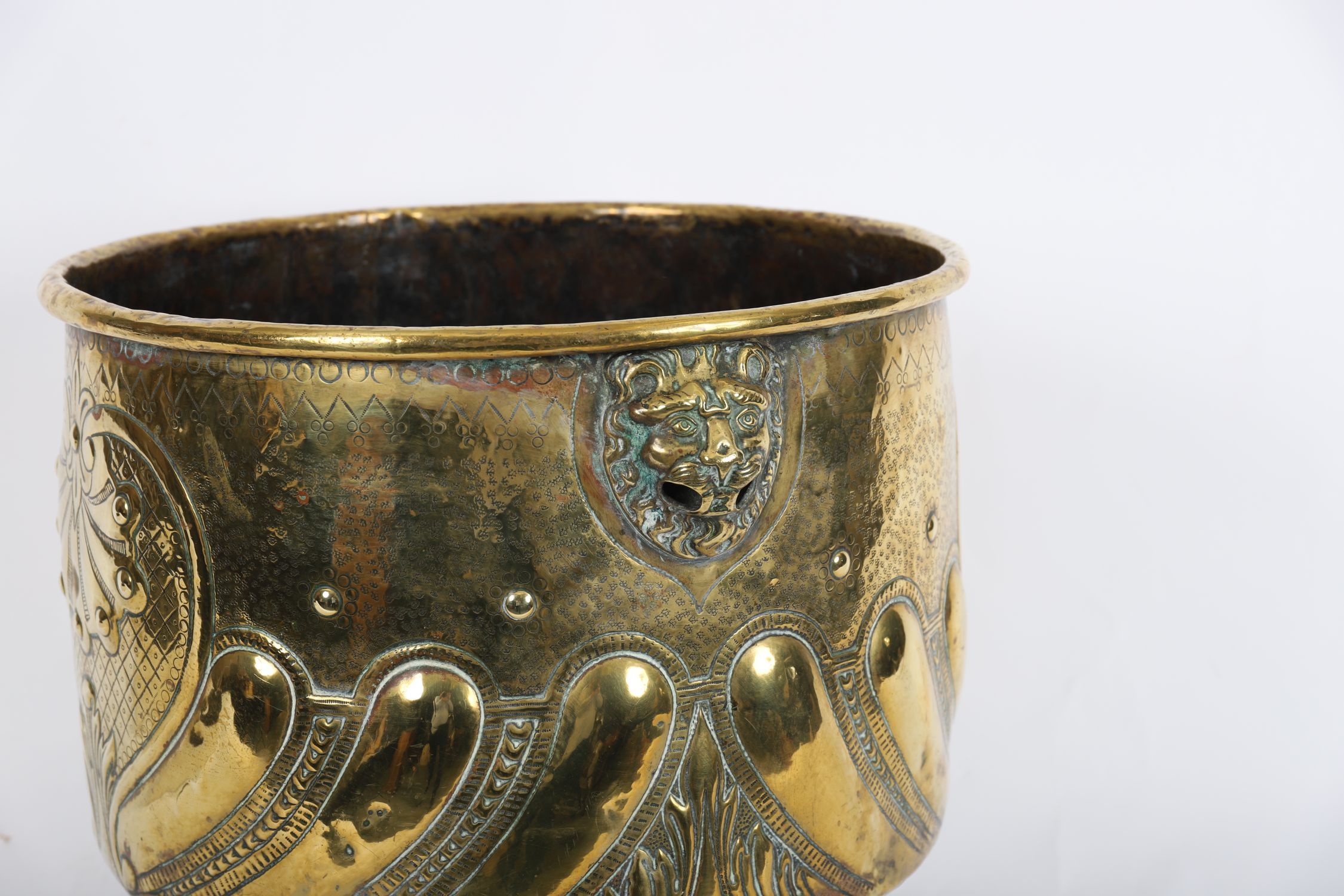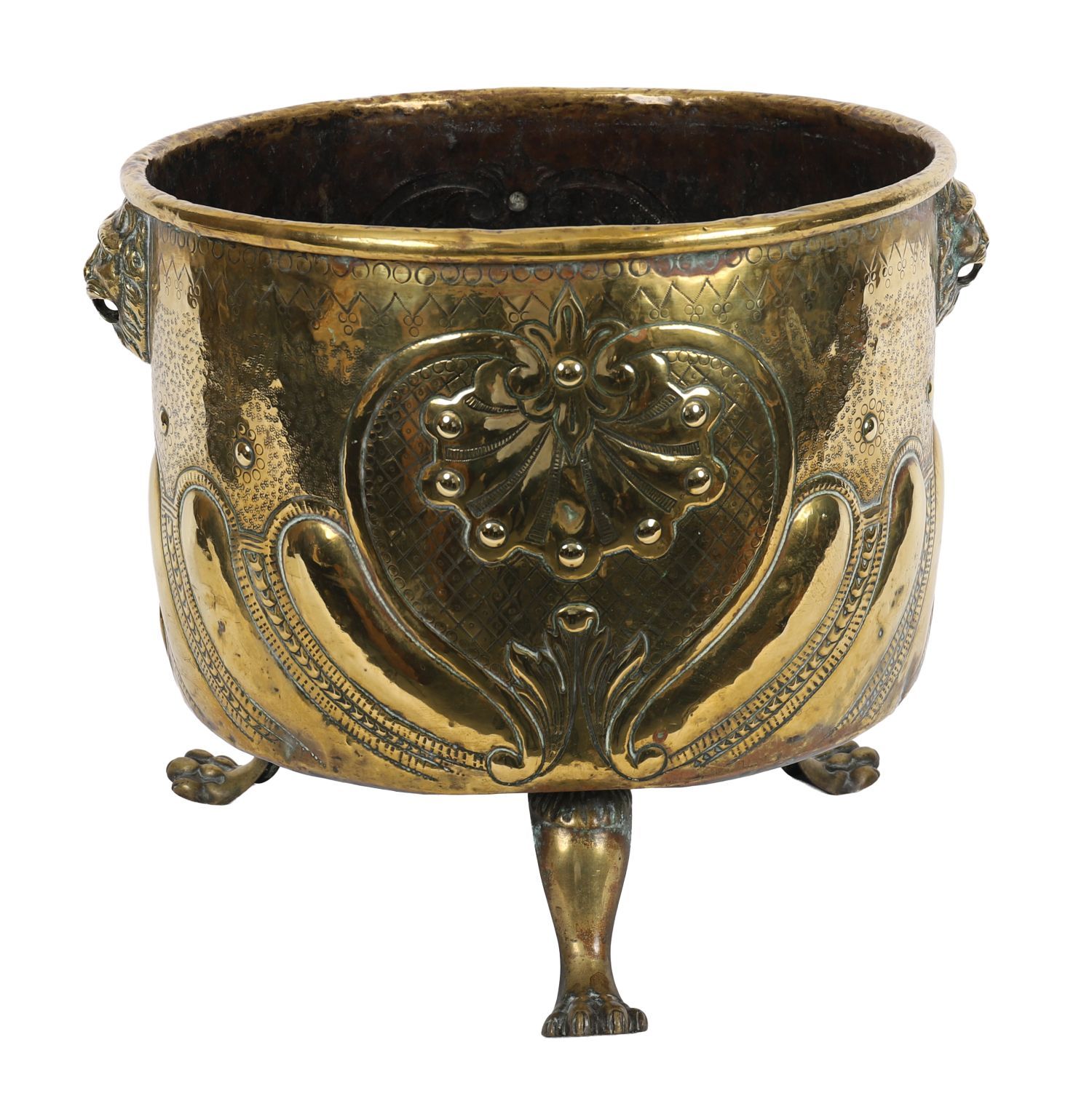 A 19th century brass jardinière of circular form, embossed with scrolling motifs and stylised flowers, raised on paw feet with lion mask ring handles. Retains a warm polished patina.